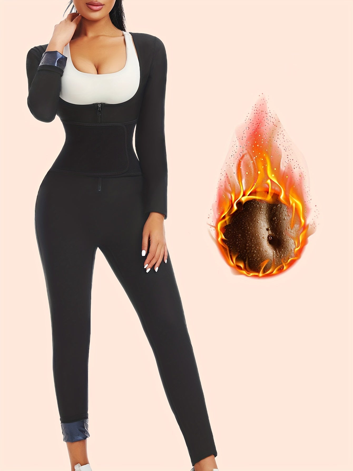 "Женский комбинезон с длинным рукавом для сауны черного цвета, корсет для контроля живота с молнией, стройнящий корректор фигуры для фитнеса и бега, смесь полиэстера и эластана"