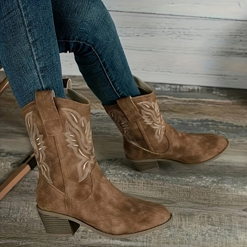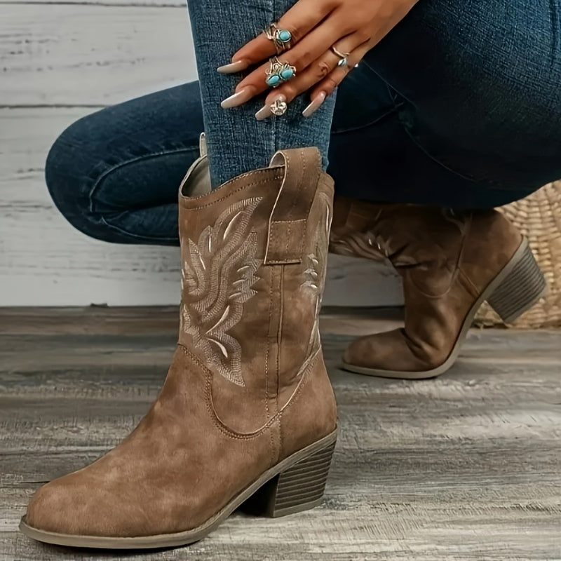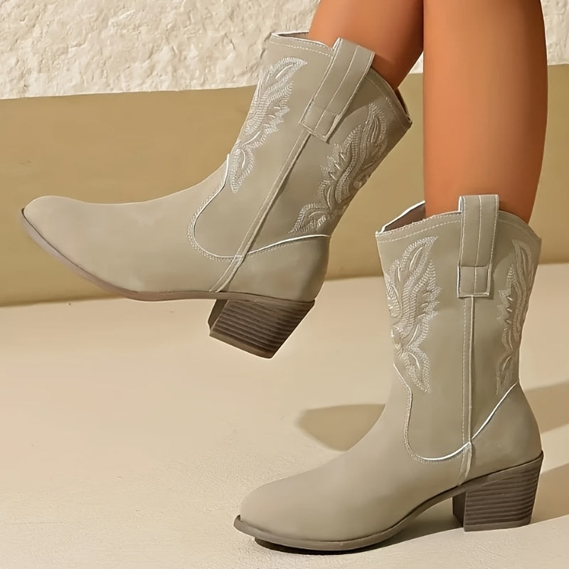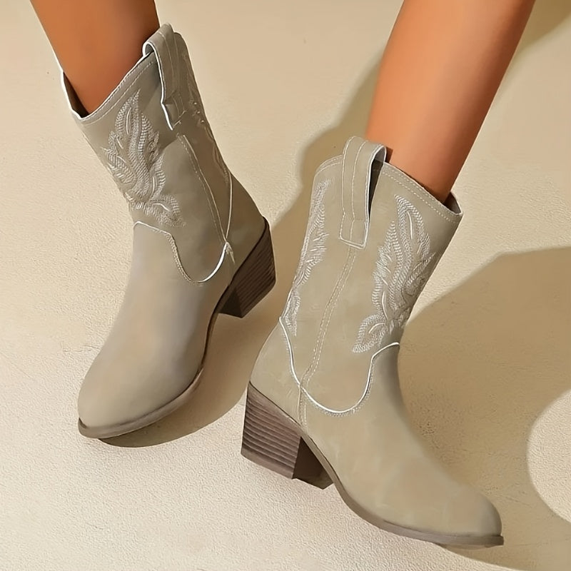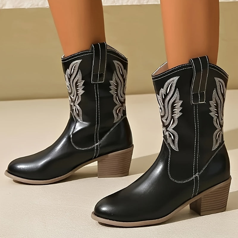 Женские сапоги-ковбои до середины икры с заостренным носком и массивным каблуком, кожаные, всесезонные