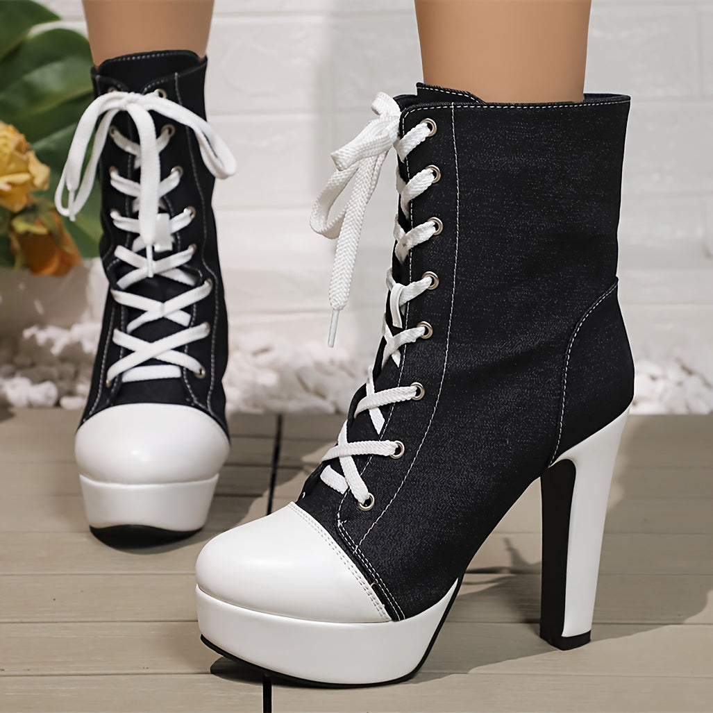 Женские демисезонные ботинки из денима до середины икры, повседневные, однотонные, с круглым носком, шнуровкой, резиновой подошвой