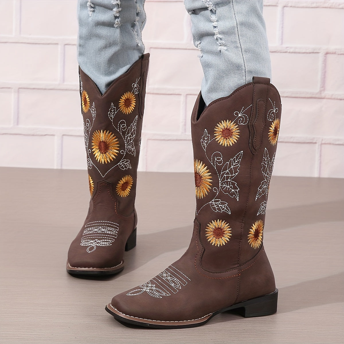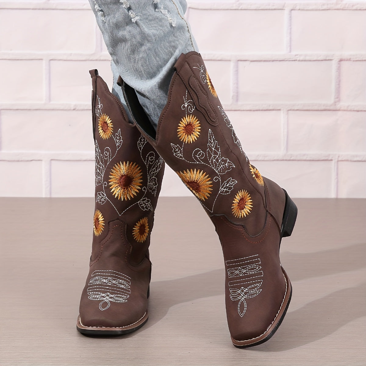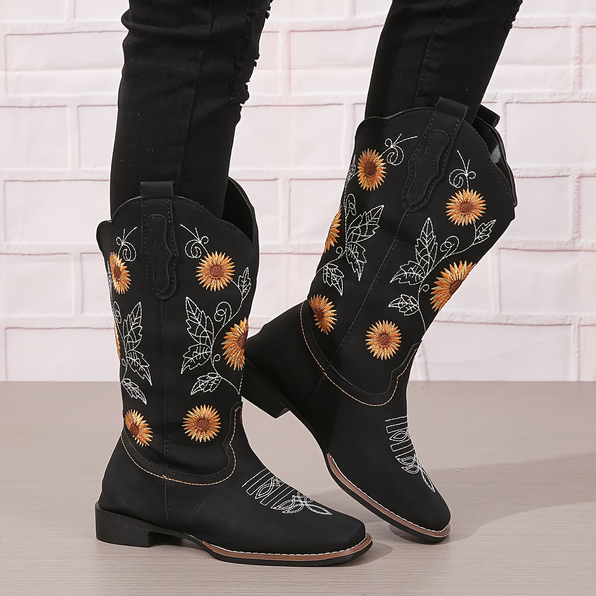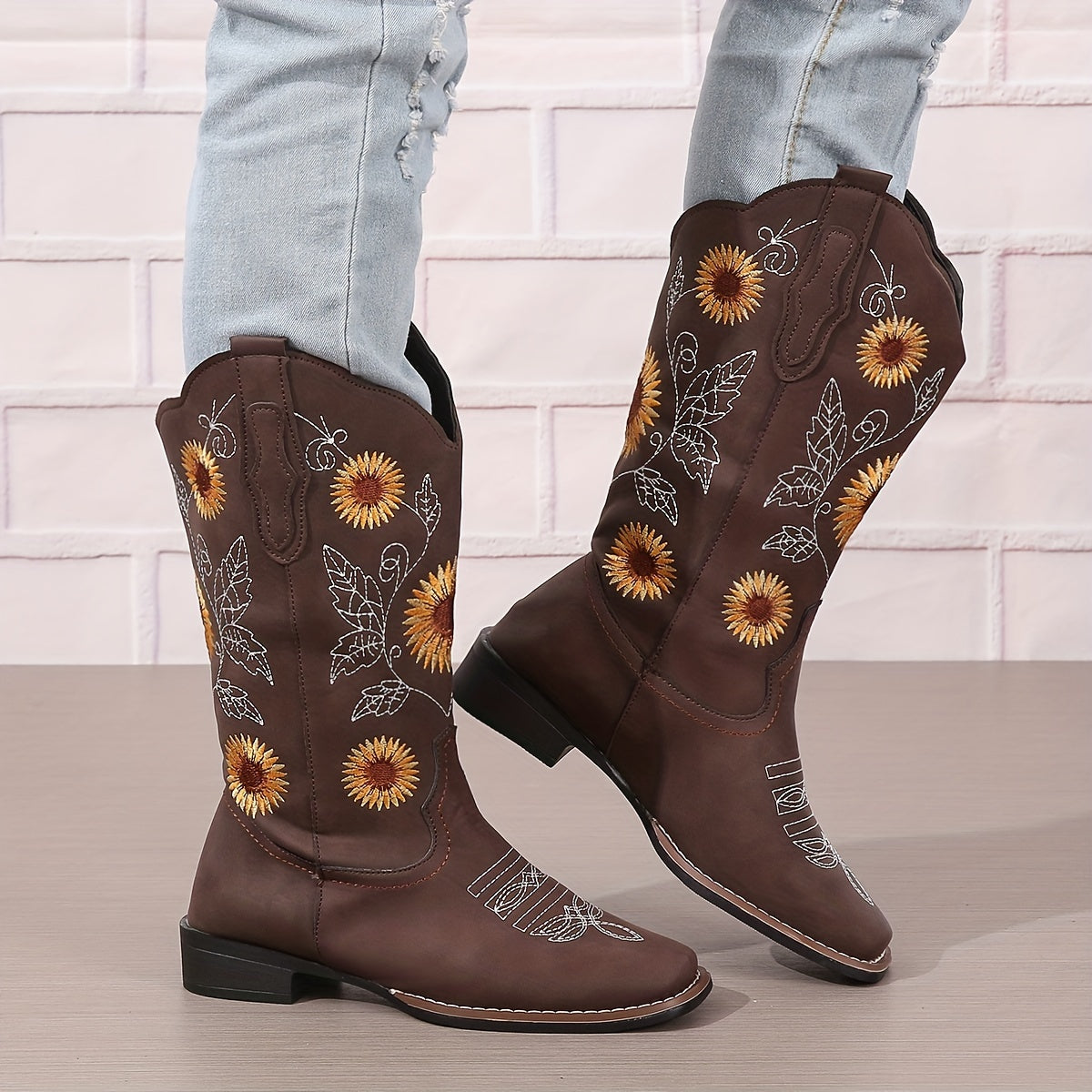 Женские сапоги вестерн до середины икры с вышивкой, молния, обувь