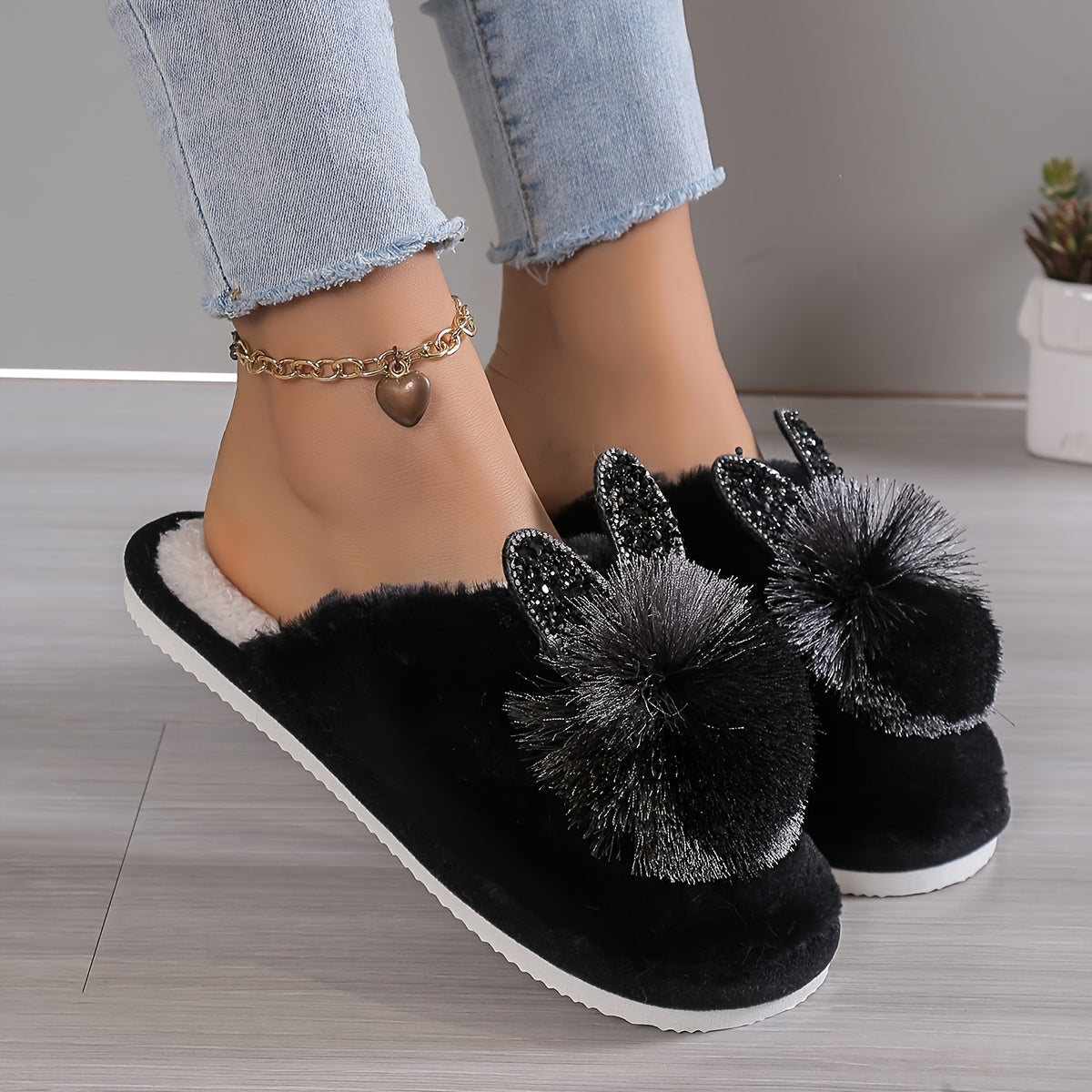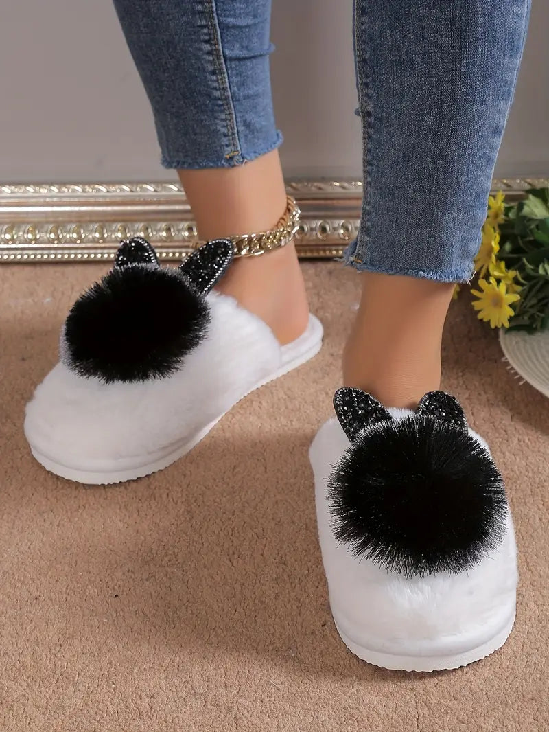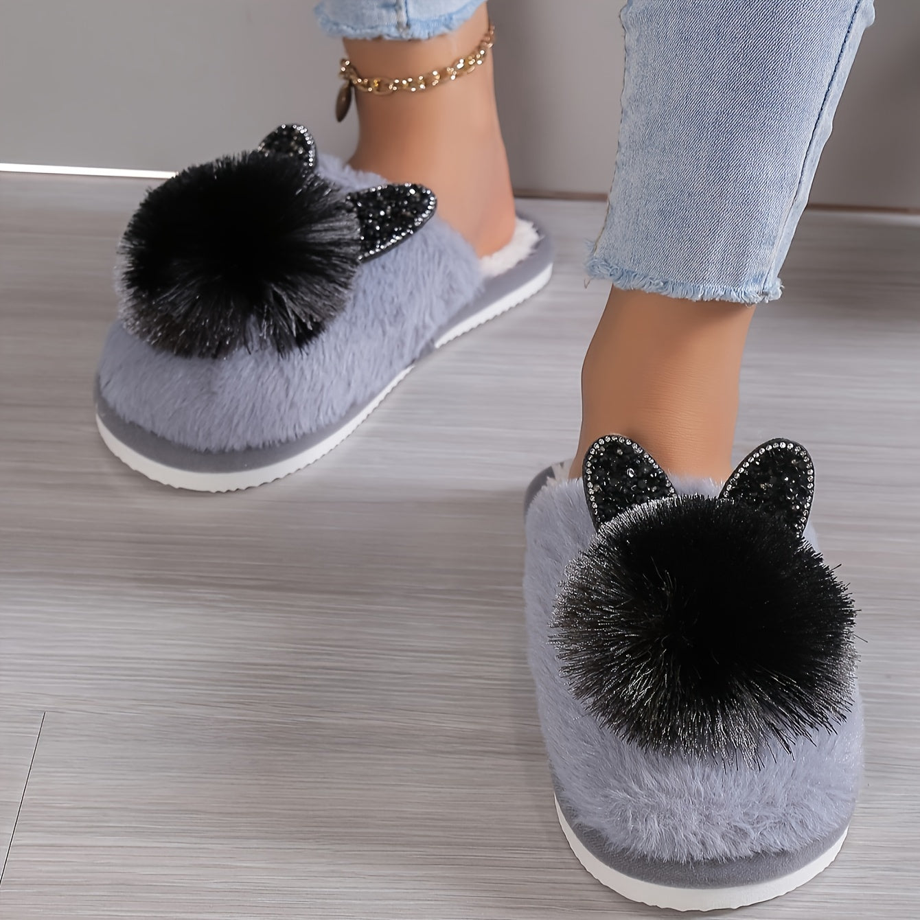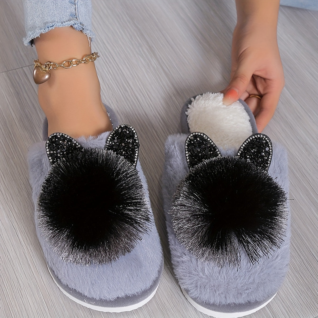 Женские плюшевые тапочки с мехом и ушками черного кота для дома