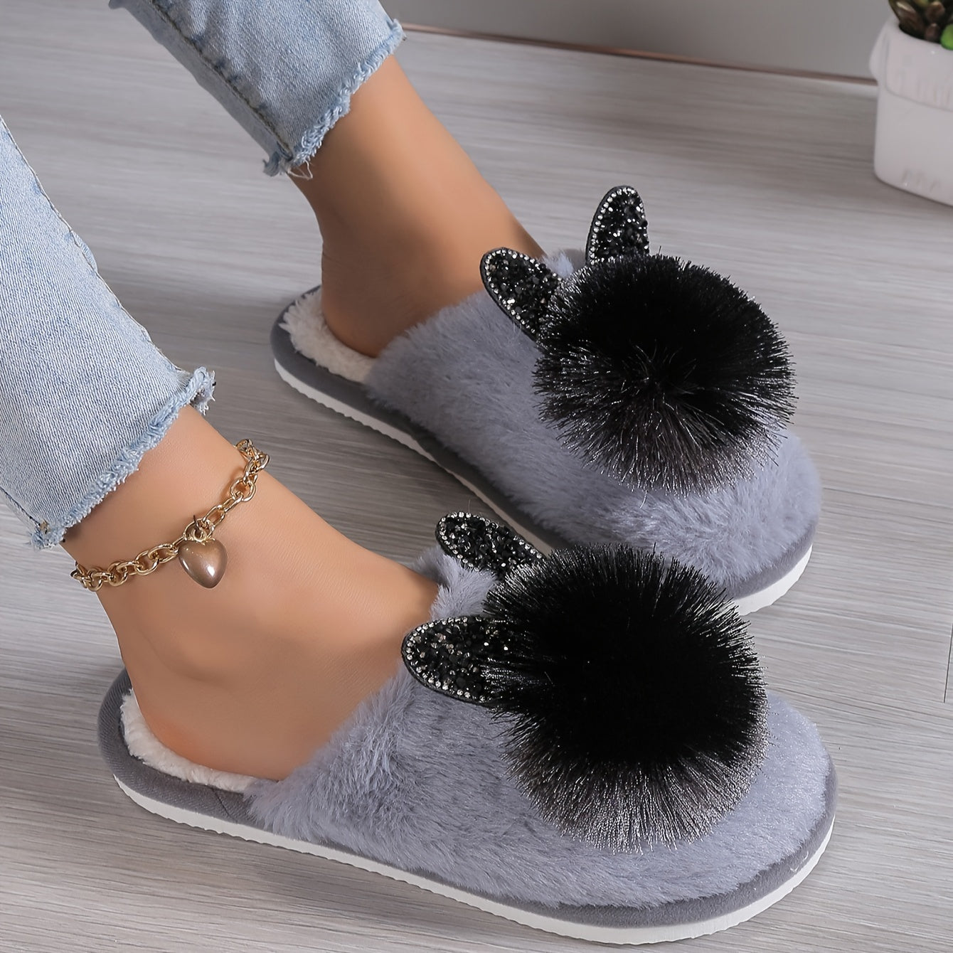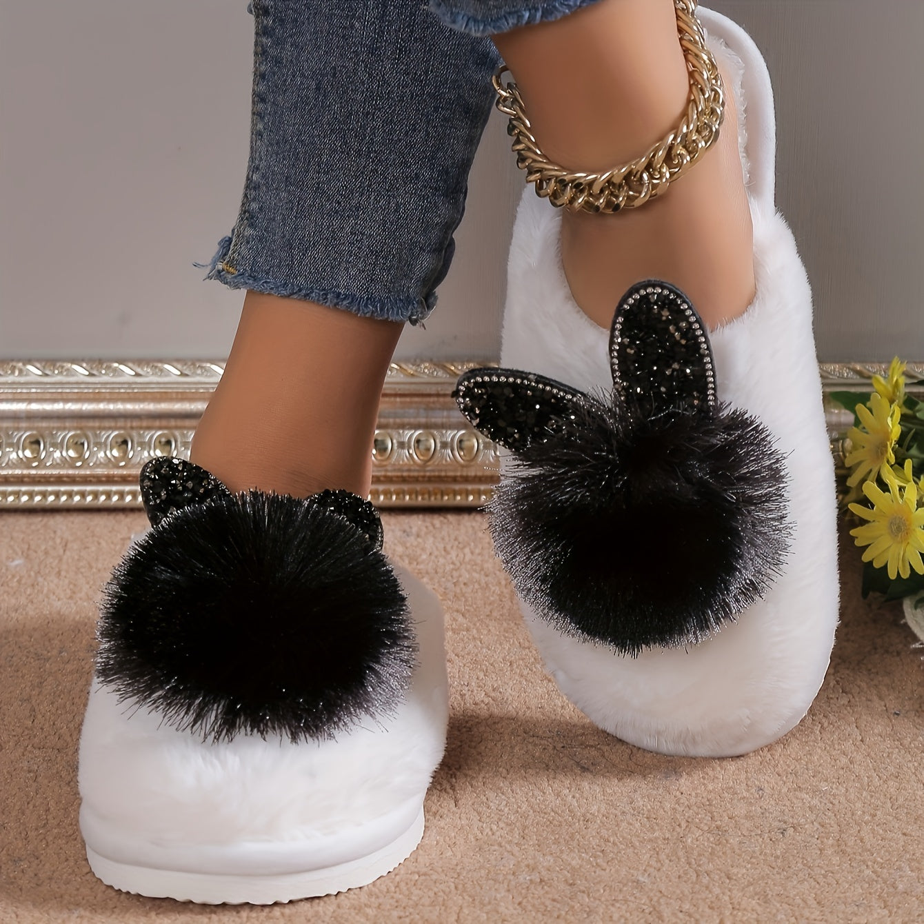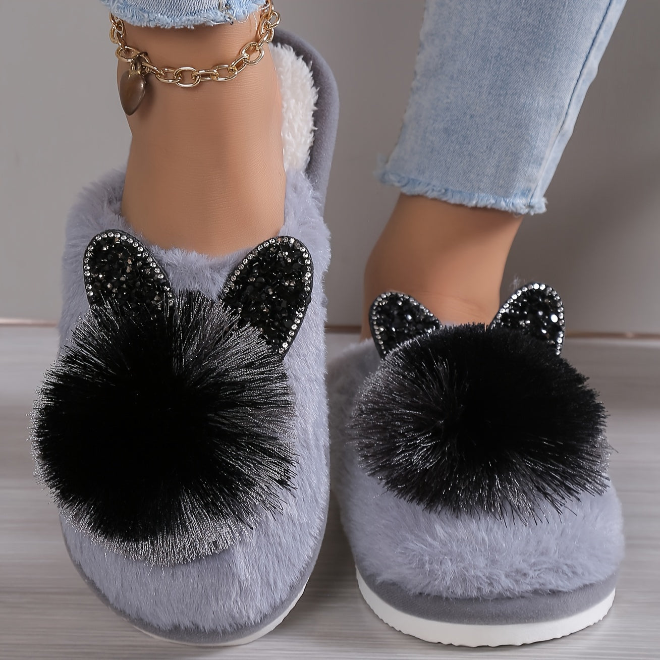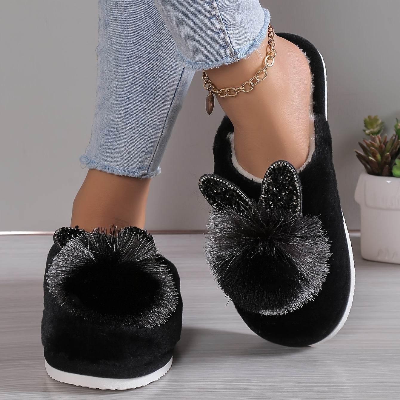 Женские плюшевые тапочки с мехом и ушками черного кота для дома