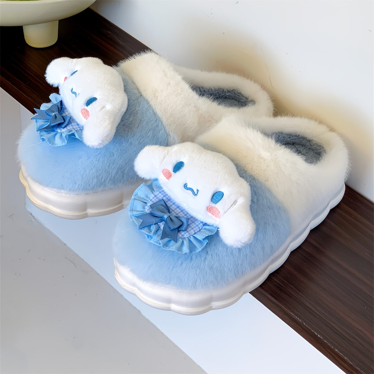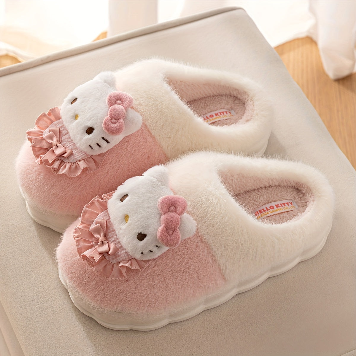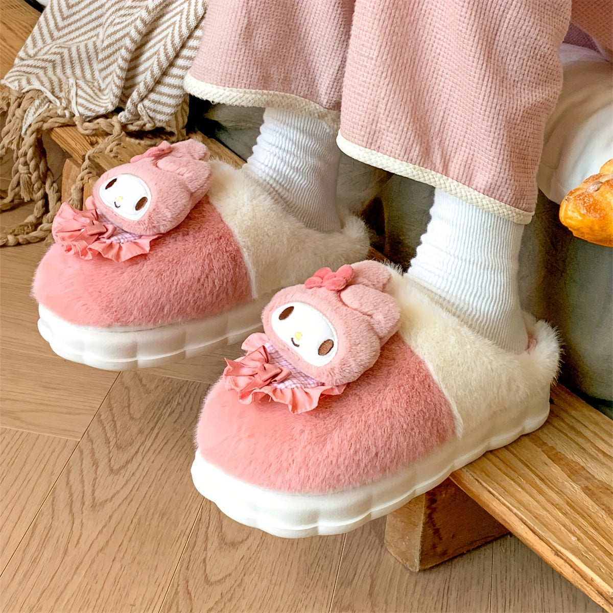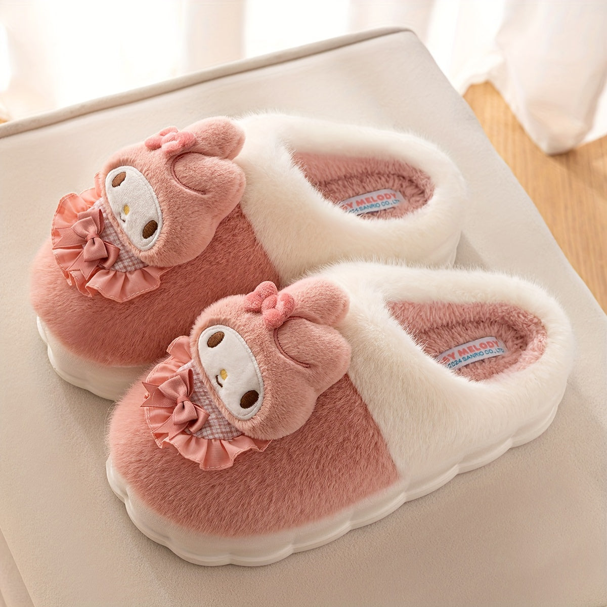 Женские плюшевые розовые и белые уютные тапочки-слипоны с бантиками