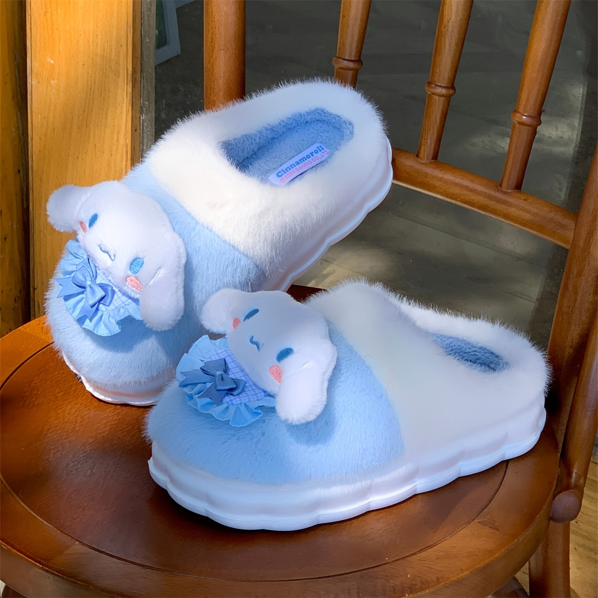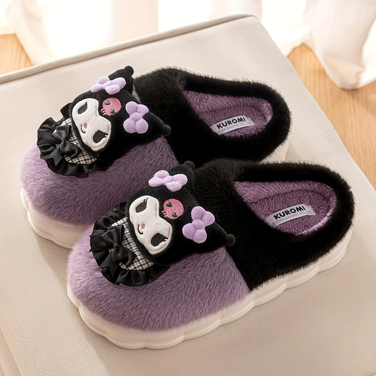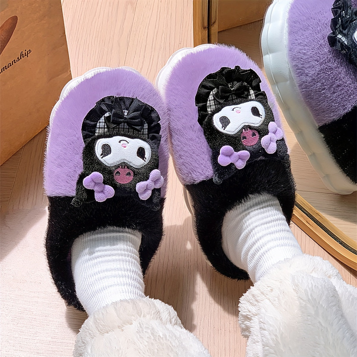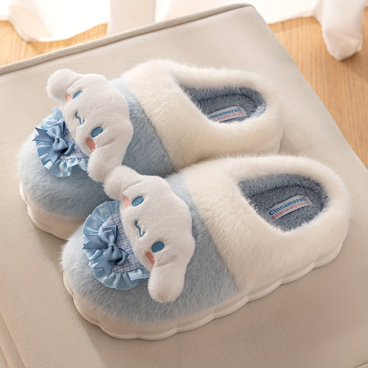 Женские плюшевые розовые и белые уютные тапочки-слипоны с бантиками
