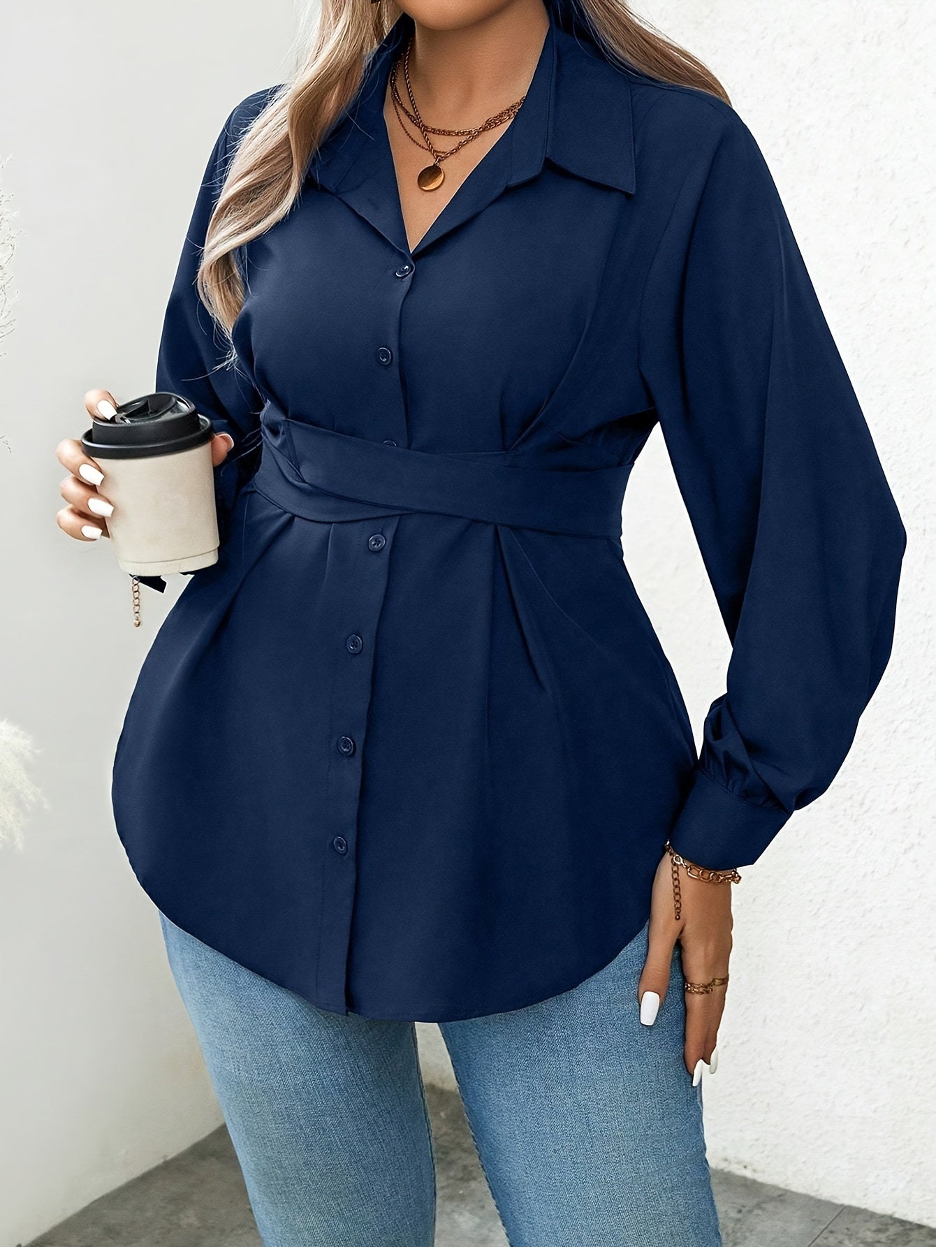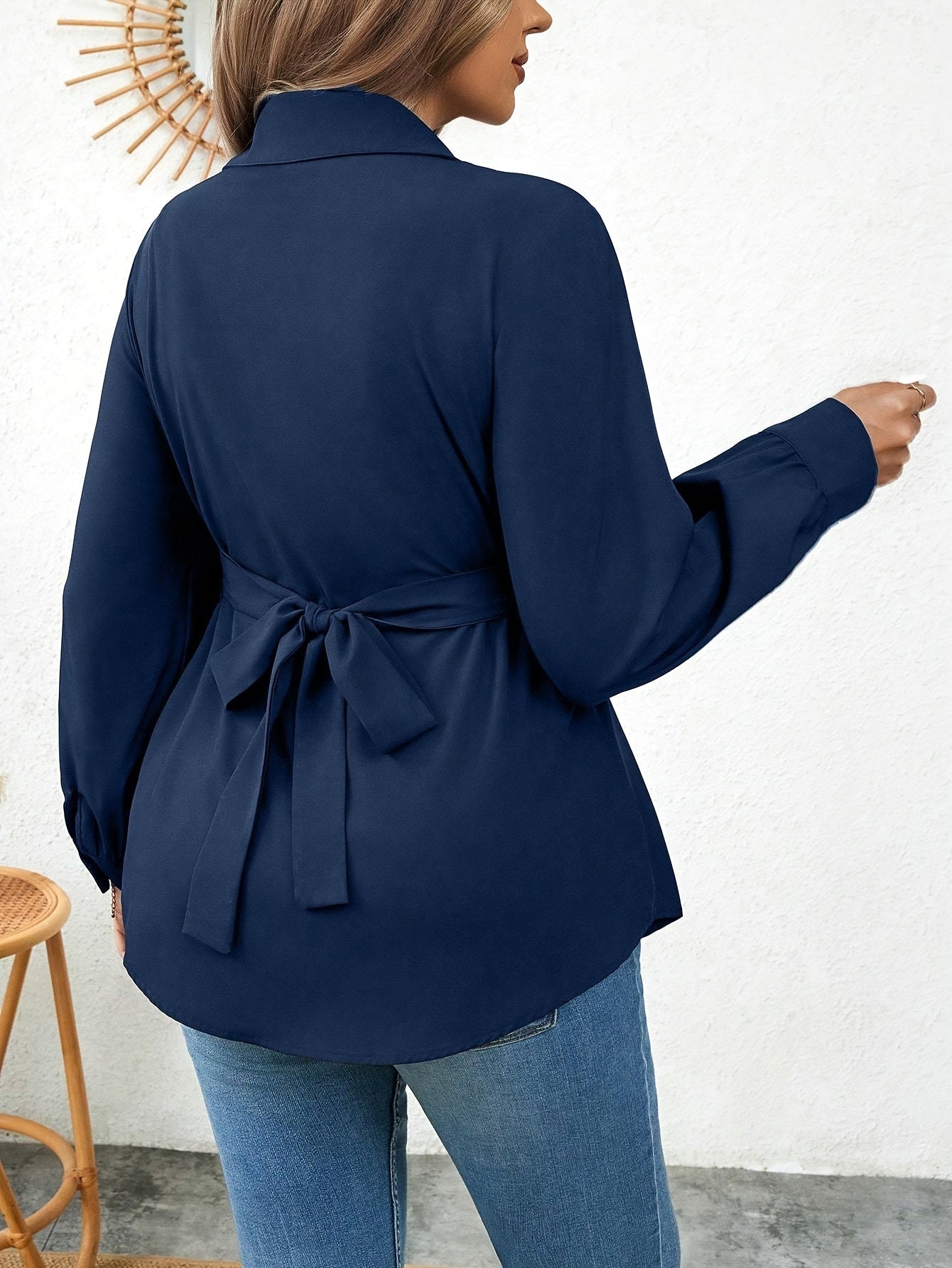 Женская рубашка с длинным рукавом и поясом из полиэстера, однотонная, для всех сезонов
