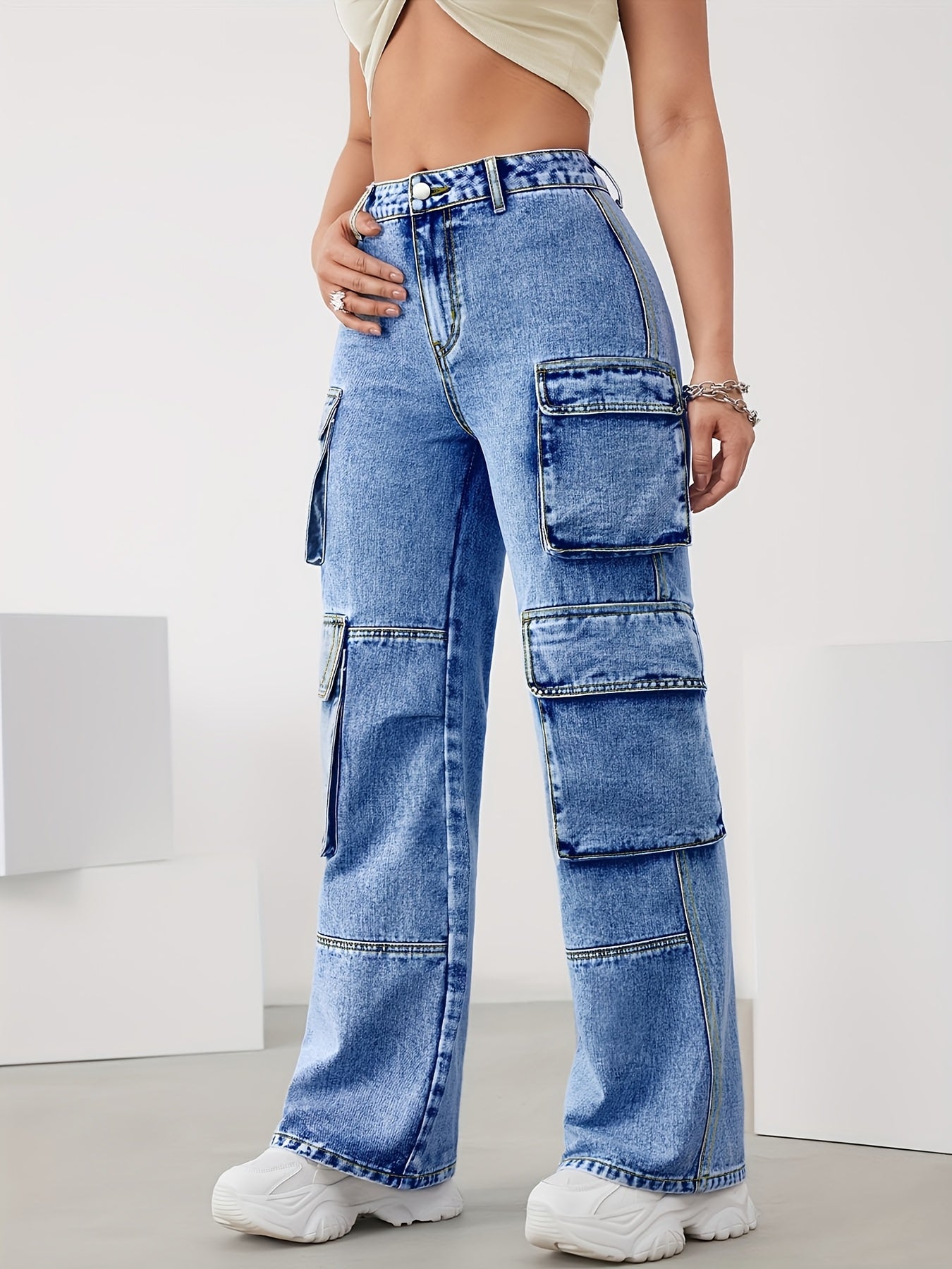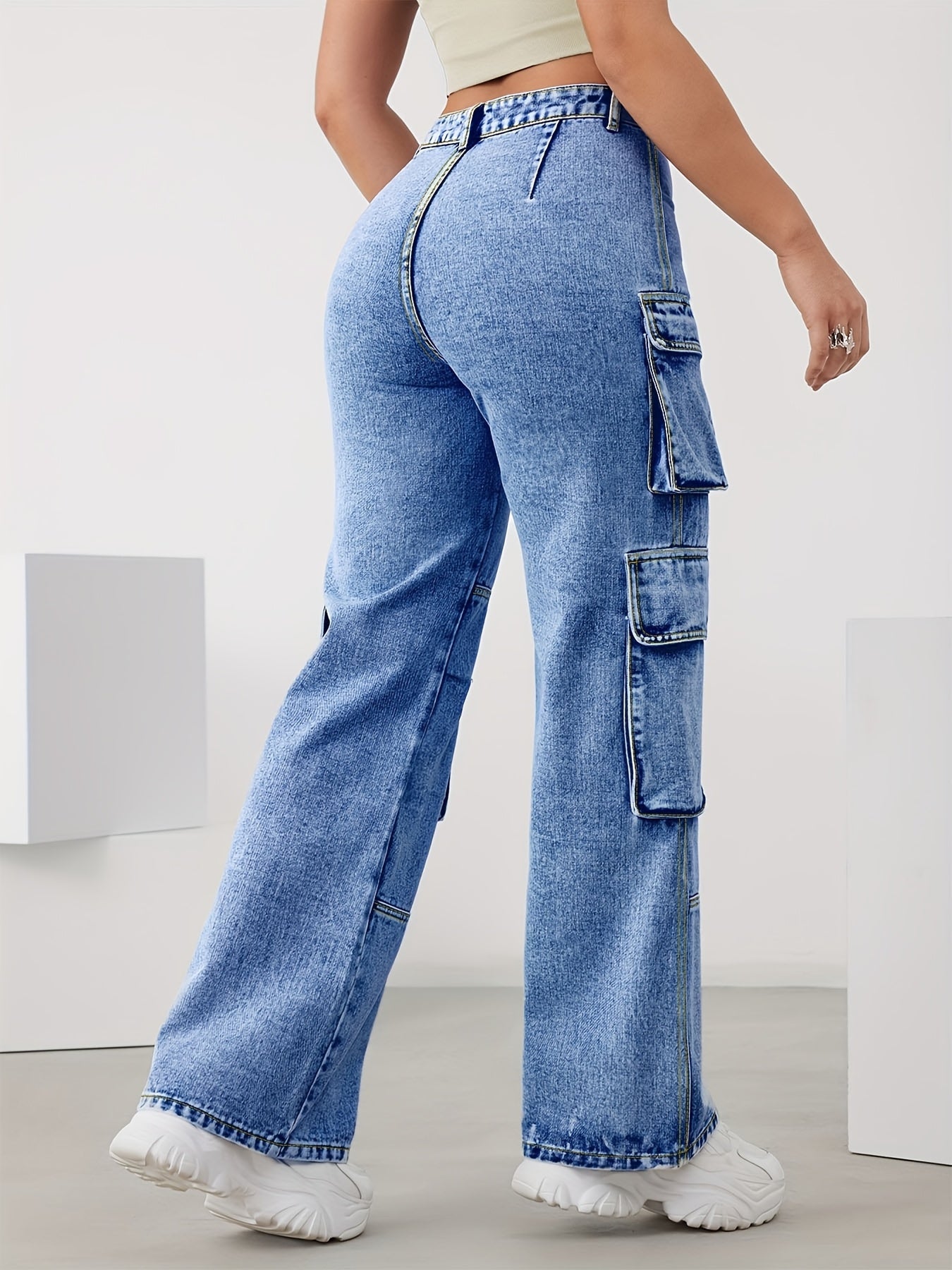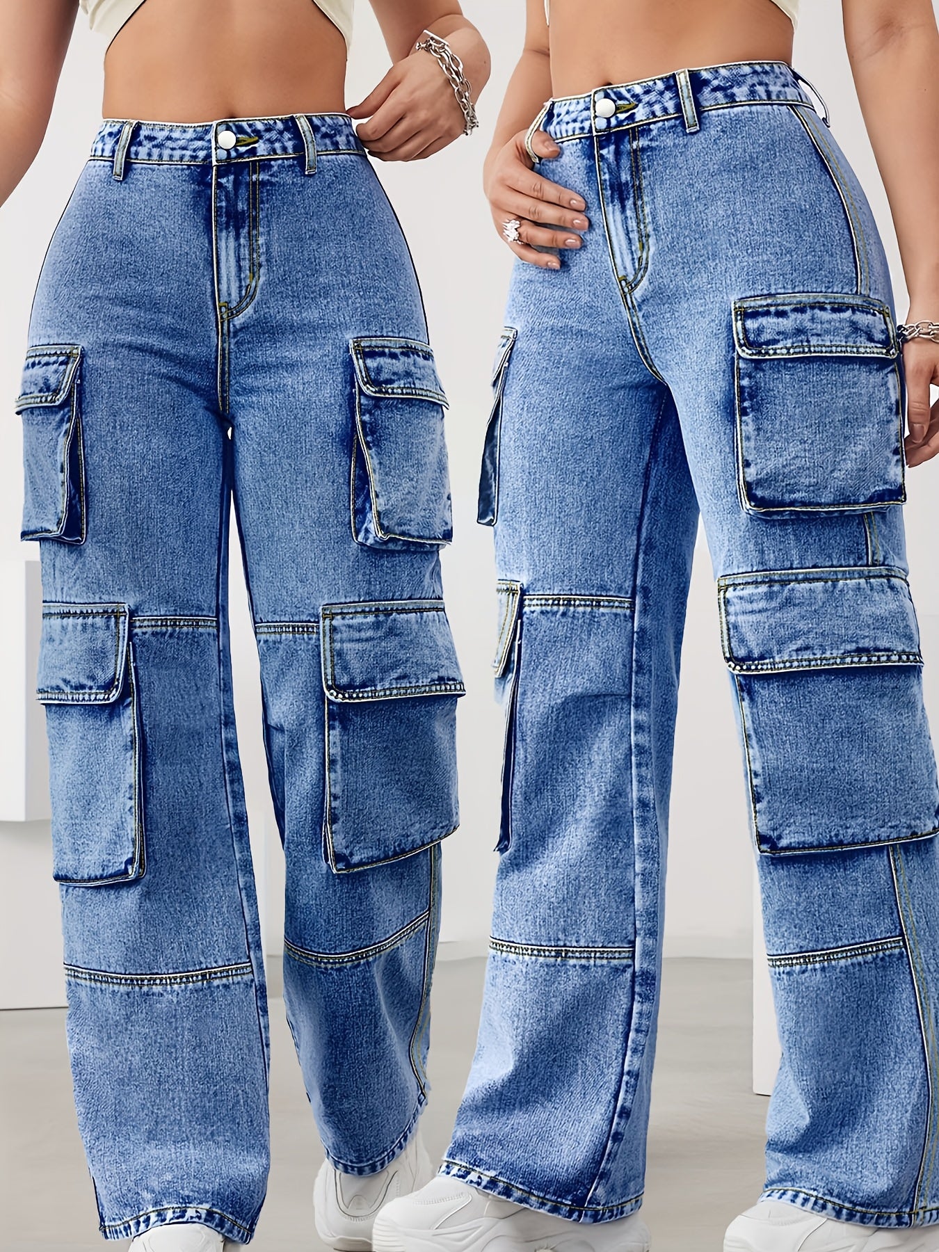 Женские эластичные джинсы с высокой талией и широкими штанинами, многопакетные повседневные брюки