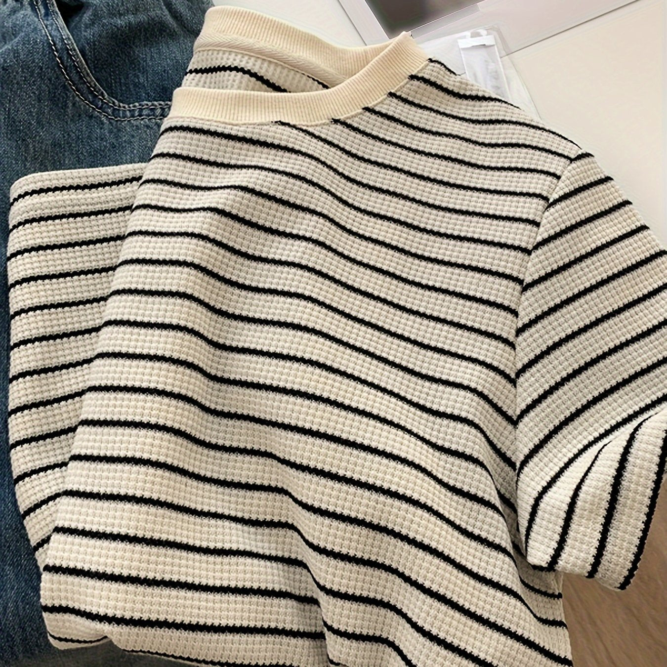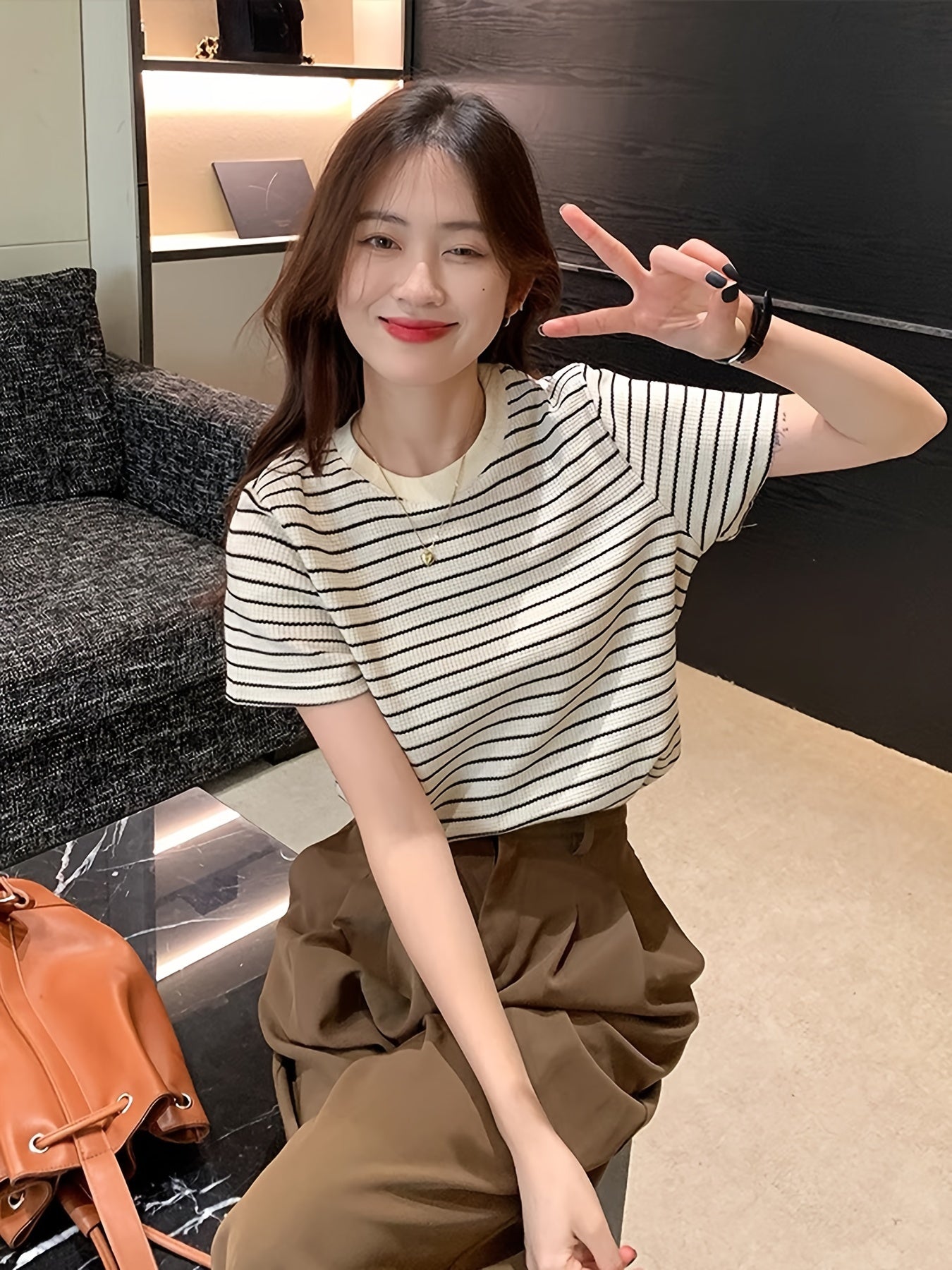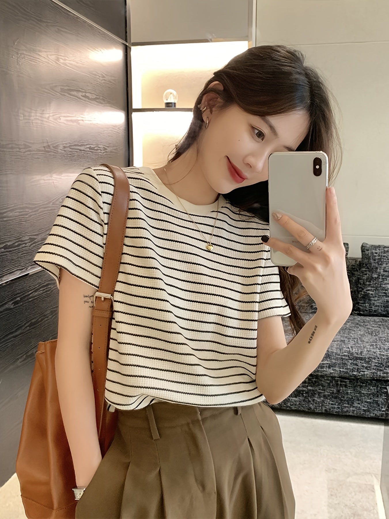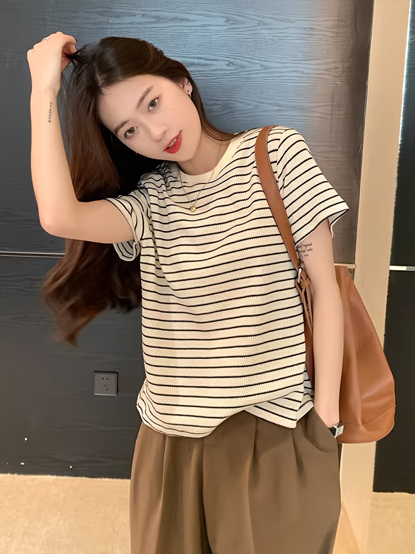 Женская летняя повседневная полосатая футболка из 100% хлопка, с круглым вырезом, короткими рукавами, обычной длины, свободного кроя и в азиатском стиле.