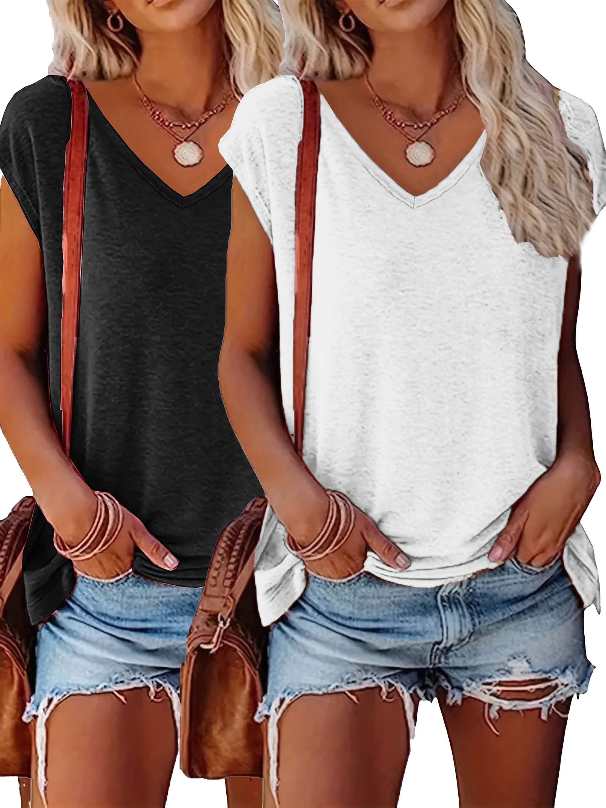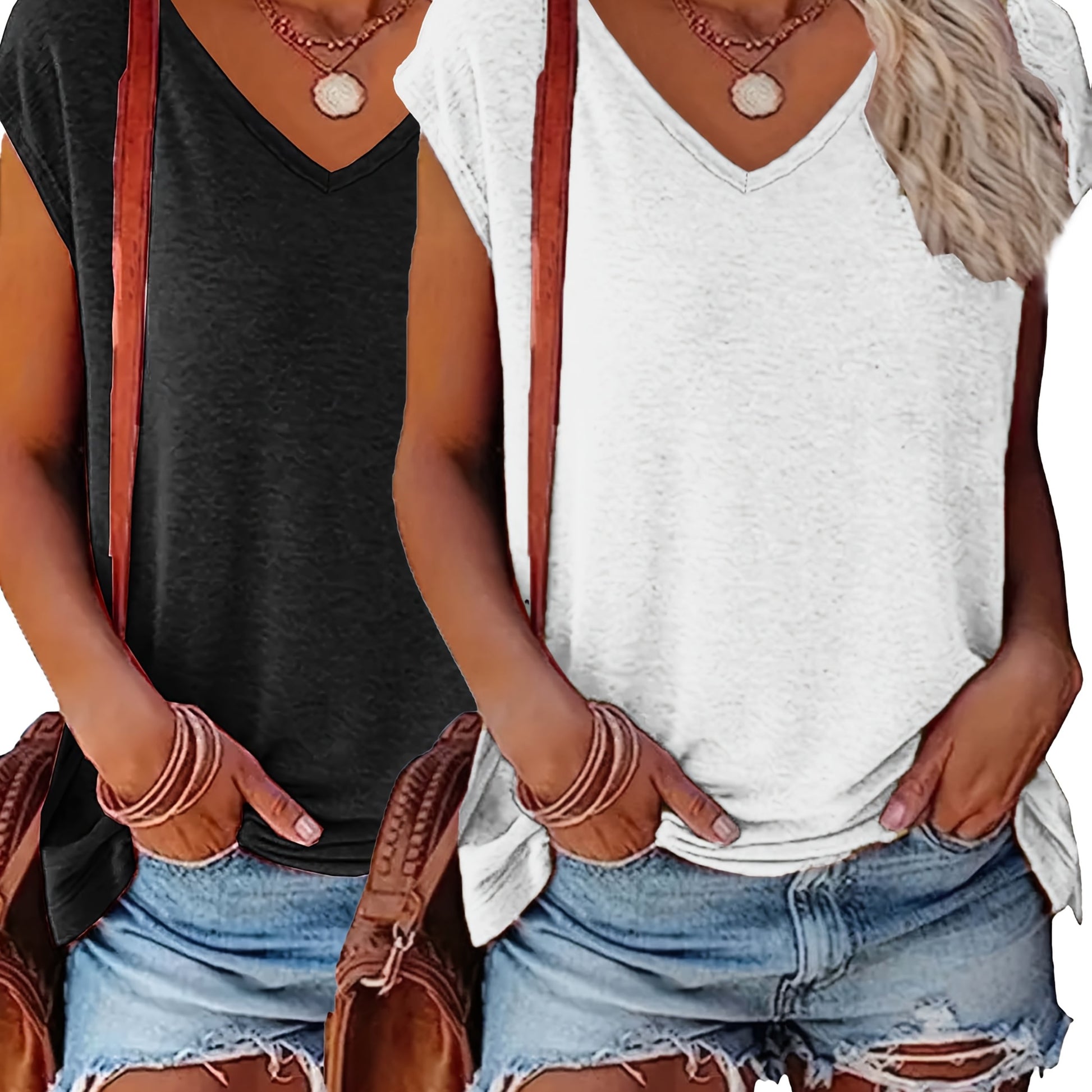 Женские футболки с V-образным вырезом, 2 шт., короткий рукав, летние топы, черный и белый