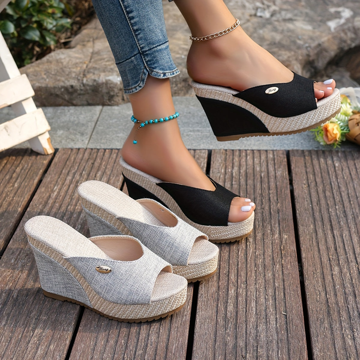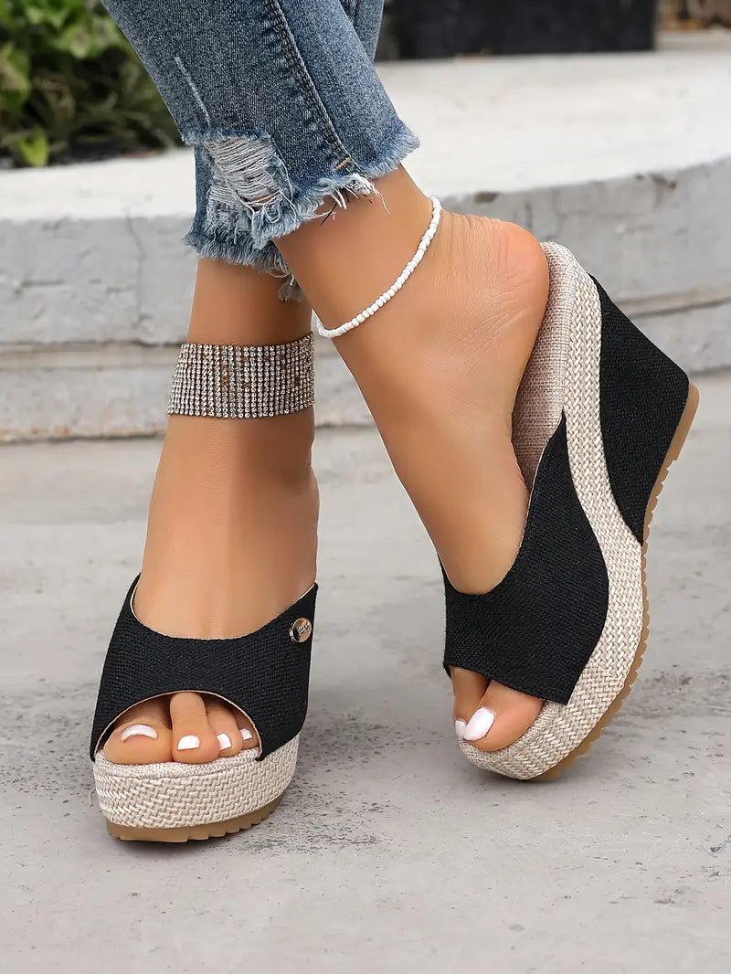 Женские универсальные черные плетеные сандалии на танкетке с красивым открытым носком и пряжкой.