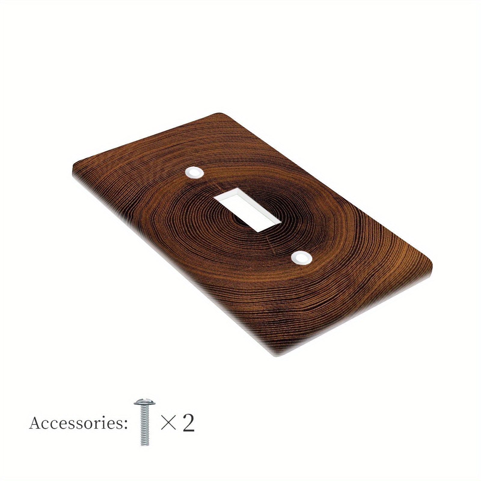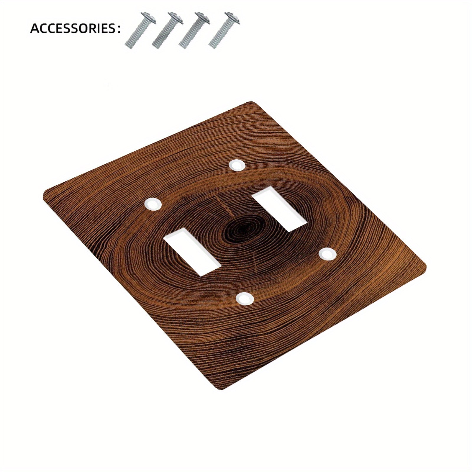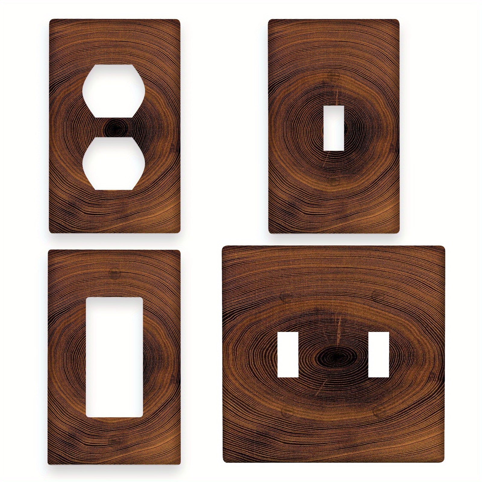 Деревянная стеновая панель с декоративной крышкой для выключателя и розетки, украшенной узором в виде древесной текстуры. Легко устанавливается внутри и снаружи без необходимости в электропитании.