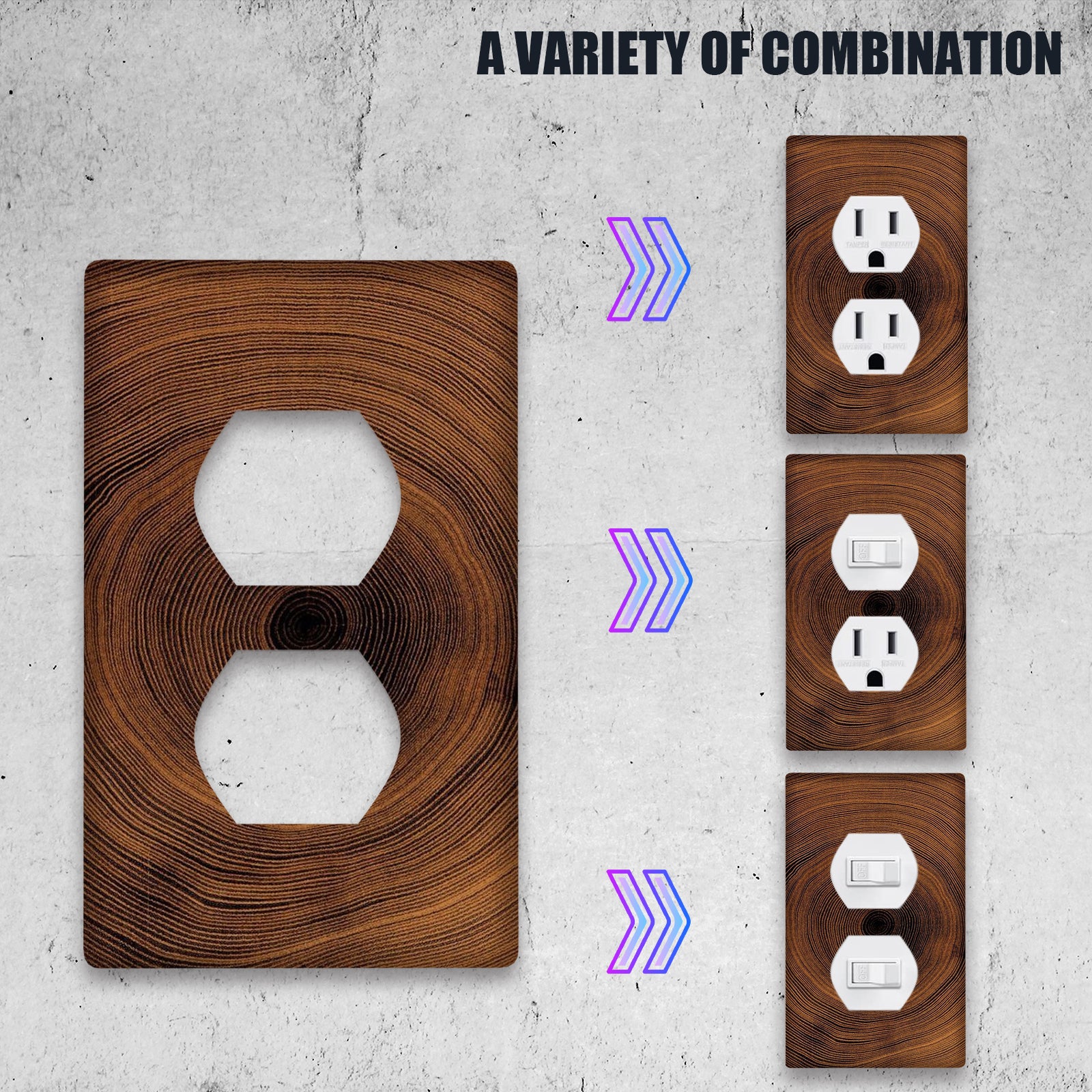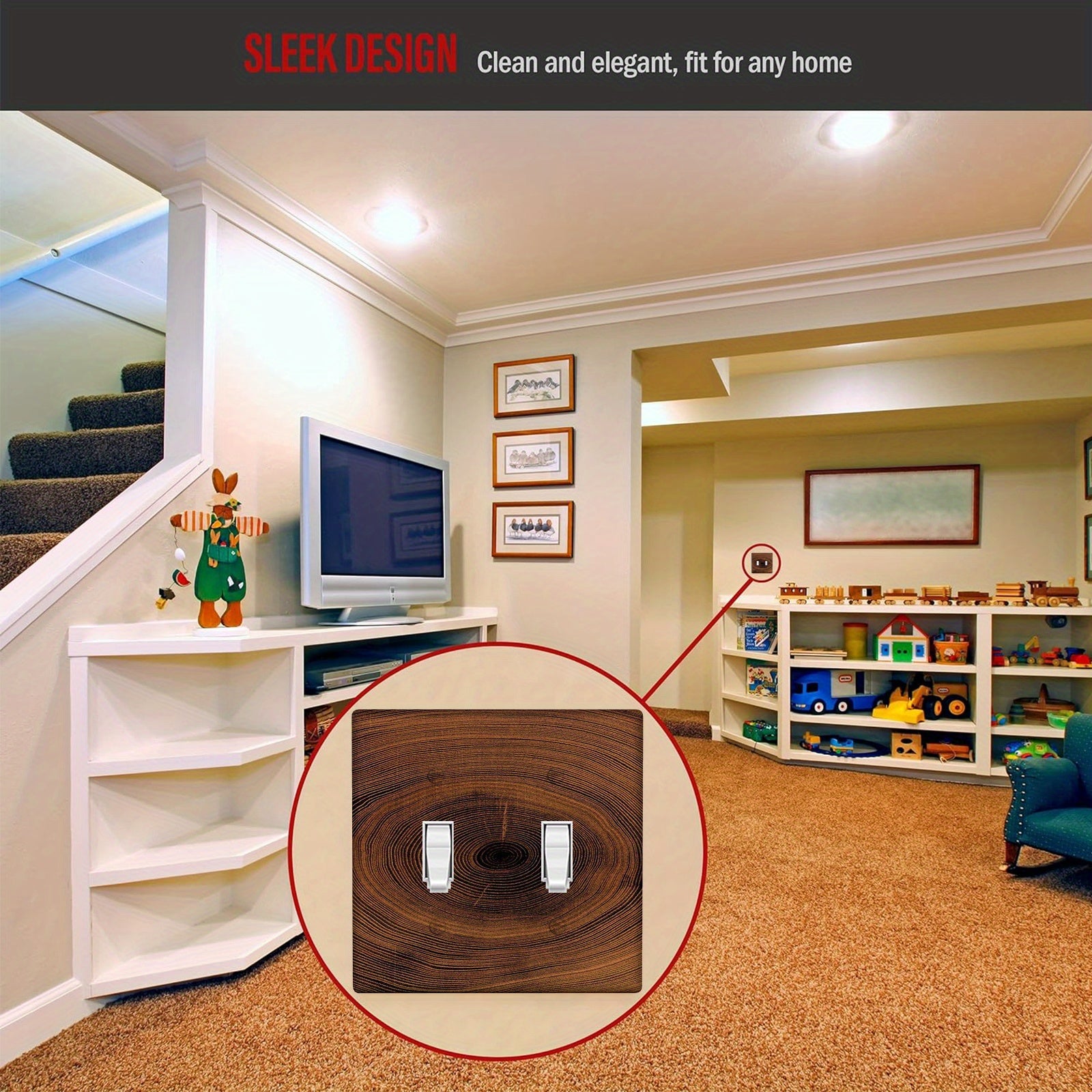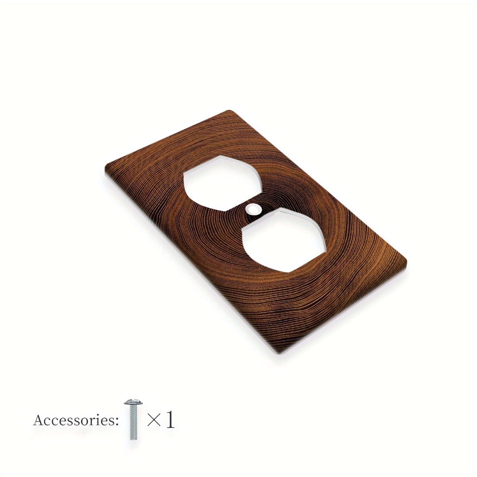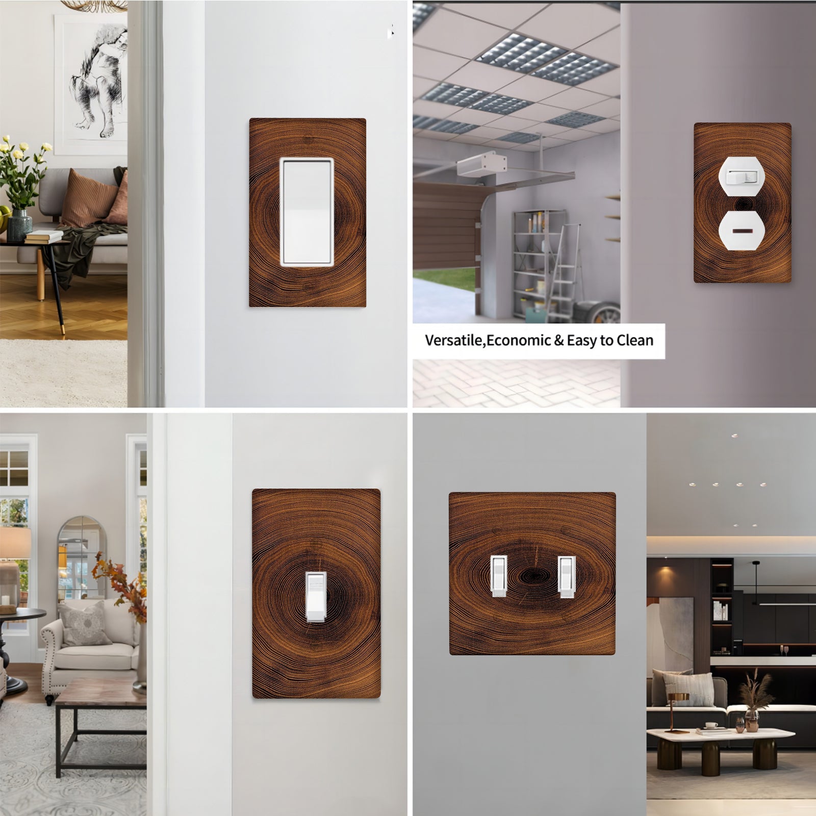 Деревянная стеновая панель с декоративной крышкой для выключателя и розетки, украшенной узором в виде древесной текстуры. Легко устанавливается внутри и снаружи без необходимости в электропитании.