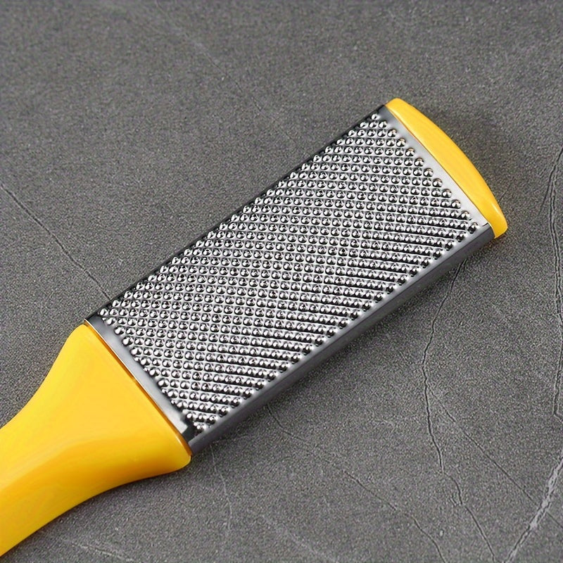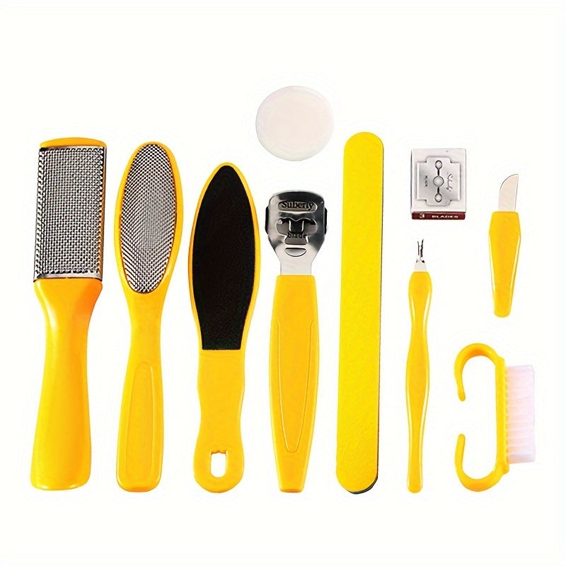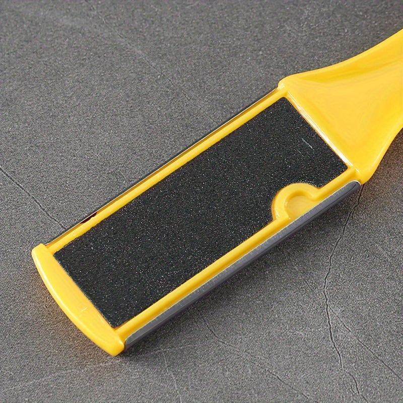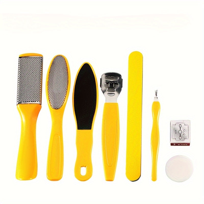 Желтый пластиковый педикюрный набор включает в себя удалитель мозолей, пилочку и скребок для гладкой кожи без батареек и запаха.