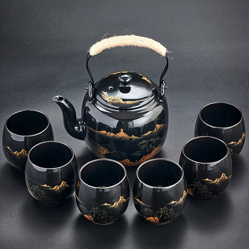 Qora keramik choynak to'plami 7/8 ta bo'lak, katta sig'im, Yapon uslubida, choynak va stakanlar bilan