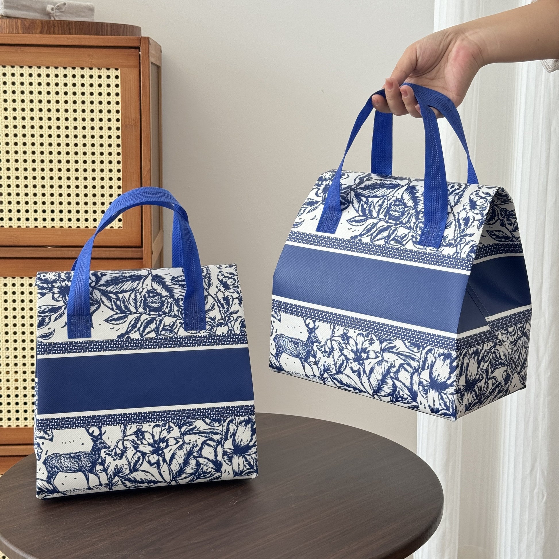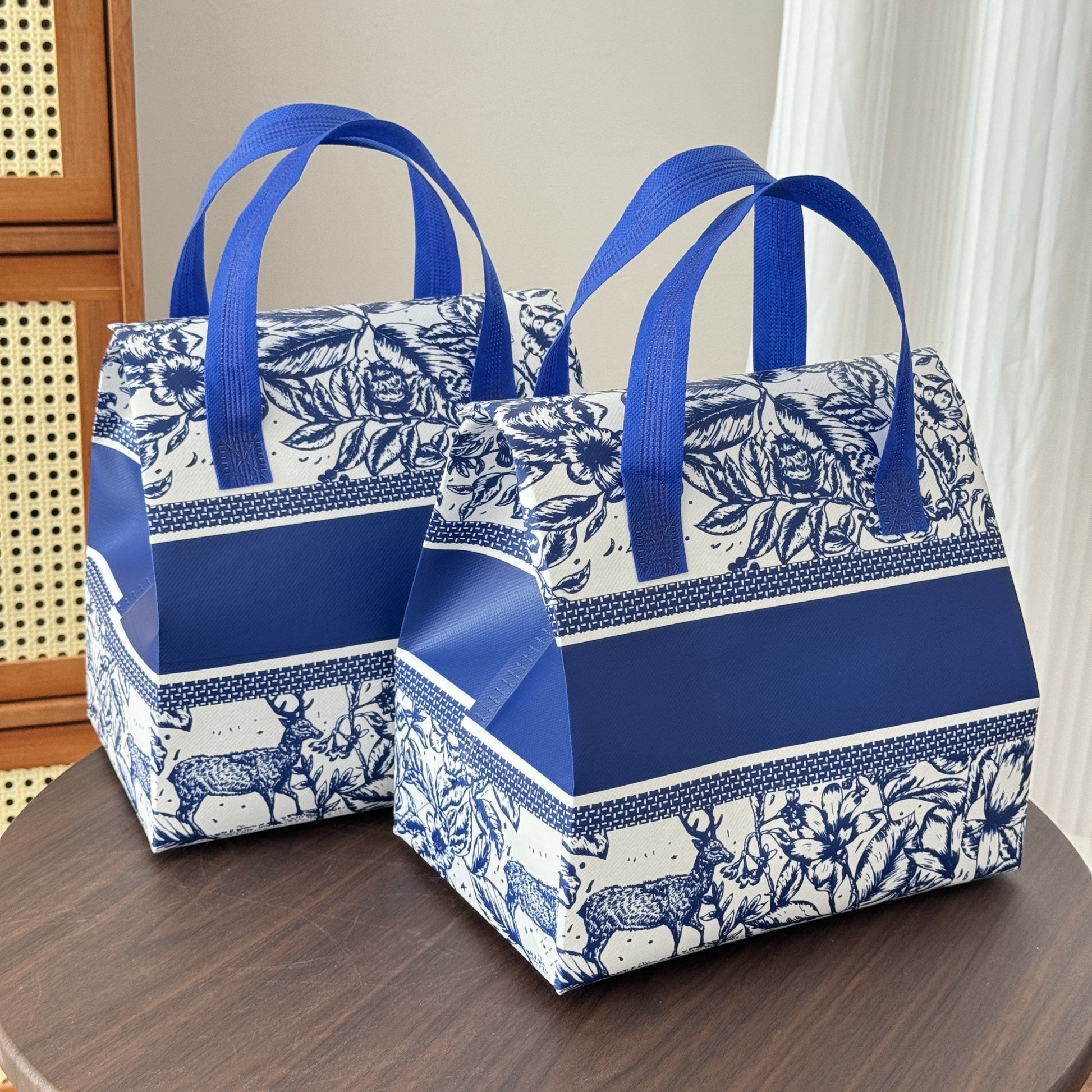 10 ta paket izolyatsiyalangan pizza yetkazib berish sumkasi, ko‘k va oq gullar bilan sovutgichlar, oziq-ovqat xizmatlari