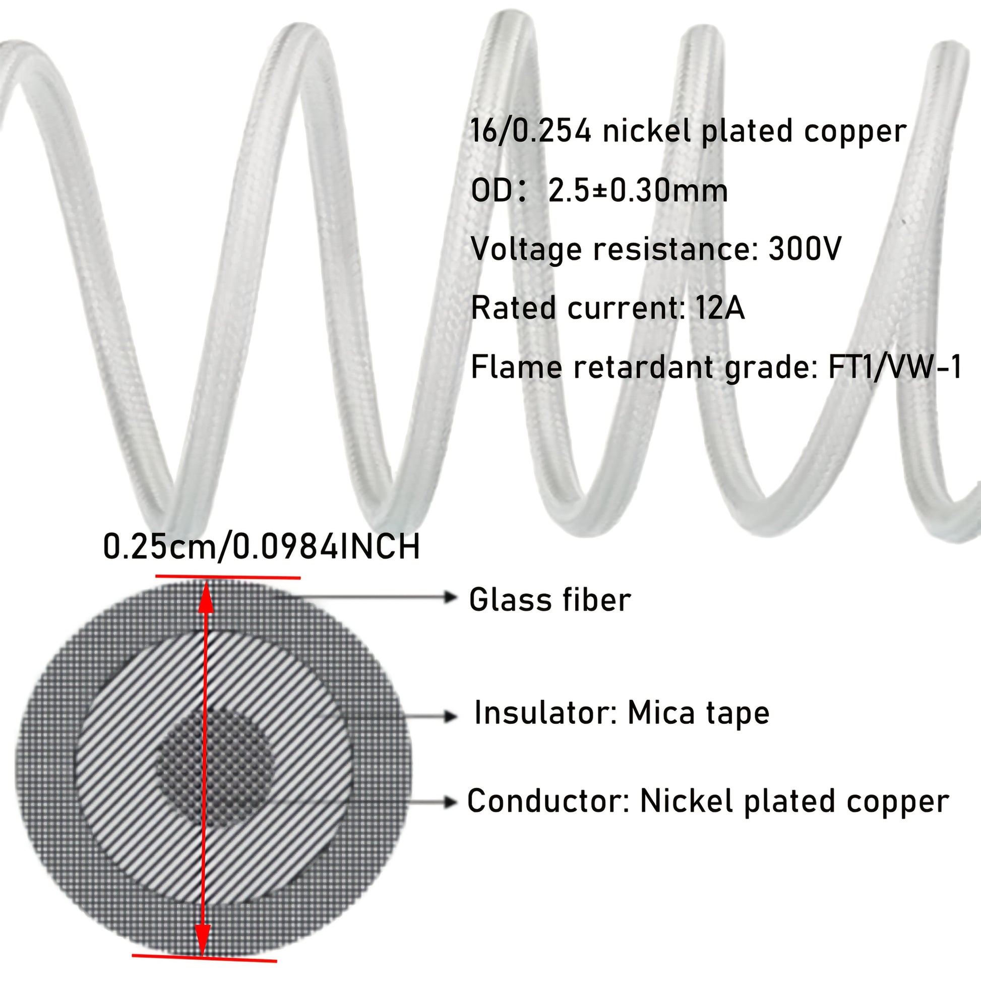 18 Gauge Yuqori Haroratli Sim 5.0 metr, ekstremal haroratlarda foydalanish uchun (-76°F dan 932°F gacha / -60°C dan 500°C gacha). Nikel mis konstruktsiyasi bilan Ikki qavatli Mica lenta Fiberglas izolyatsiyasi bilan