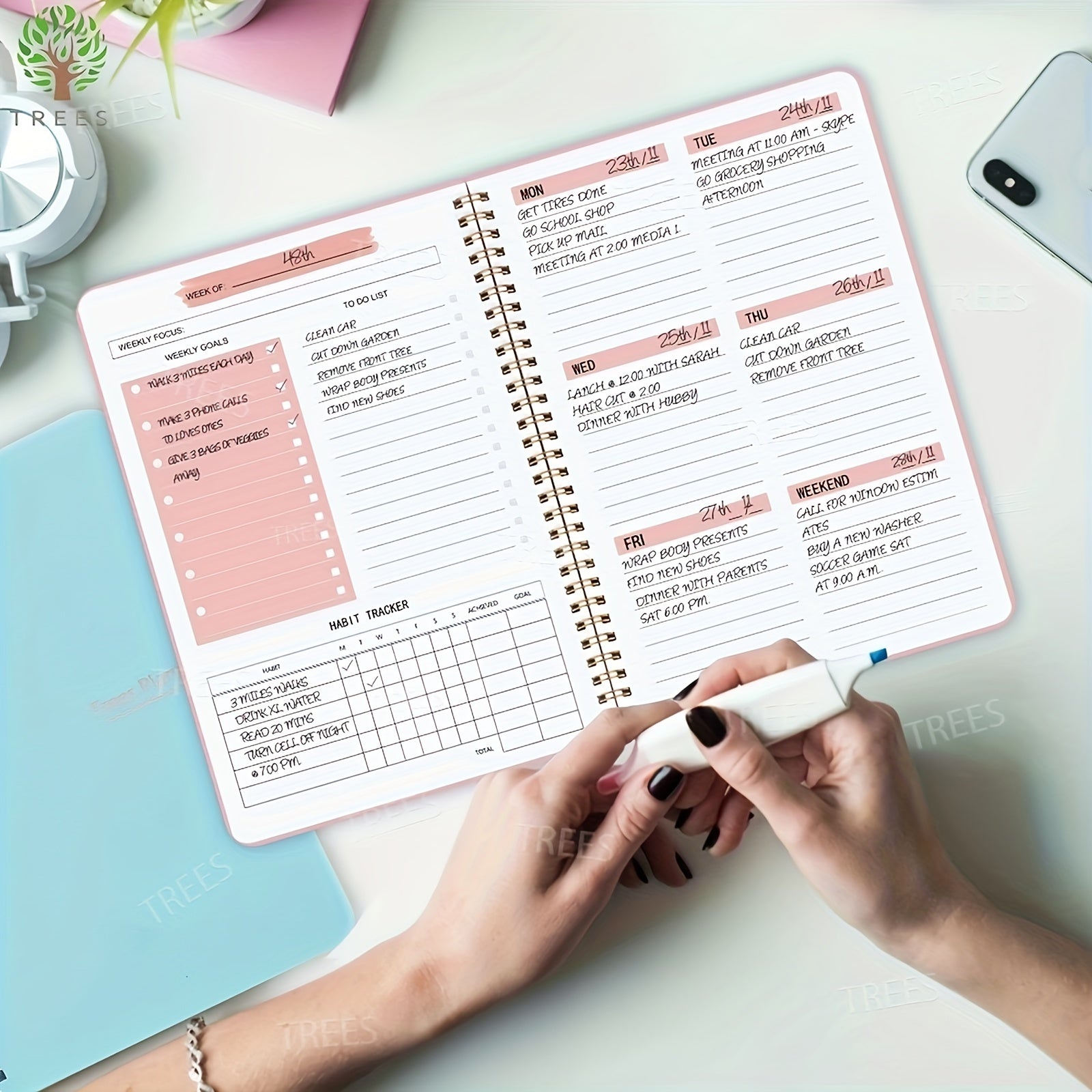 1 dona sanasiz A5 spiral rejalashtiruvchi, 52 varaq, PVC qopqoq, maqsadlarni belgilash va rejalashtirish uchun ideal.