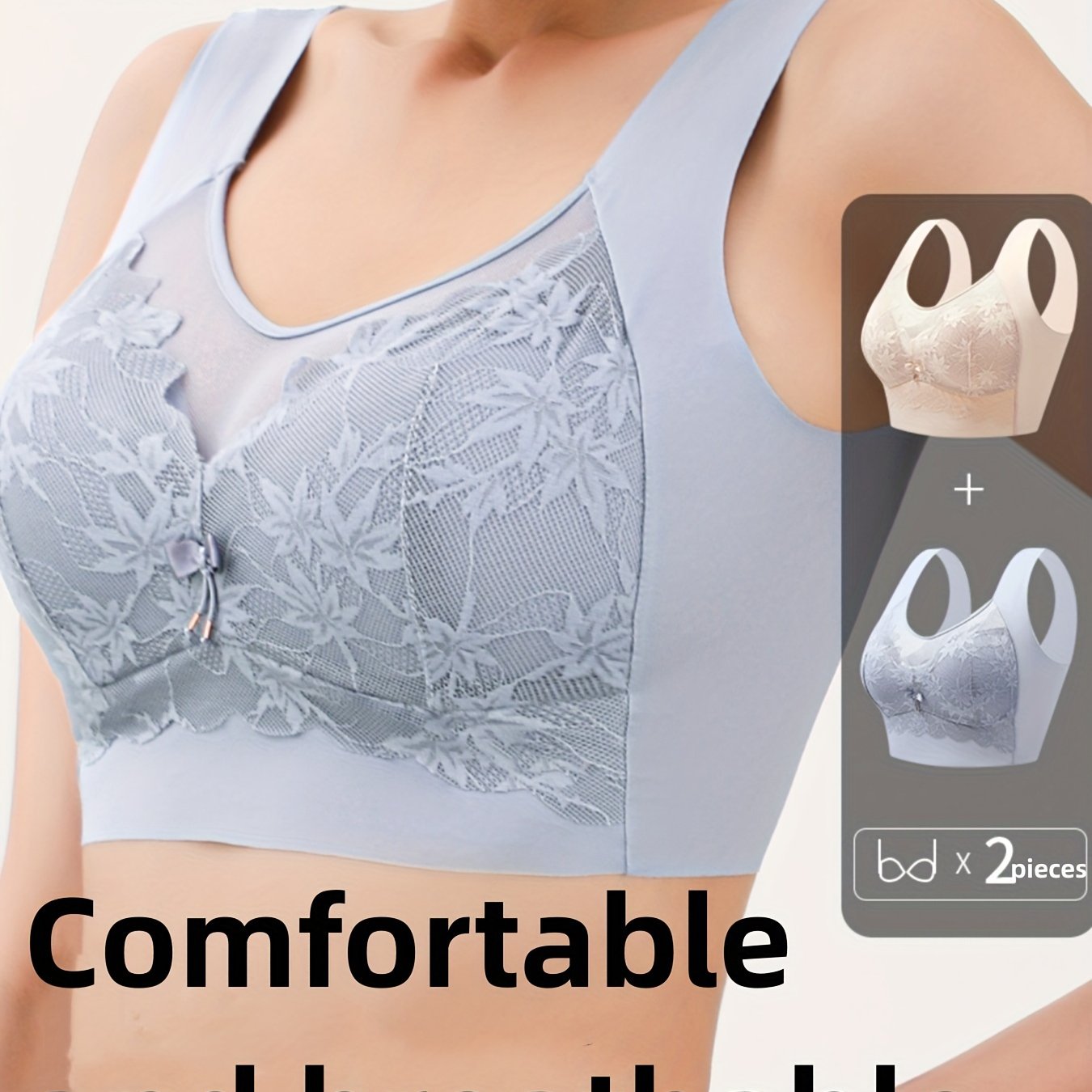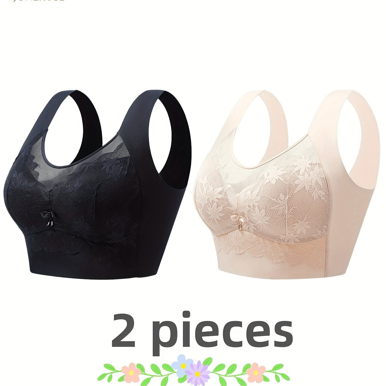 2 ta qora va bej rangdagi ayollar uchun nafis dantel simsiz brass. Qulay, tikuvsiz dizayn, gullar bosma, o'rtacha qo'llab-quvvatlash. Naylon va spandeks aralashmasidan tayyorlangan.