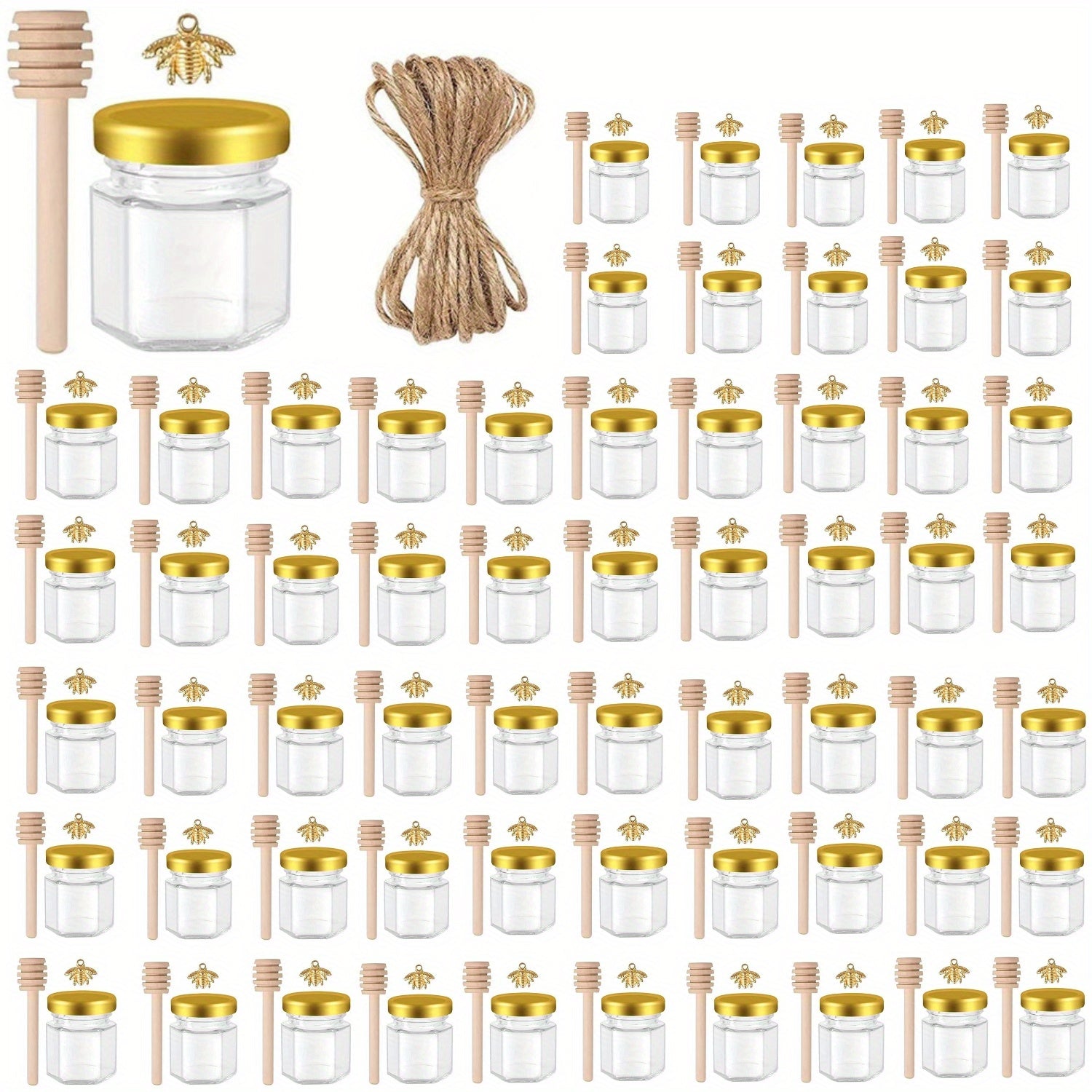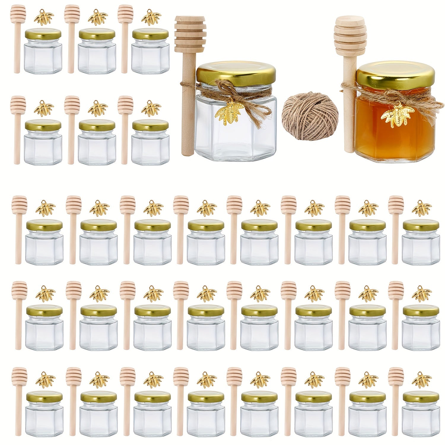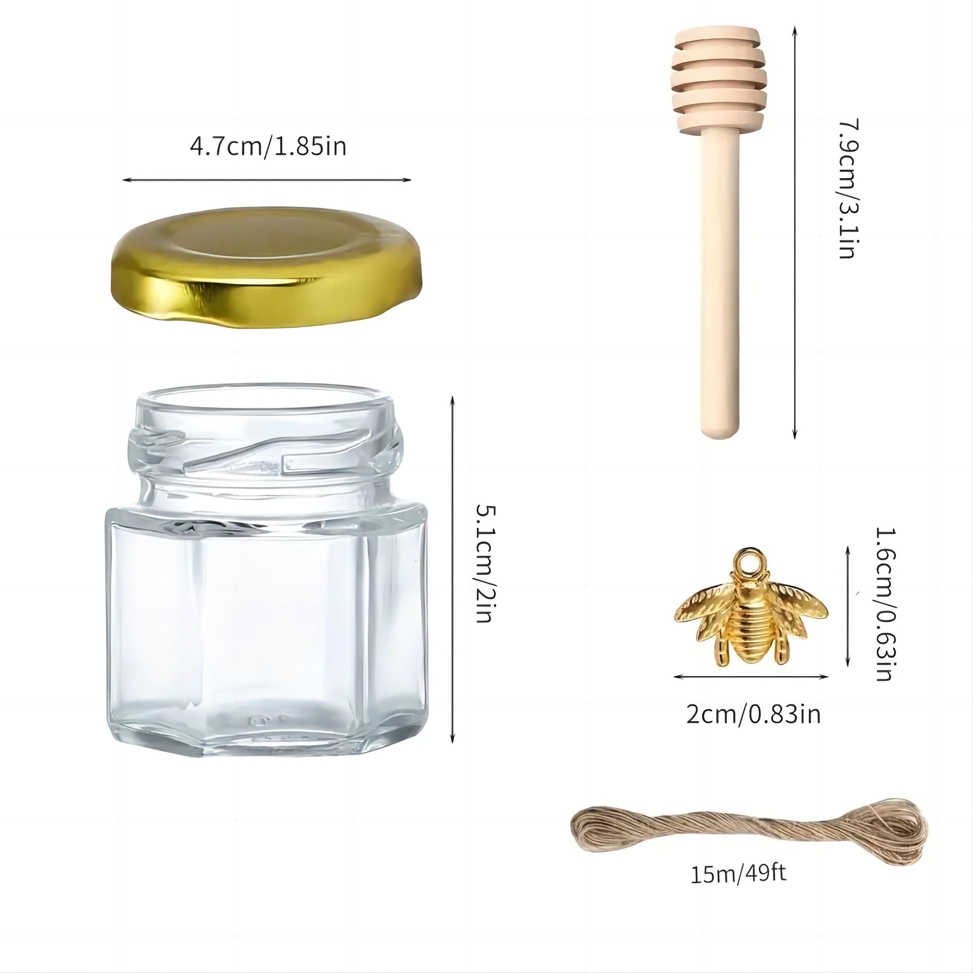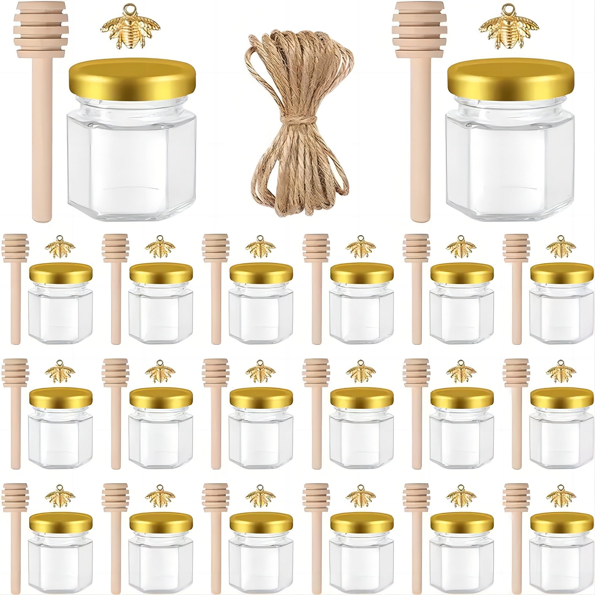 1.5 oz li 20 ta to'plamli olti burchakli mini shisha asal idishlari, yog'och cho'mich, oltin qopqoq, asalari pendanti va jute. Bolalar to'ylariga, to'y sovg'alari va partiya sovg'alari uchun ideal.