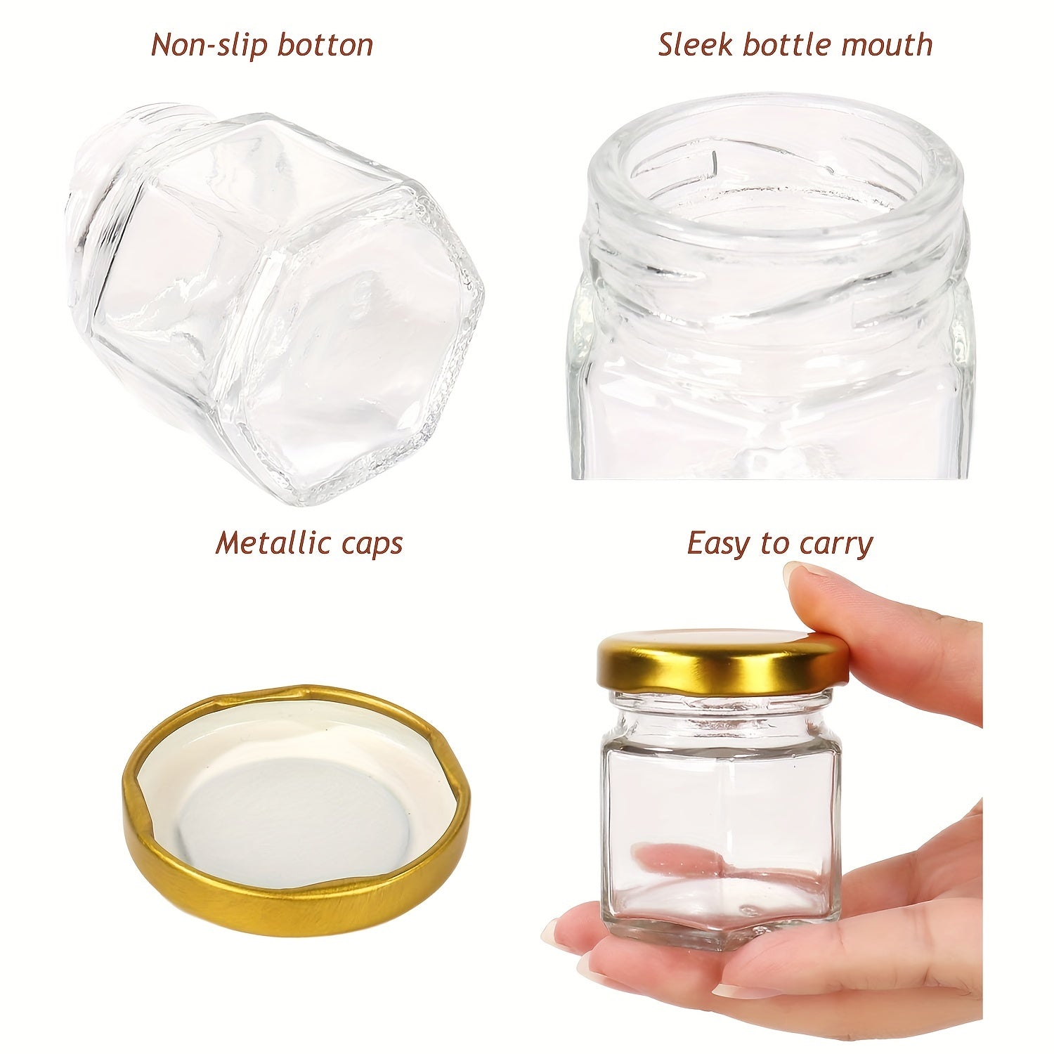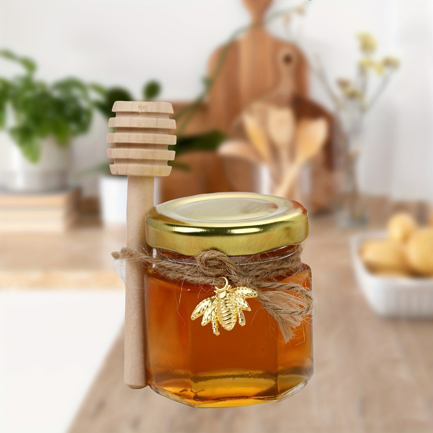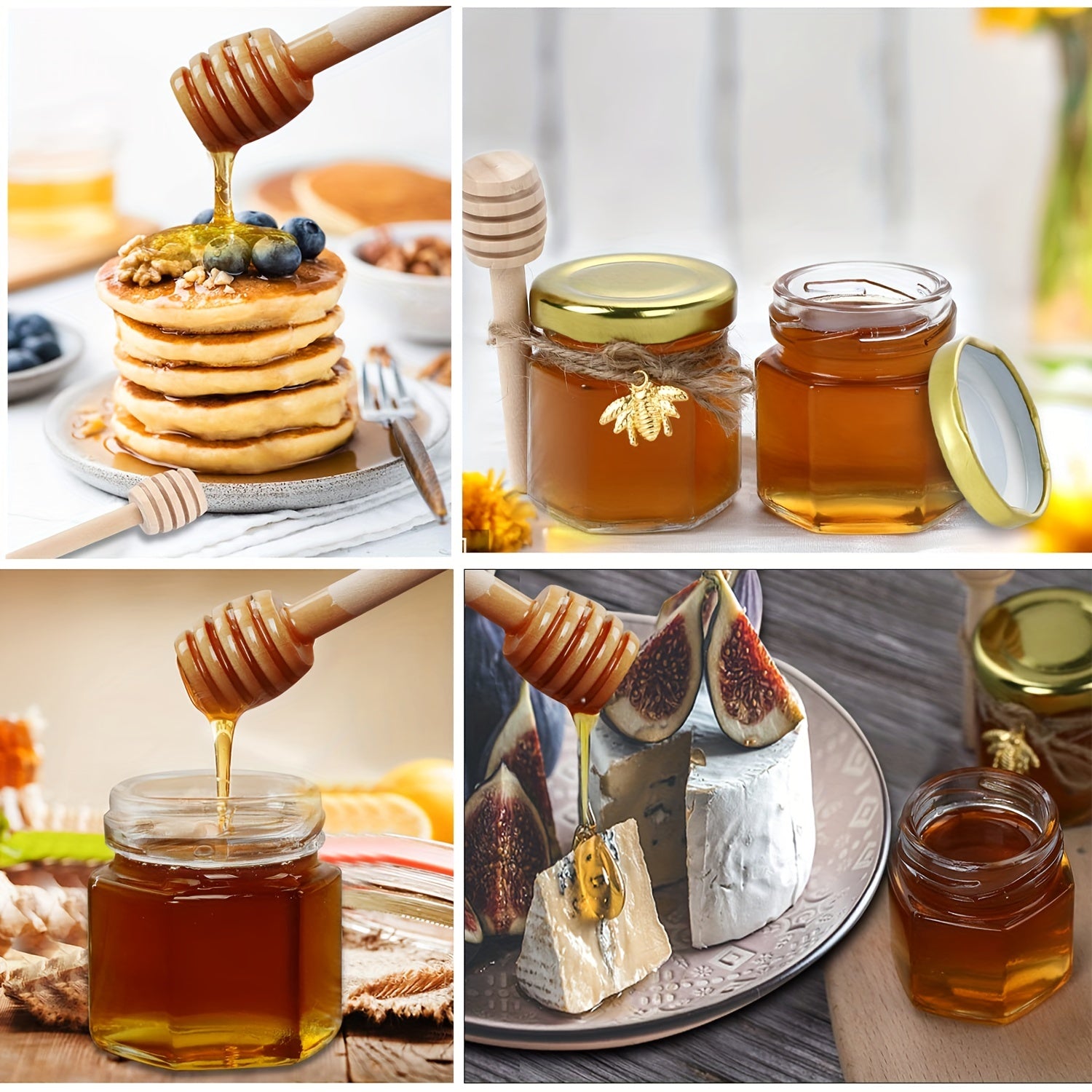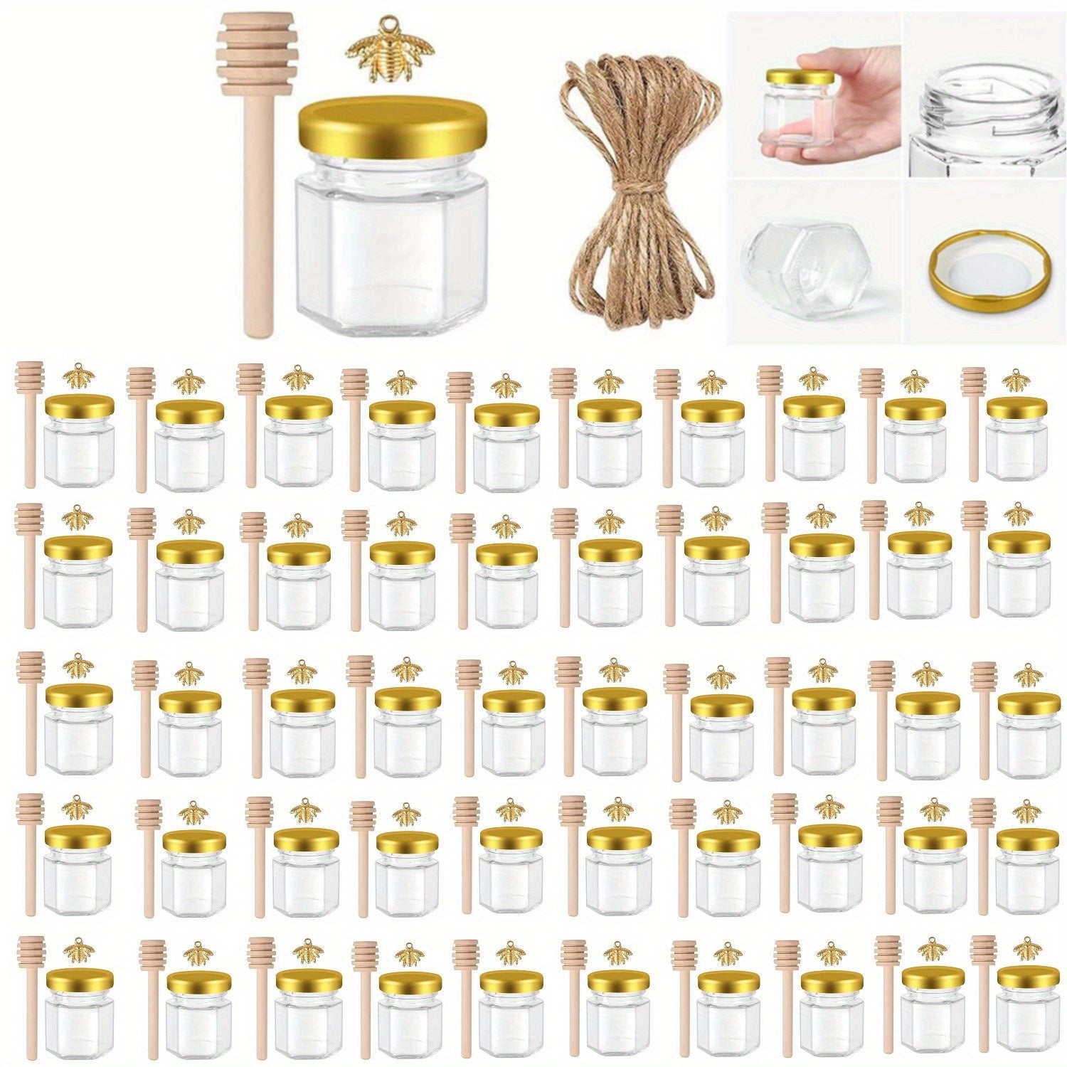 1.5 oz li 20 ta to'plamli olti burchakli mini shisha asal idishlari, yog'och cho'mich, oltin qopqoq, asalari pendanti va jute. Bolalar to'ylariga, to'y sovg'alari va partiya sovg'alari uchun ideal.