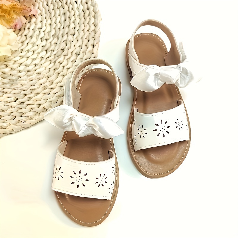 2023 yil yozgi qizlar uchun nafas oladigan dizaynga ega, nafis kamon tafsiloti, sozlanadigan tasma, porloq aksessuarlar va gullar naqshiga ega Princess sandallari.