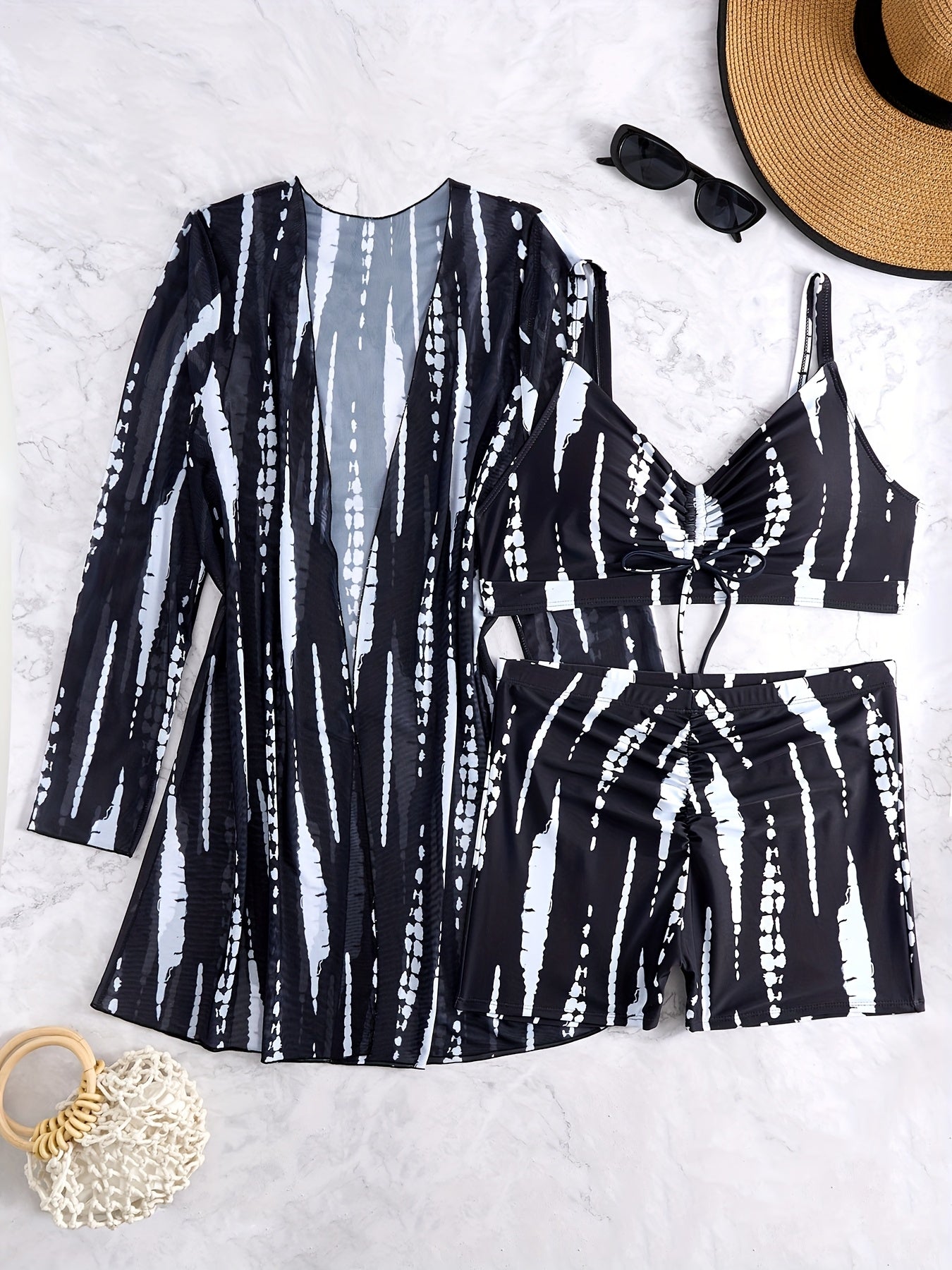3-qismli tortish qopqog'i bilan plus size bikini to'plami, qorinni yashiruvchi suzish kiyimi va qoplama