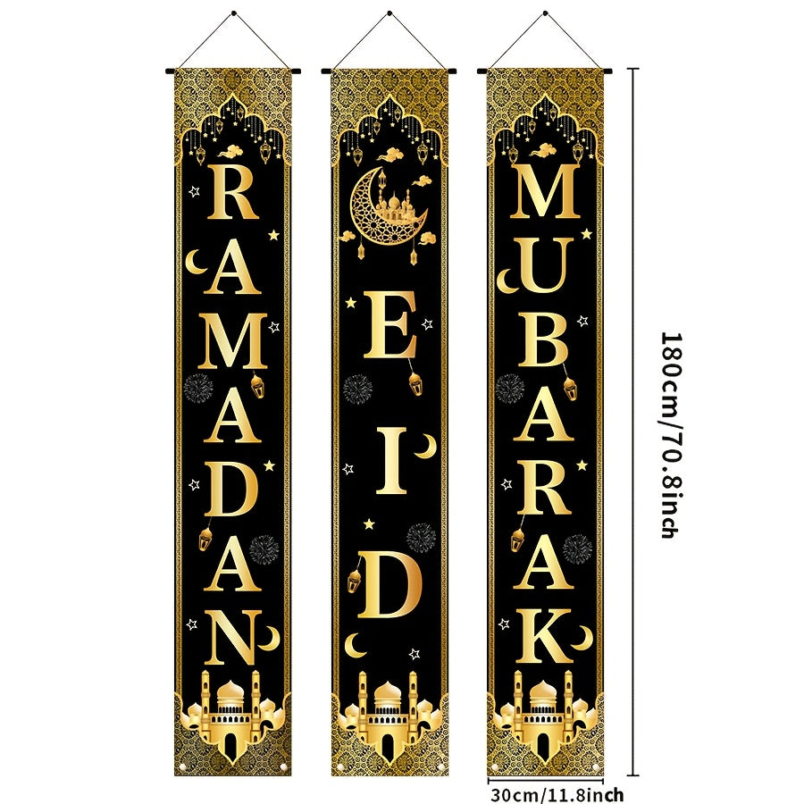 3-chi qismli Eid Mubarak bezak to'plami qora va oltin Ramazon eshik bayroqlari oy dizayni uchun uy va bayram
