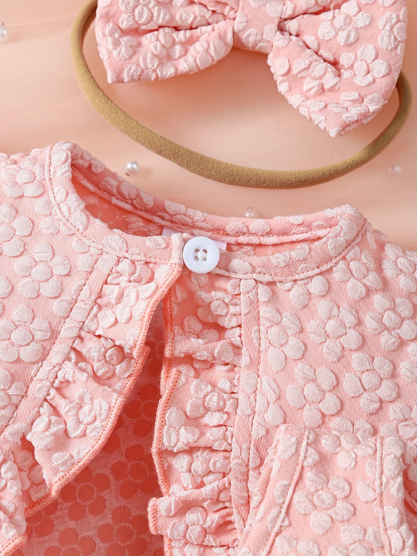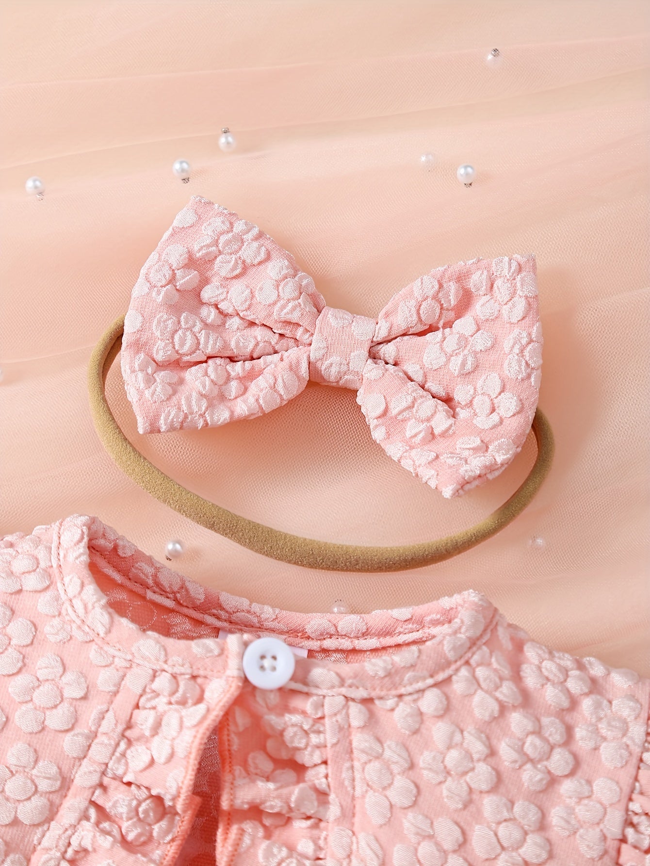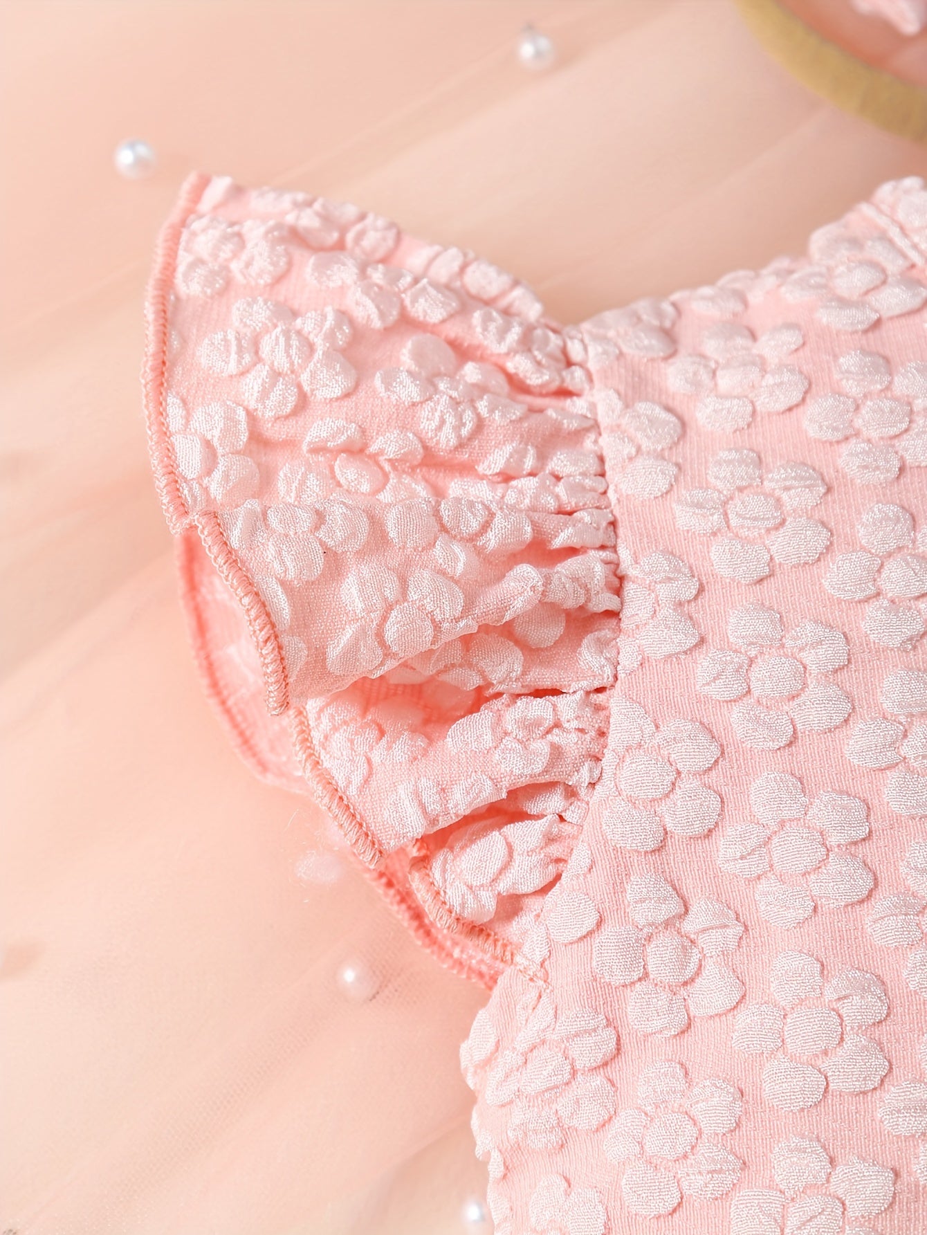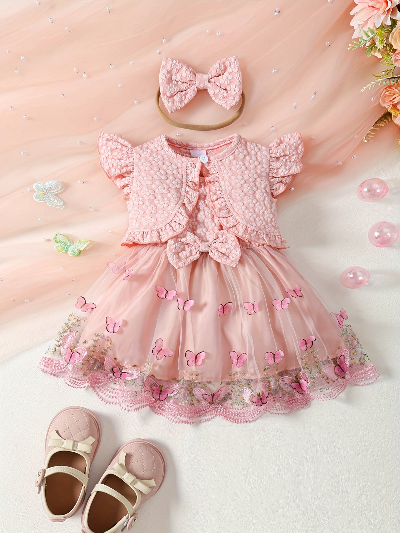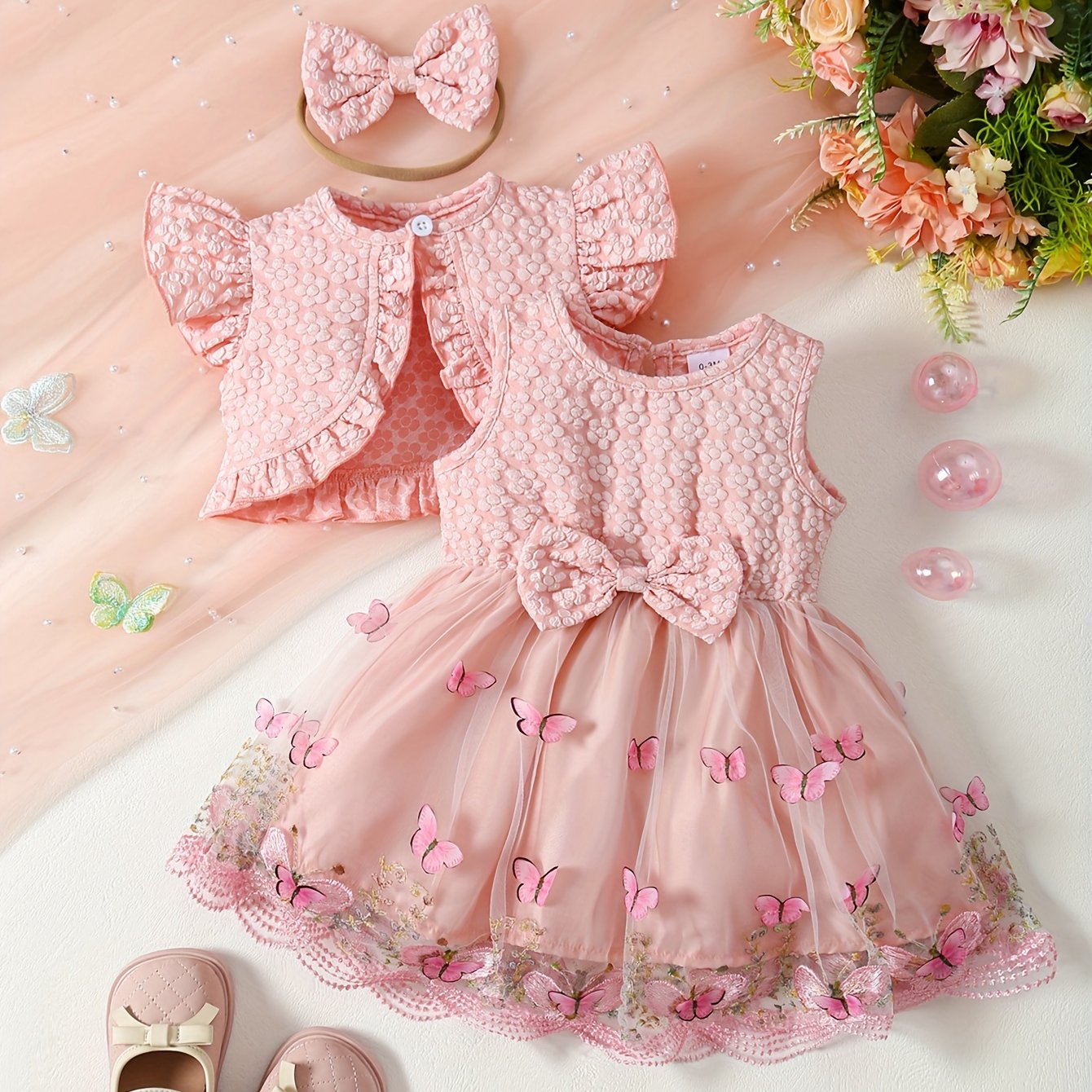 3-qismli qizlar yozgi kiyimi: Ruffle yengli, pushti kapalak bilan tikilgan tulladan yasalgan ko'ylak, polyesterdan yasalgan qirq qisma bluzka va bog'ichli boshband. Mashinada yuvish mumkin, maxsus tadbirlar yoki ochiq havoda kiyish uchun juda mos.