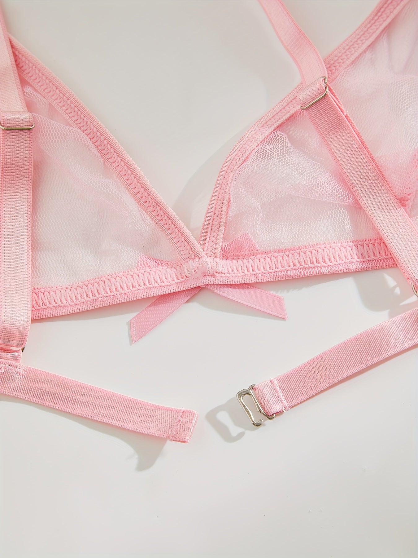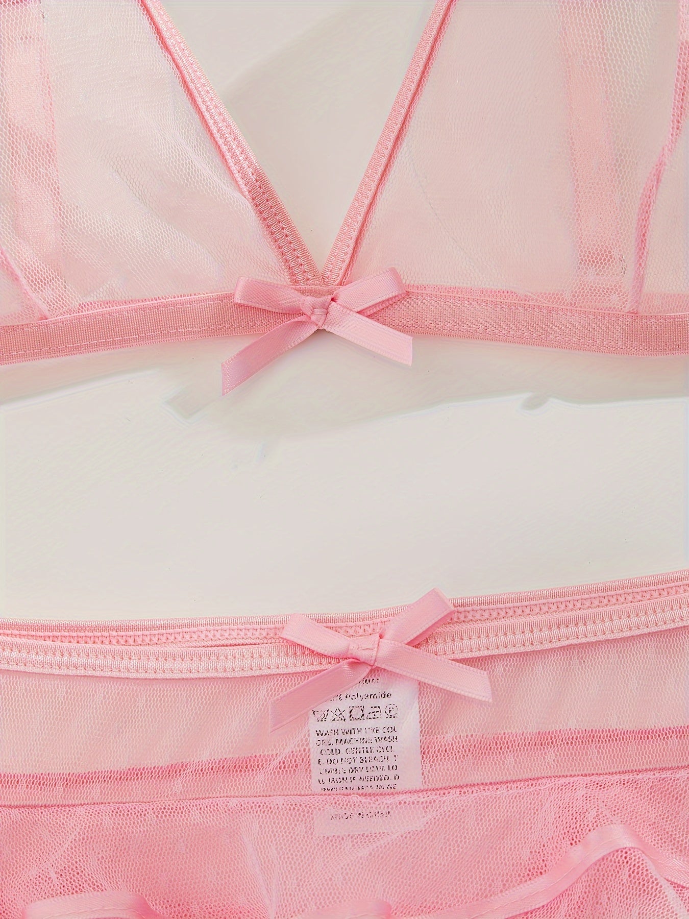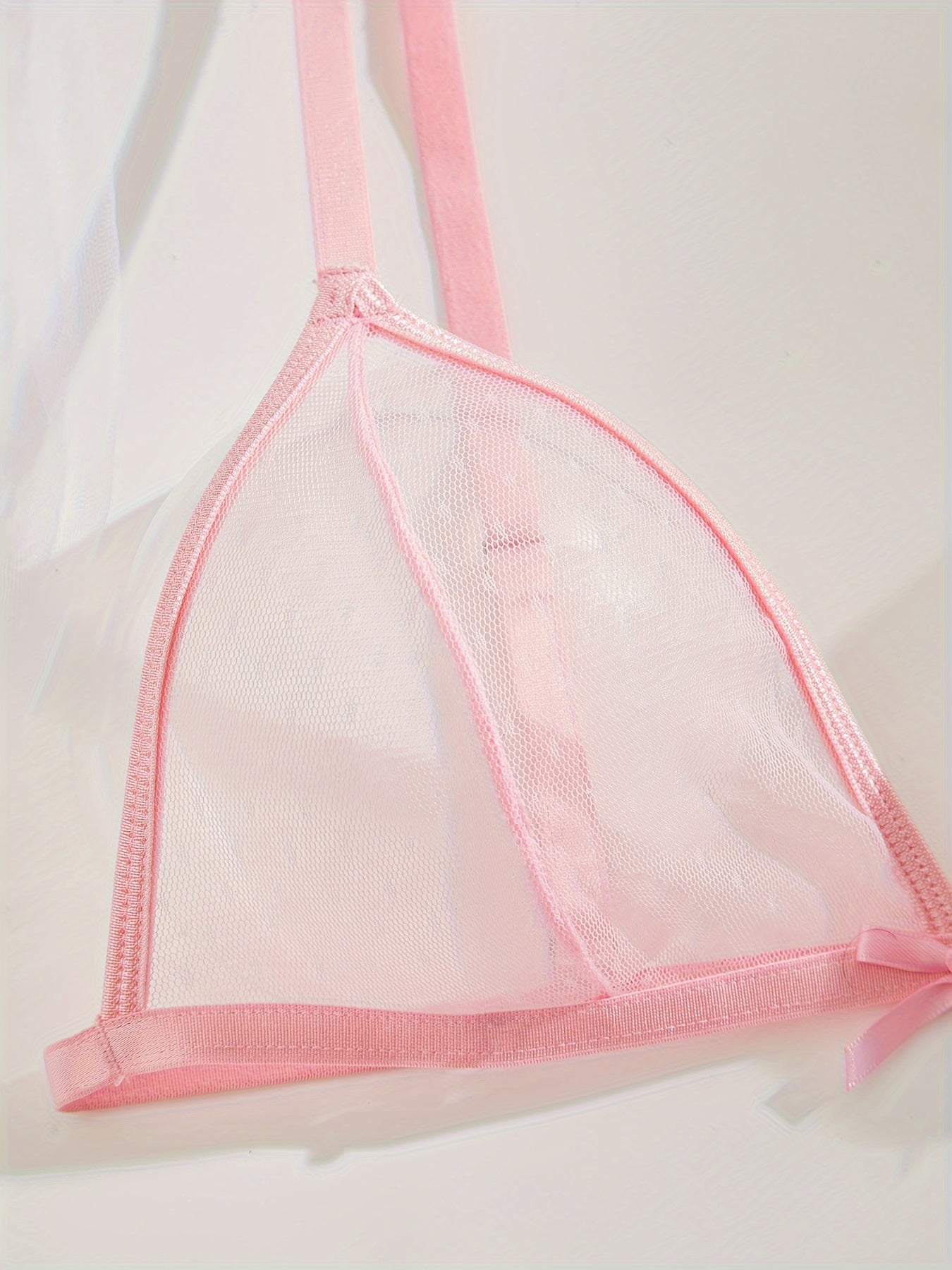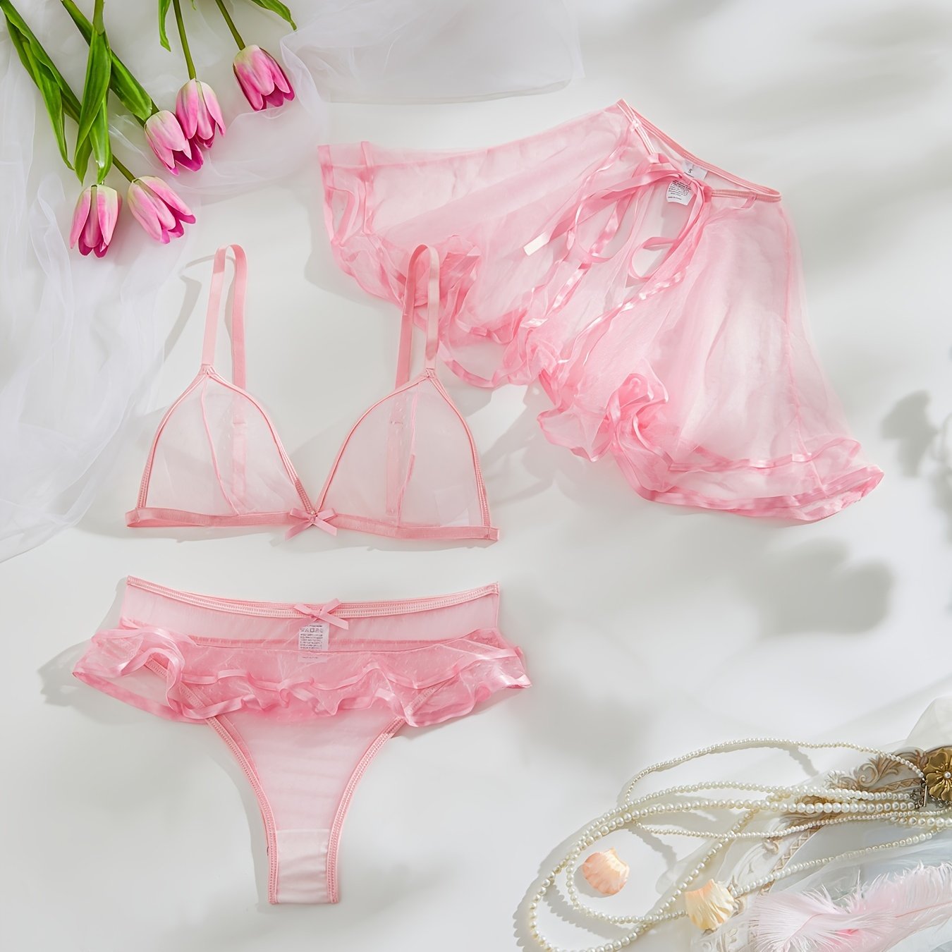 3-qismli pushti shaffof ichki kiyim to'plami ayollar uchun, pelerina, bralet va polka nuqta naqshidagi qirrali ichki kiyimdan iborat bo'lib, poliamid to'qima matosidan tayyorlangan. Nozik yotoqxona rol o'ynash uchun mukammal.
