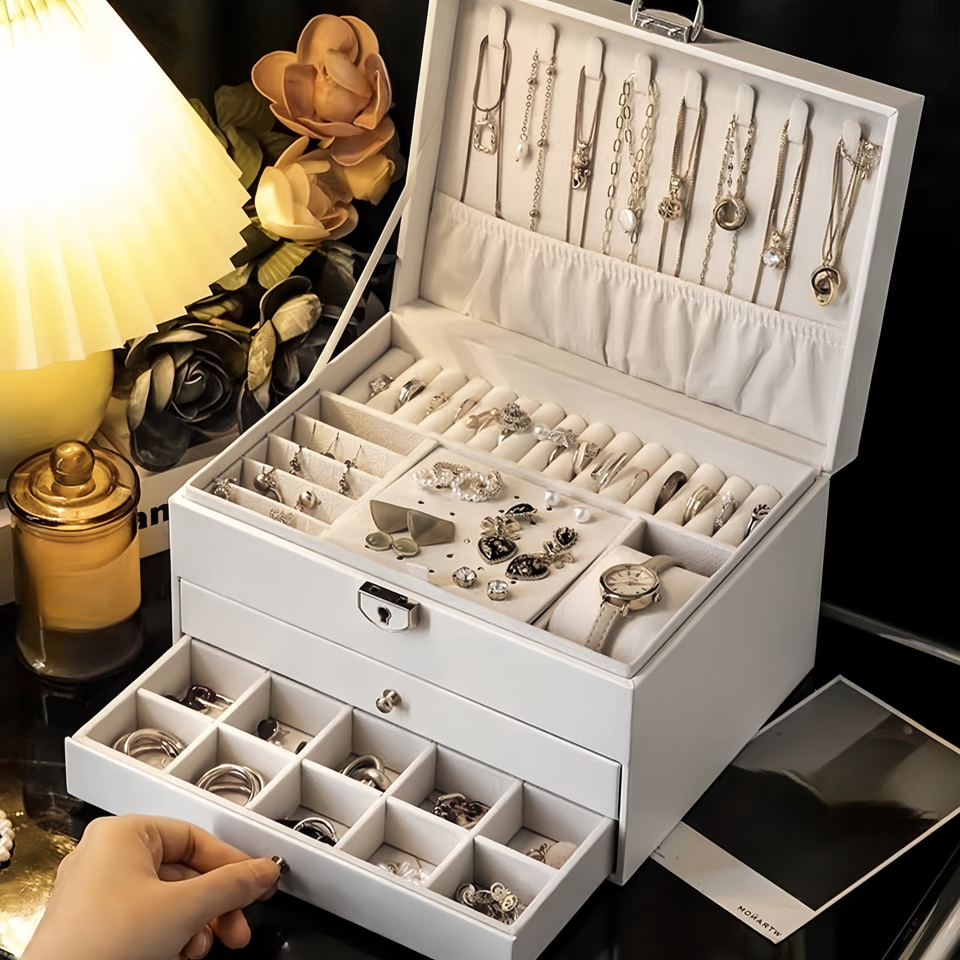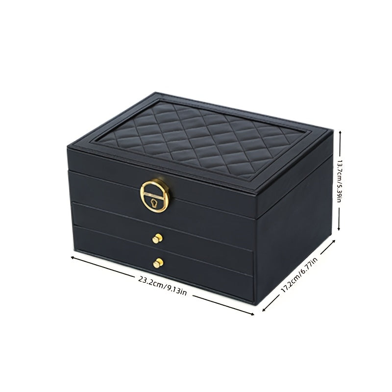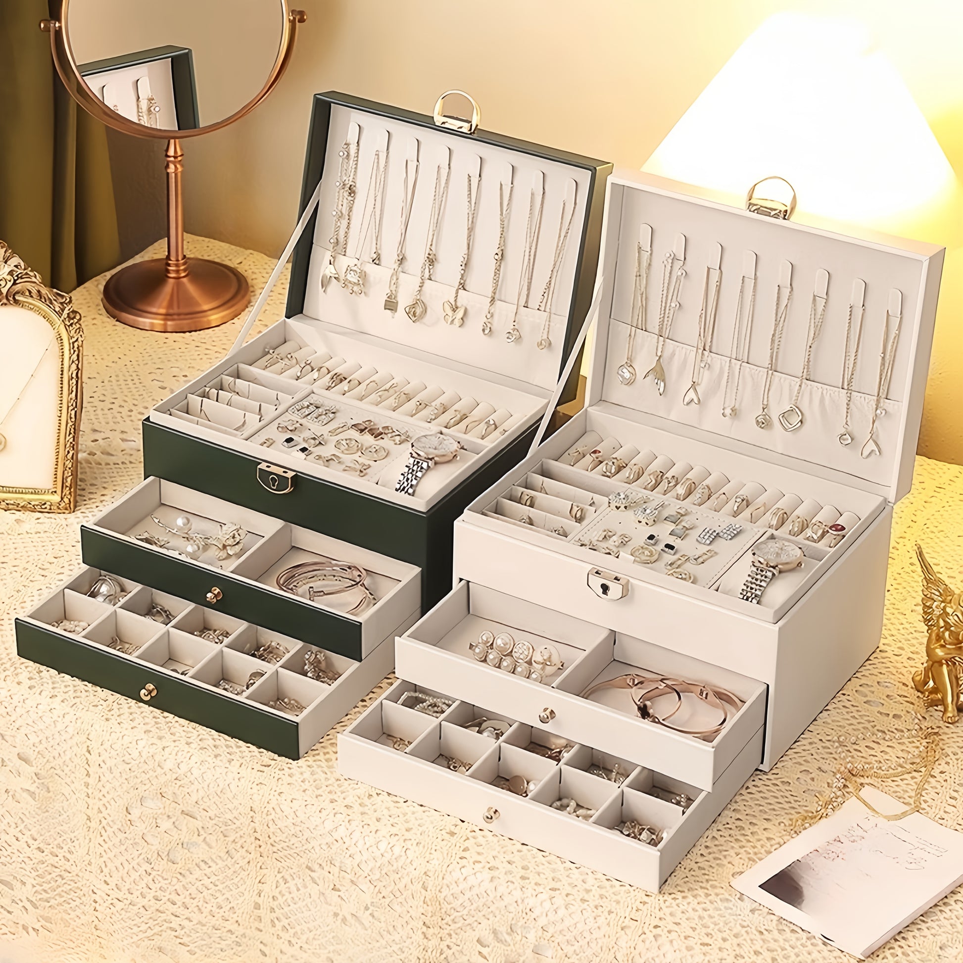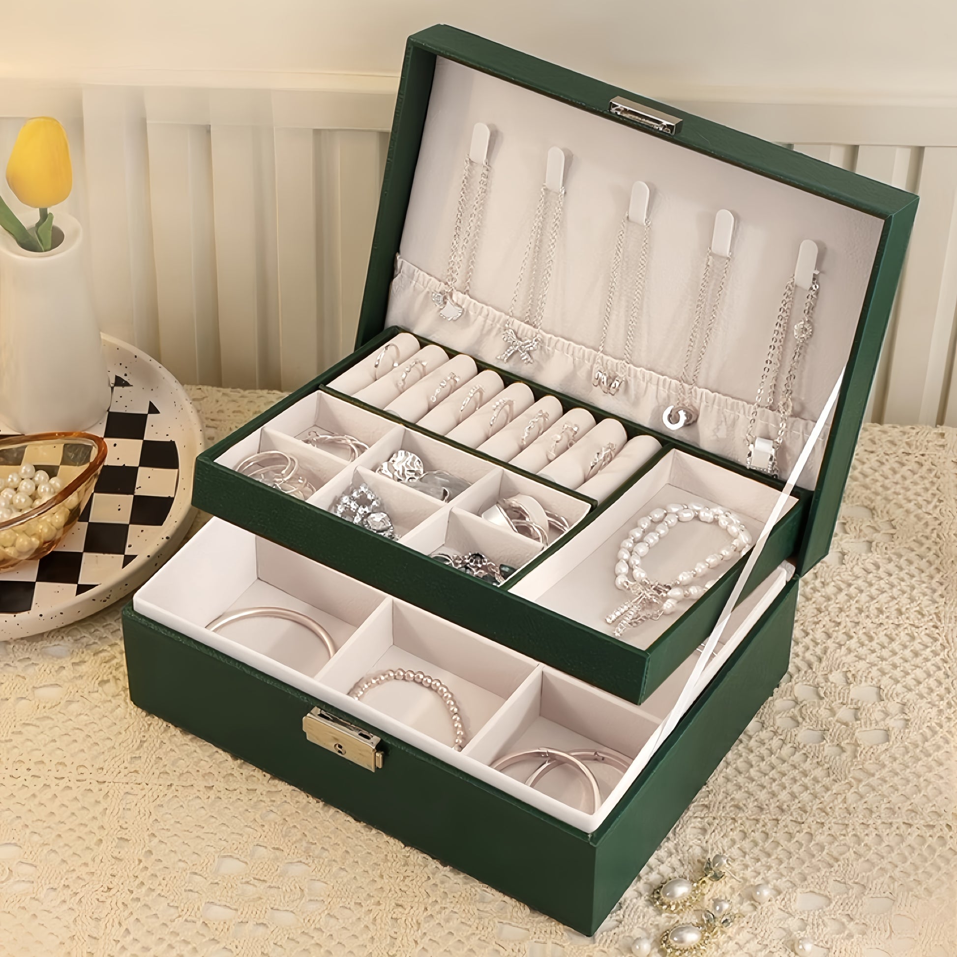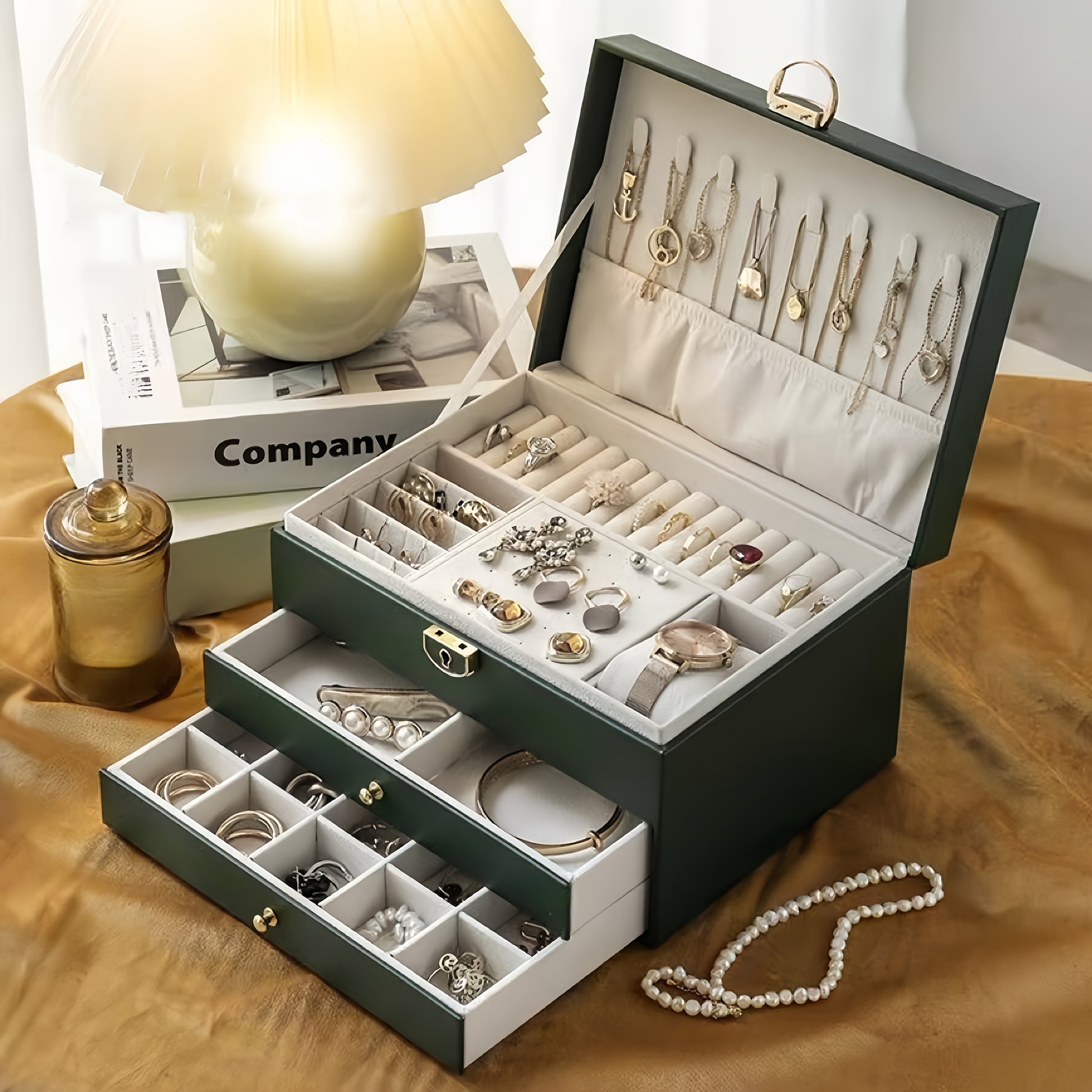 3-qavatli sun'iy charmli zargarlik saqlash qutisi, qulflangan, yumshoq qoplamali tortmalar. Marjonlar, bilakuzuklar, soatlar uchun keng joy. Yashil va oq ranglarda mavjud. Ayollar uchun mukammal sovg'a va