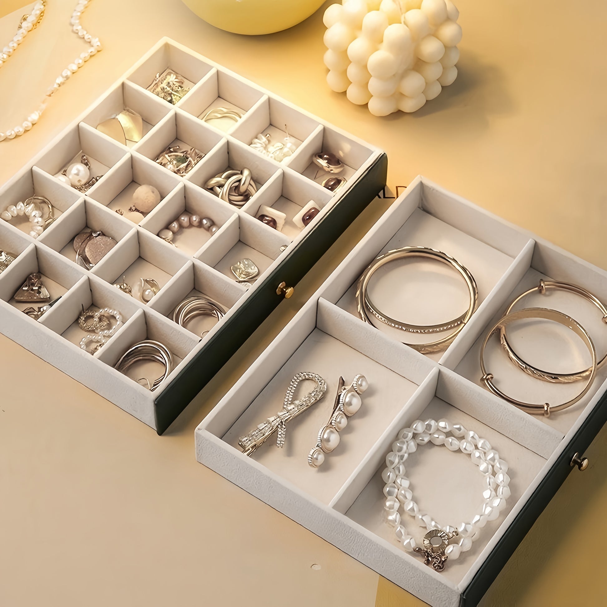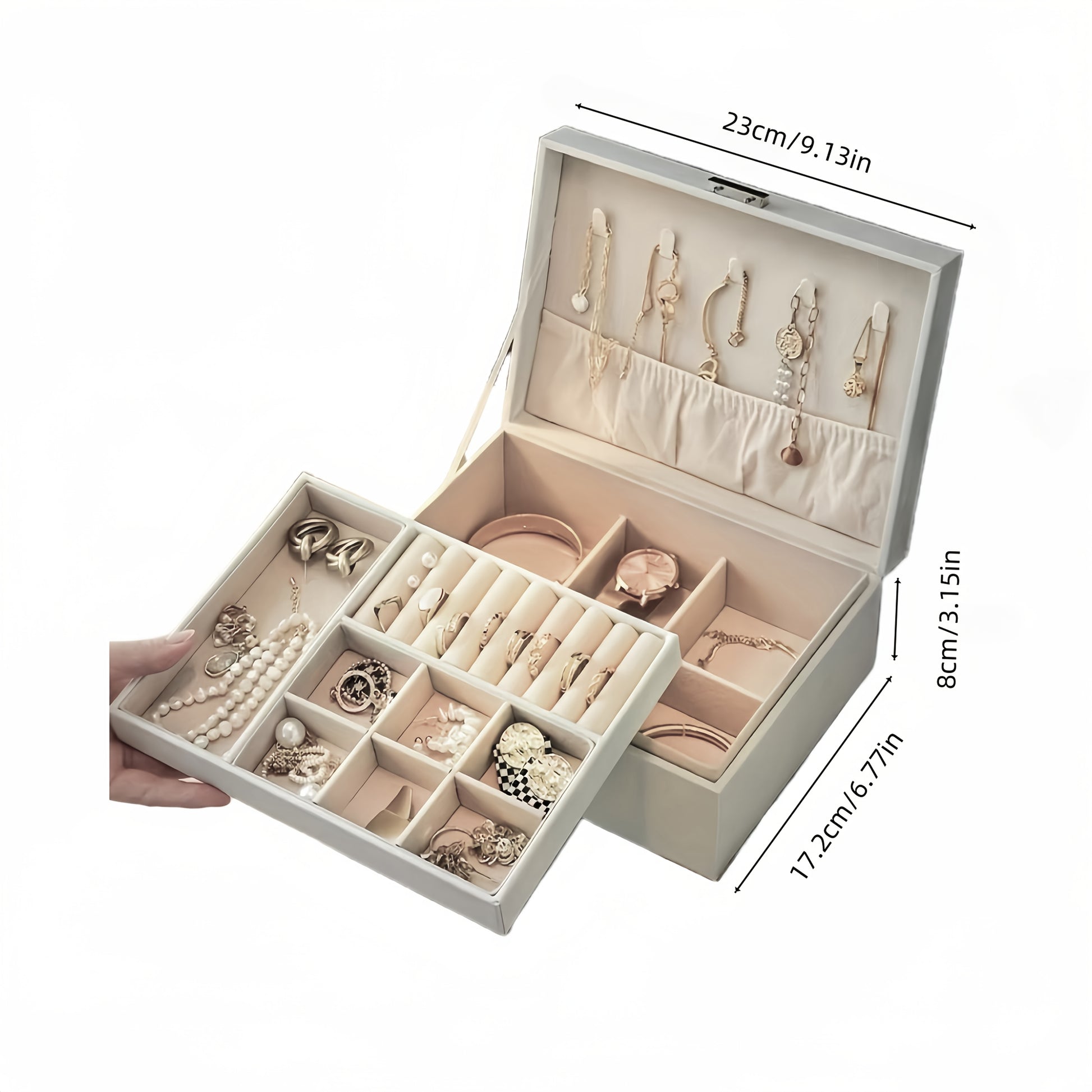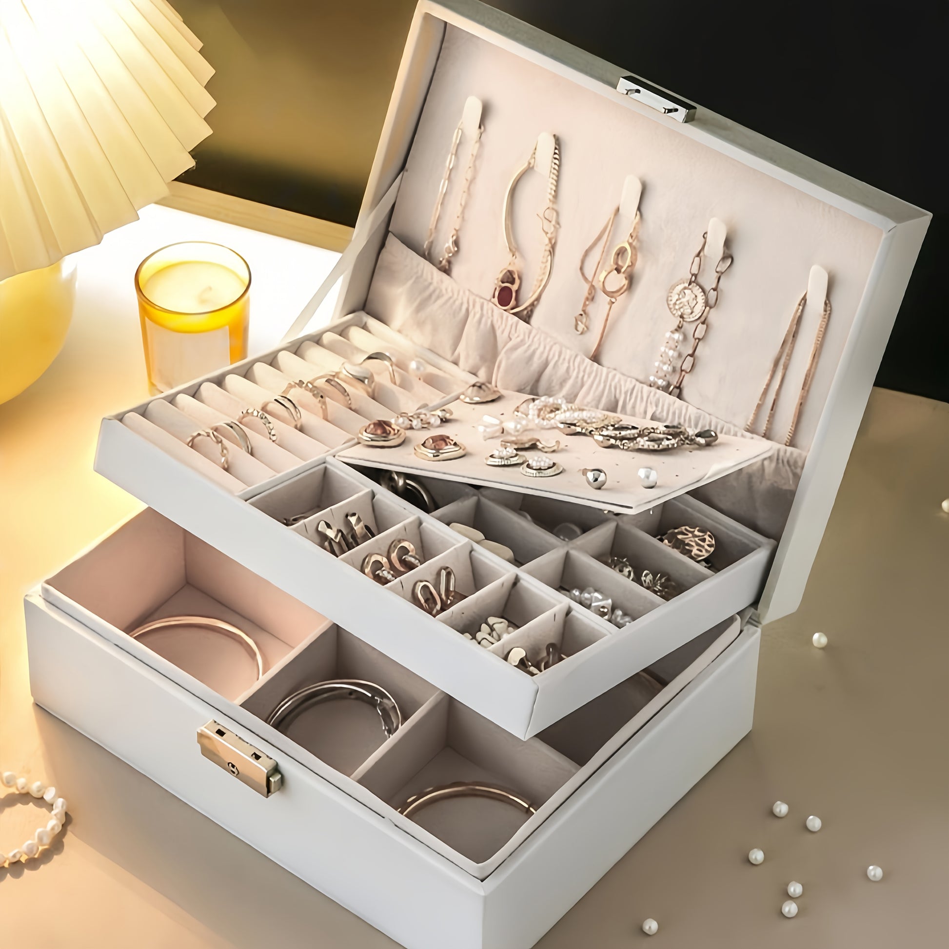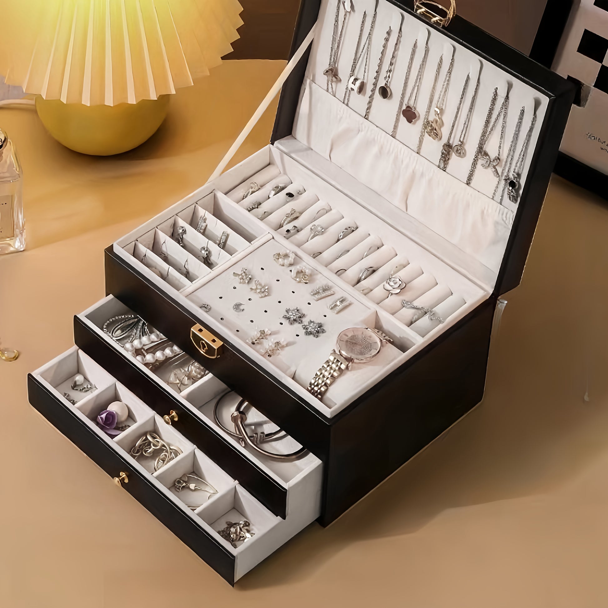 3-qavatli sun'iy charmli zargarlik saqlash qutisi, qulflangan, yumshoq qoplamali tortmalar. Marjonlar, bilakuzuklar, soatlar uchun keng joy. Yashil va oq ranglarda mavjud. Ayollar uchun mukammal sovg'a va