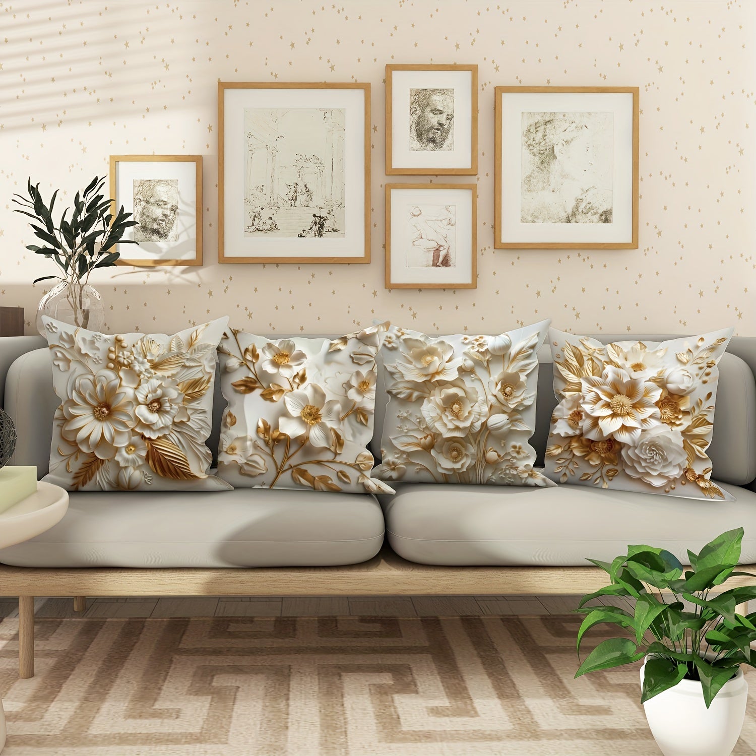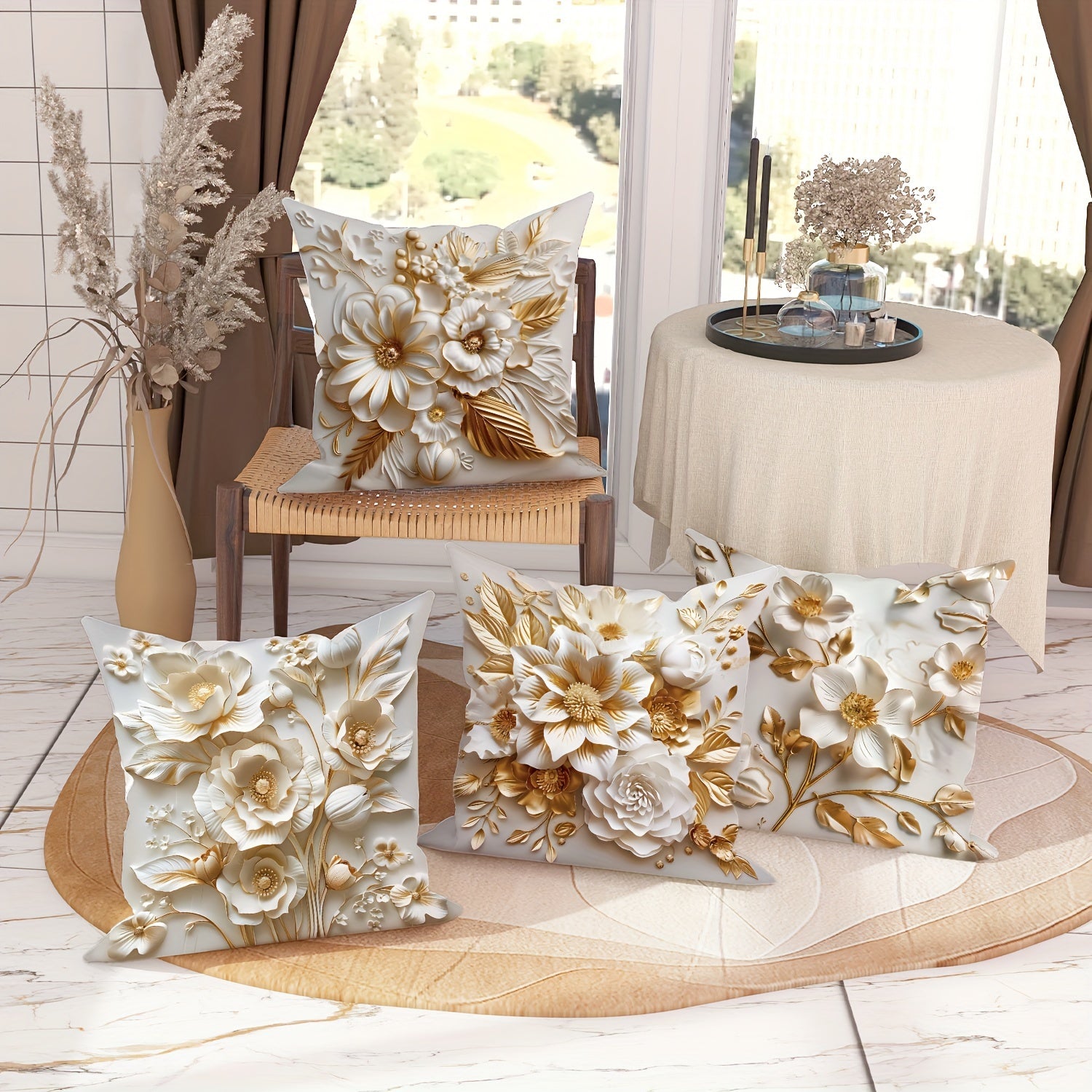 4 ta 3D gullar dizayni bilan oq oltin rangdagi velur yostiq qoplamalari, o'lchami 45.72*45.72 sm, yoz va kuzda yashash xonasi yoki yotoq xonasi divanini bezash uchun mukammal.