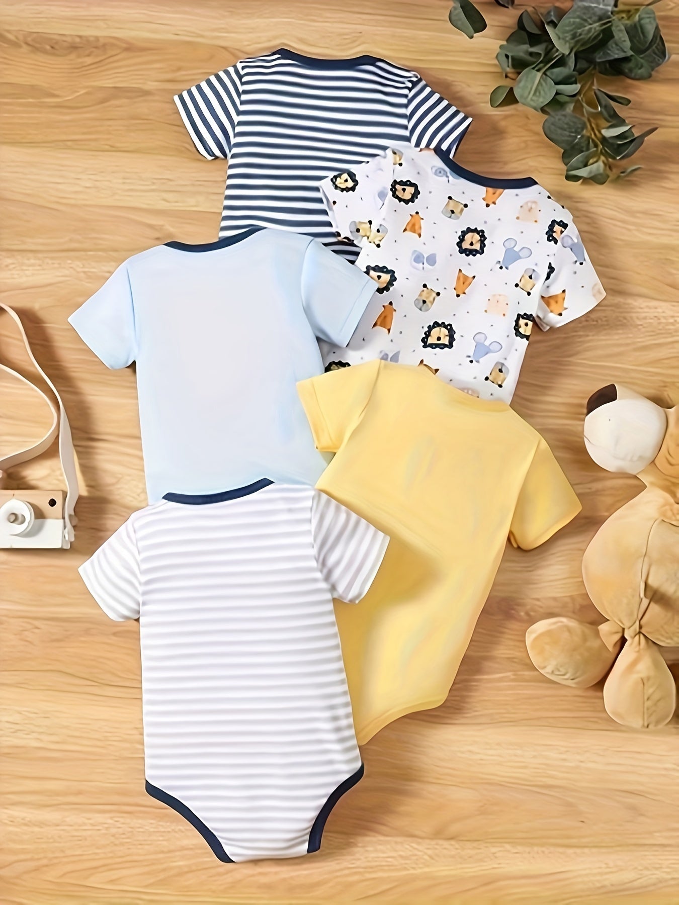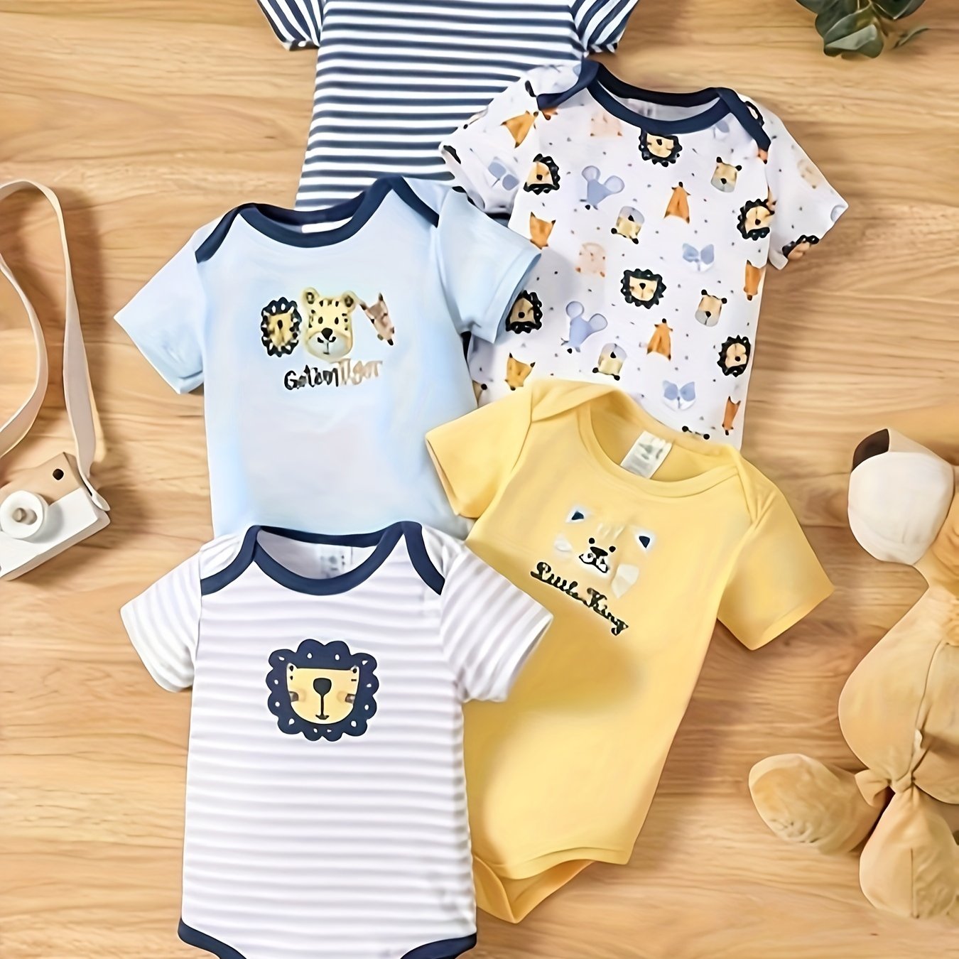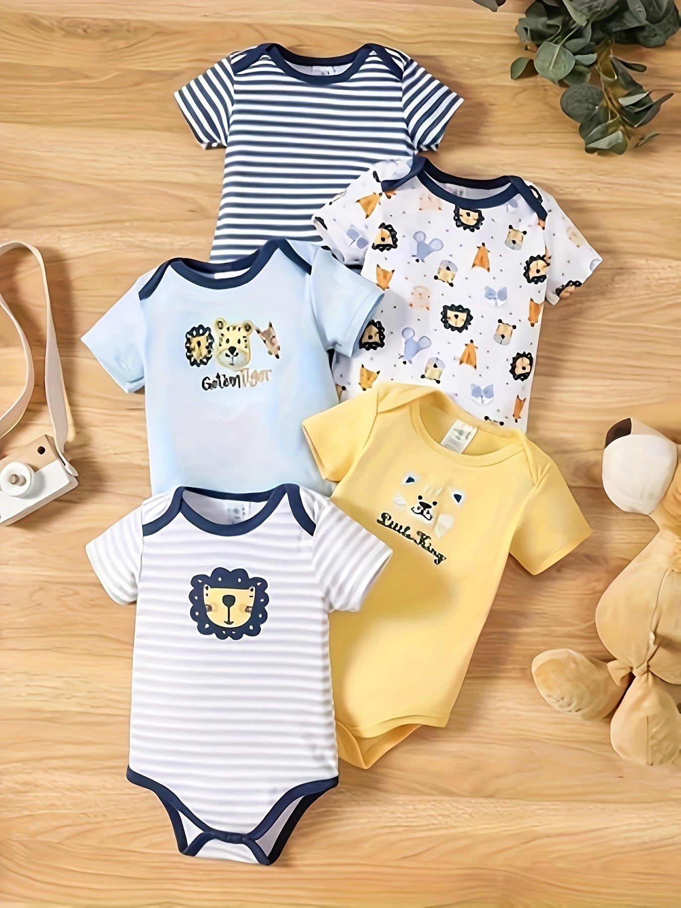 Kichkina erkaklar uchun kombinezonlar 5 ta paket, qisqa qo‘l, paxta yozgi kiyimlar, multfilm sher va chiziqli naqsh bilan