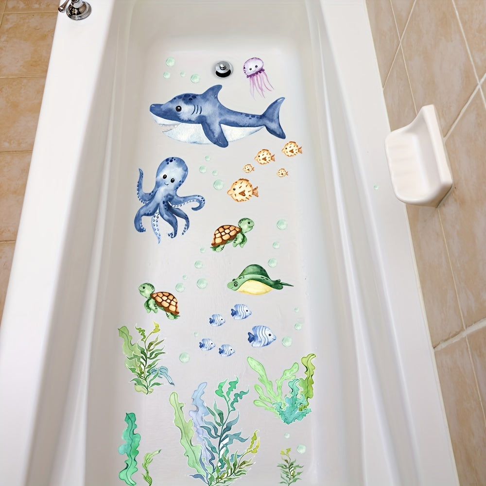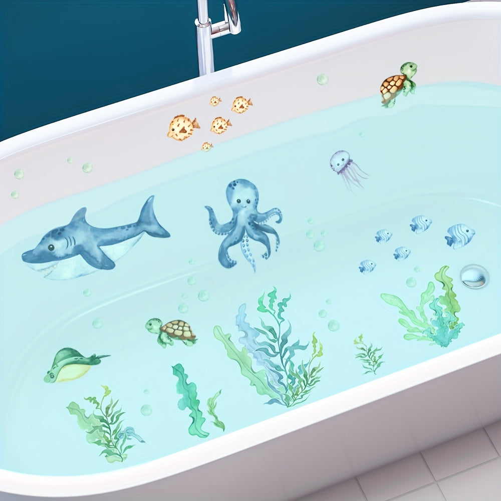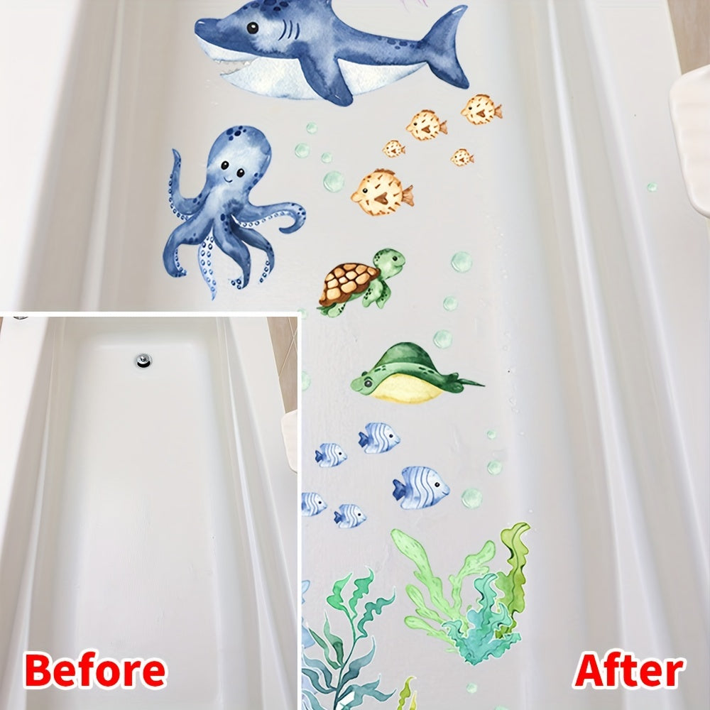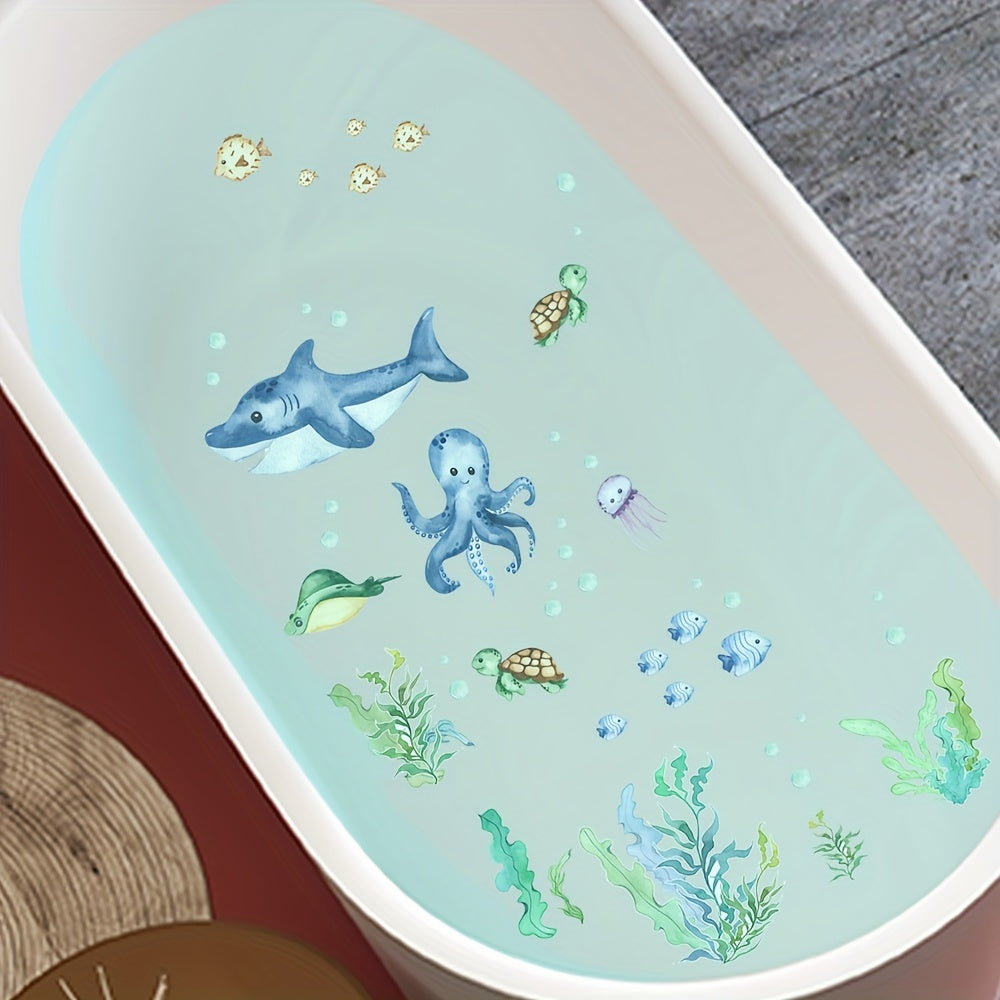 6 ta suv o'tkazmaydigan vanna stikerlari, shark, dengiz o'ti va kalmar naqshlari bilan, sirpanishni oldini olish uchun.