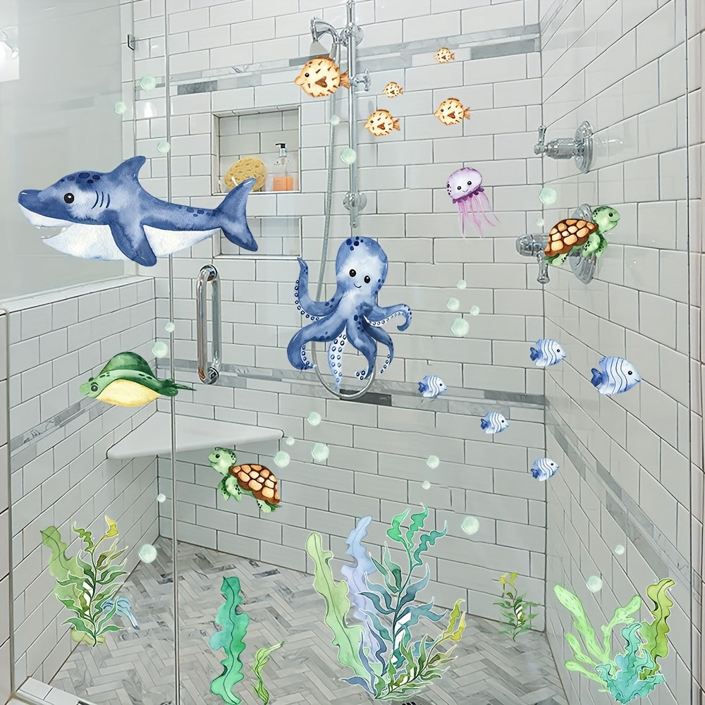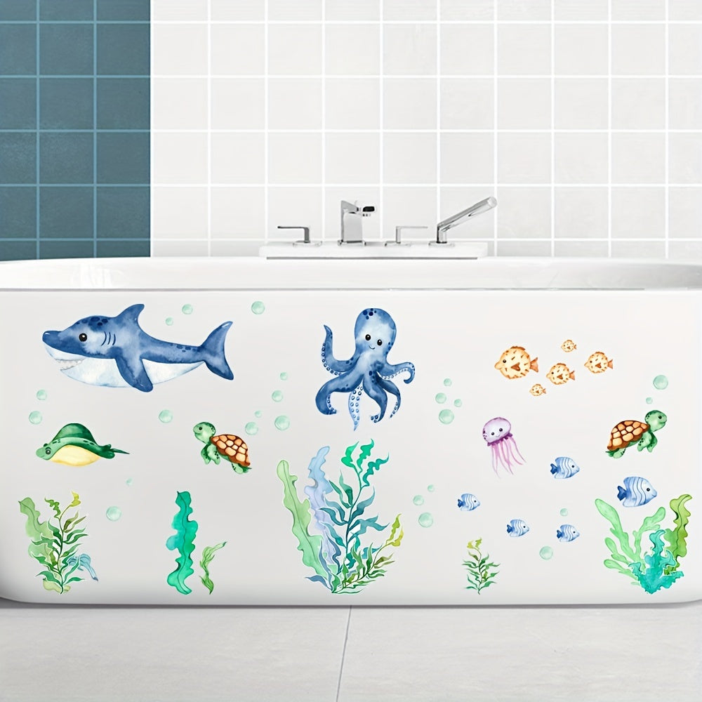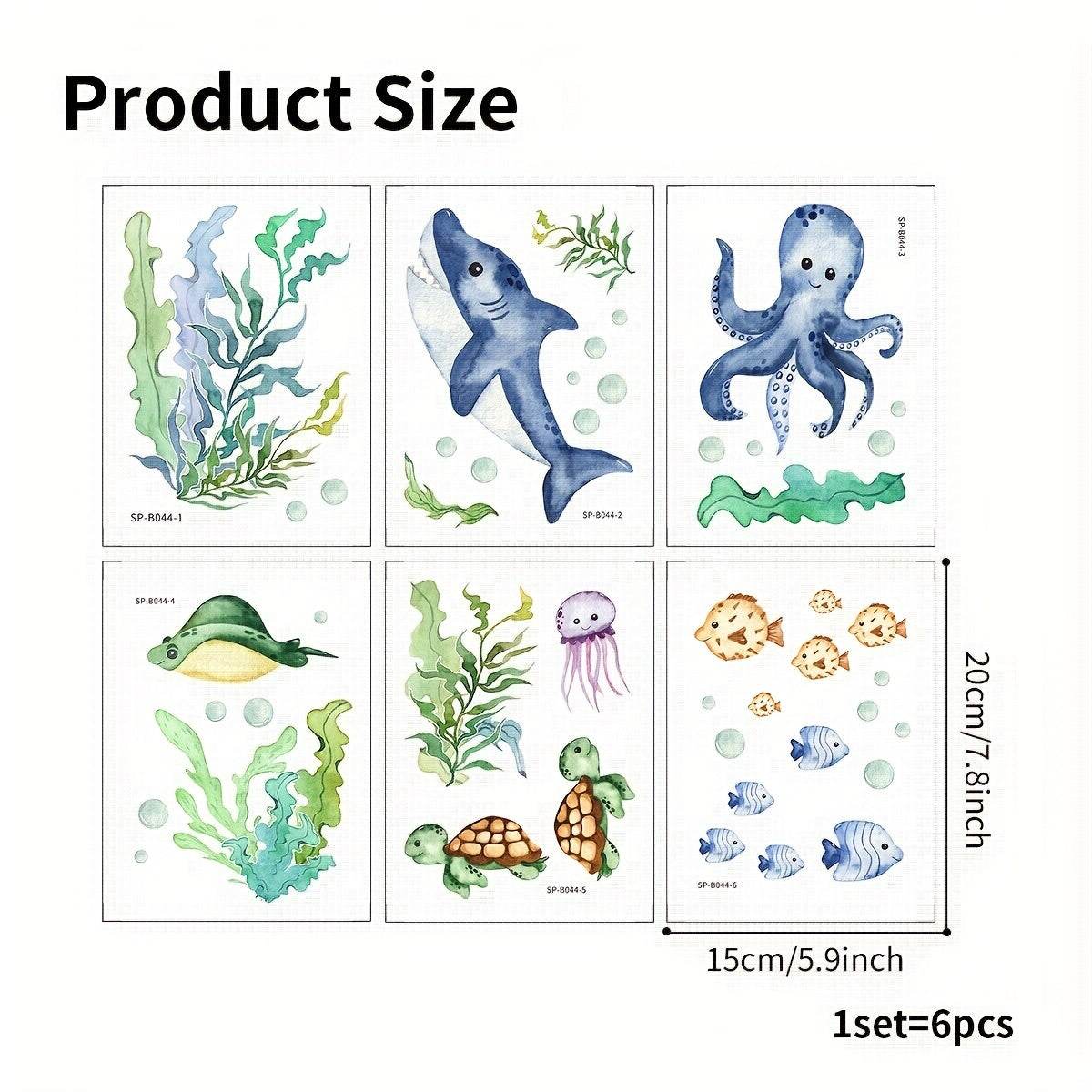6 ta suv o'tkazmaydigan vanna stikerlari, shark, dengiz o'ti va kalmar naqshlari bilan, sirpanishni oldini olish uchun.