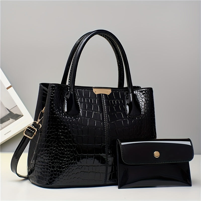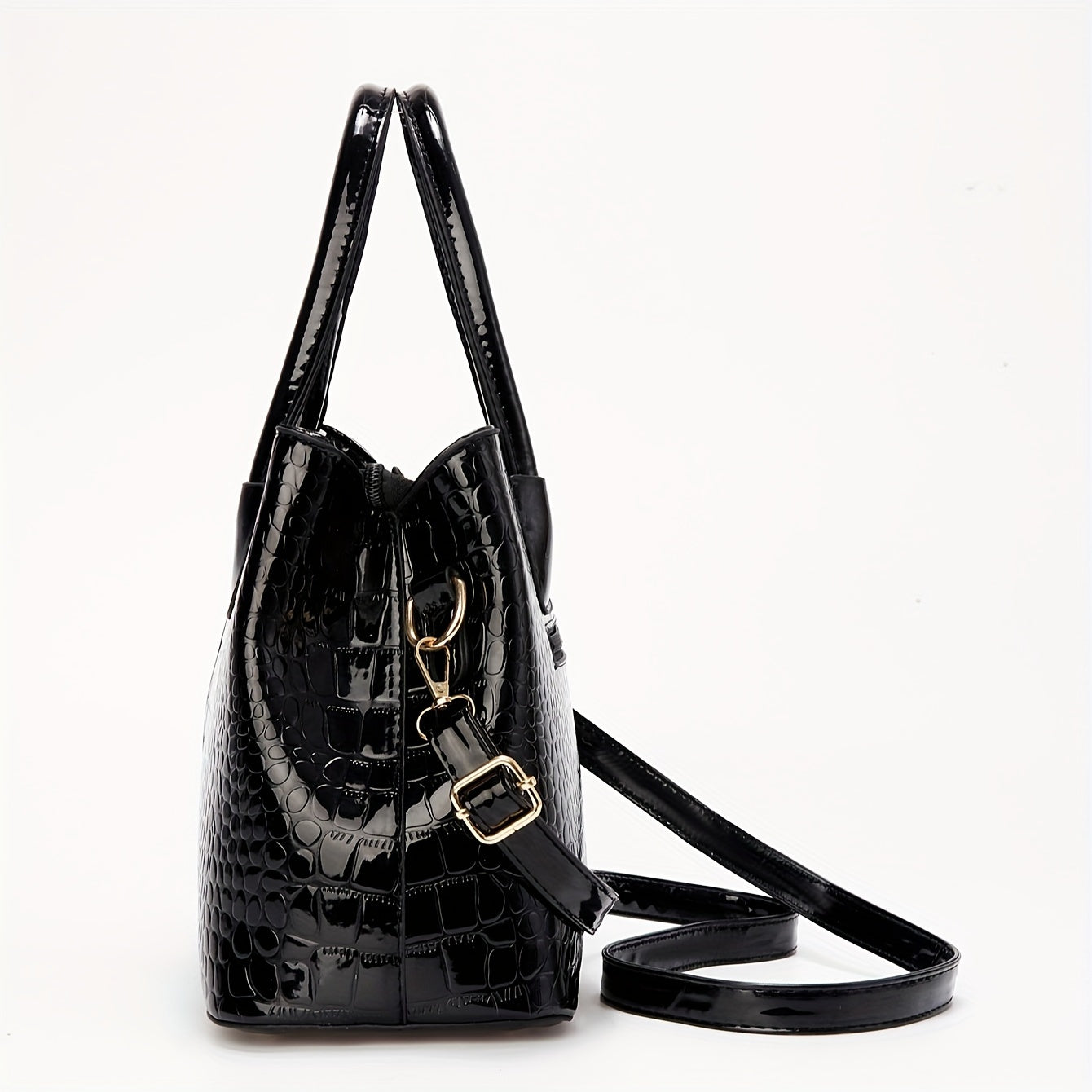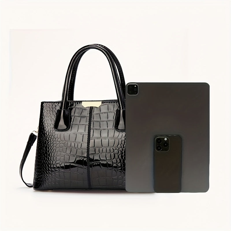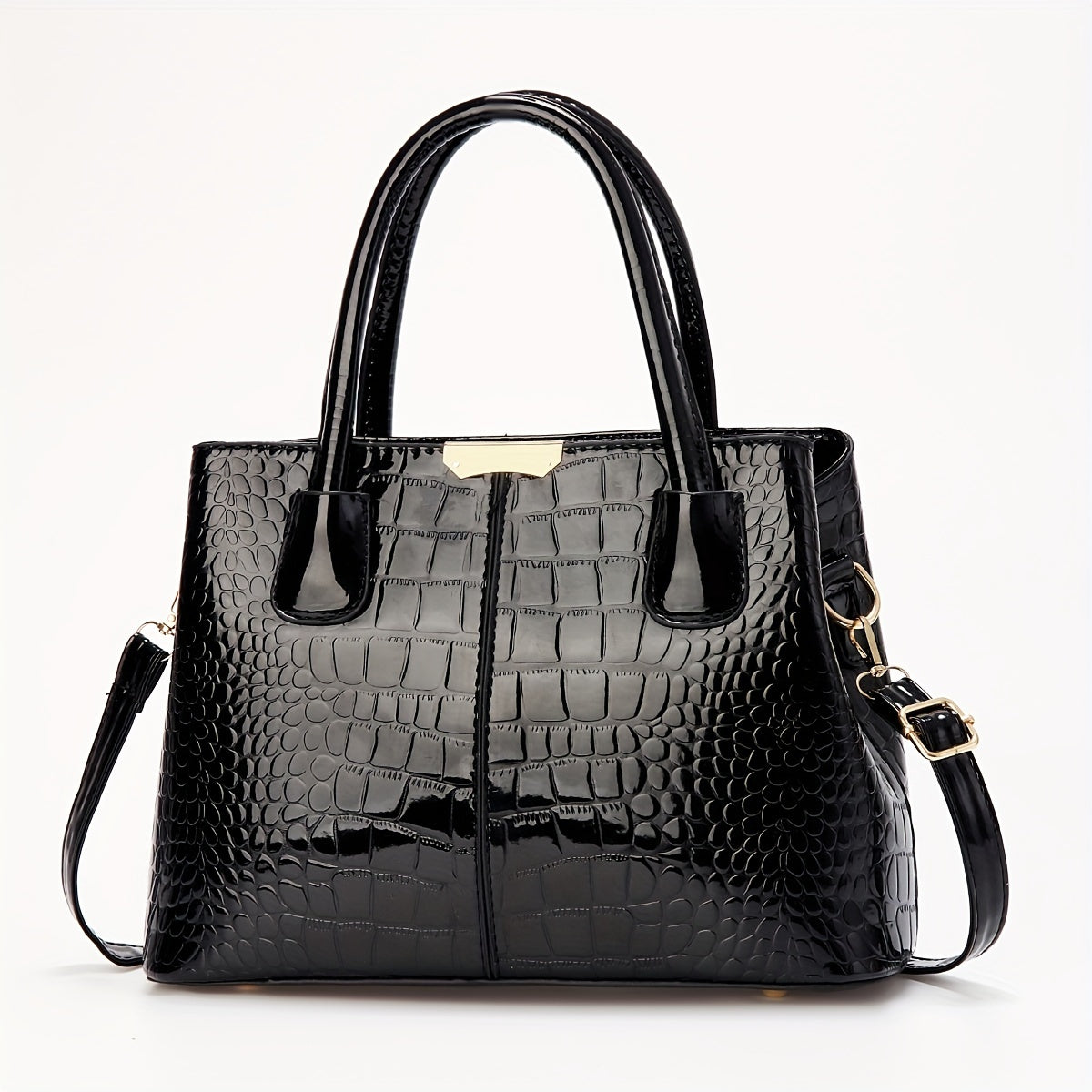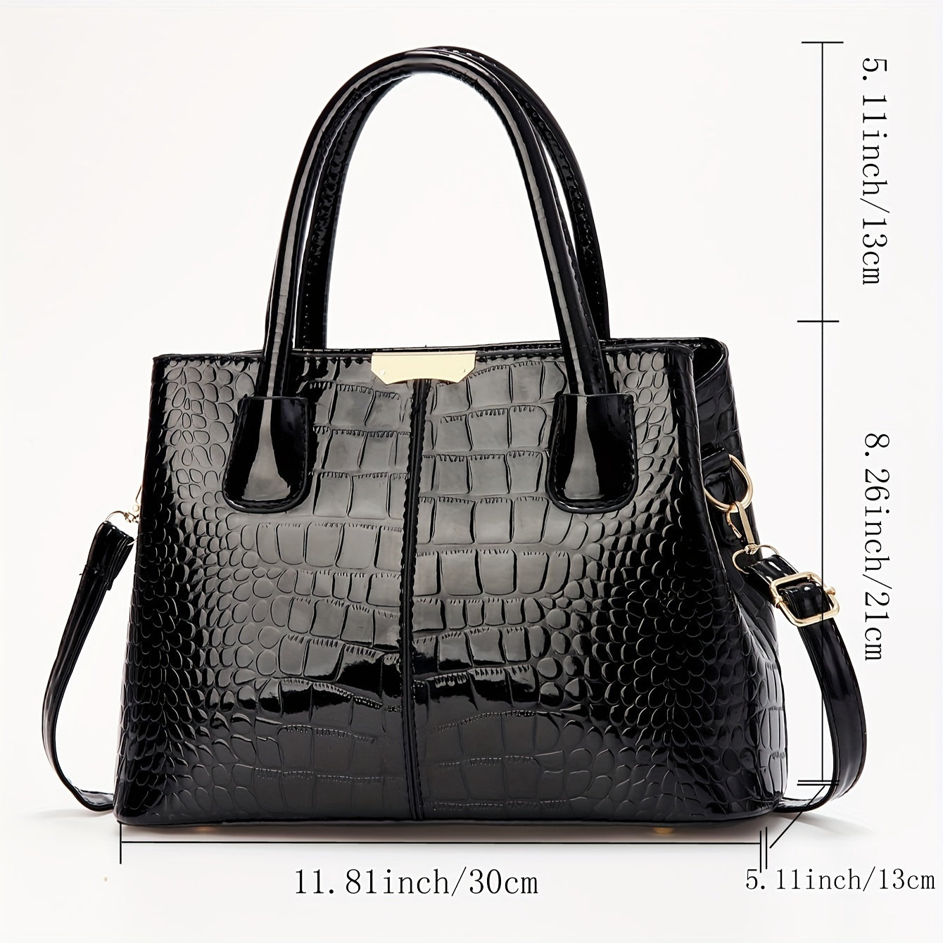 Kara krokodil naqshli sumka, katta sig‘imi va sozlanadigan kamar bilan, nafis tadbirlar uchun