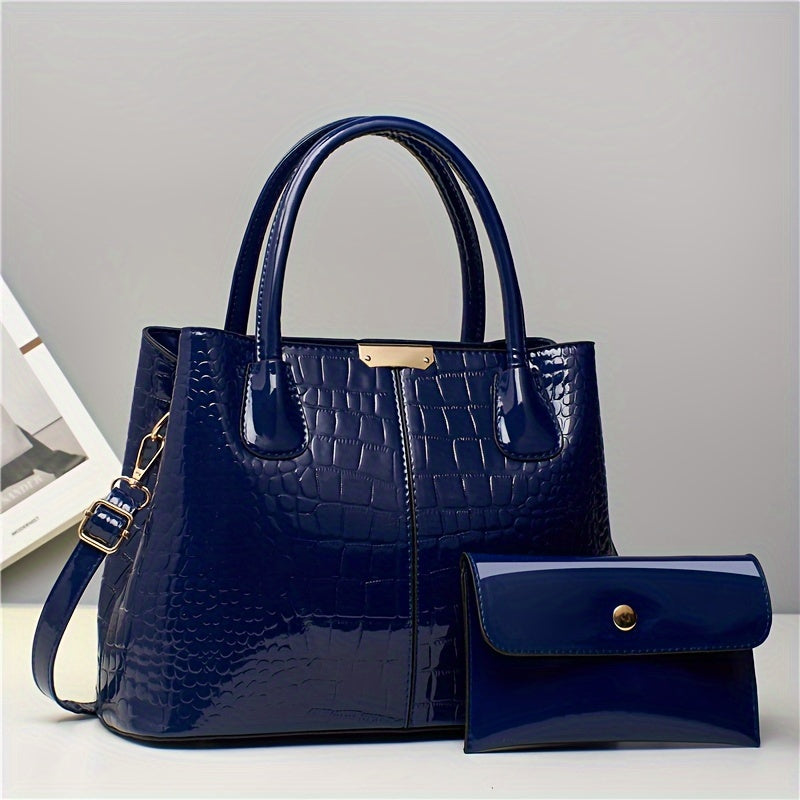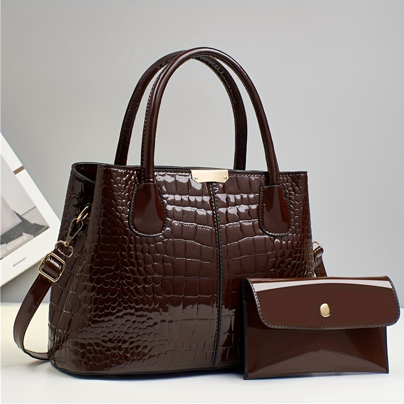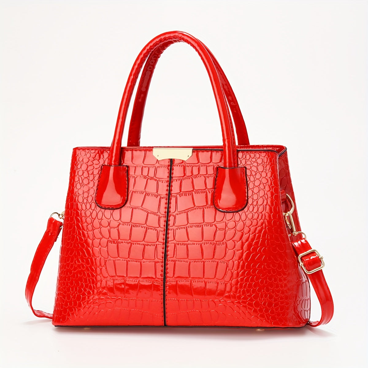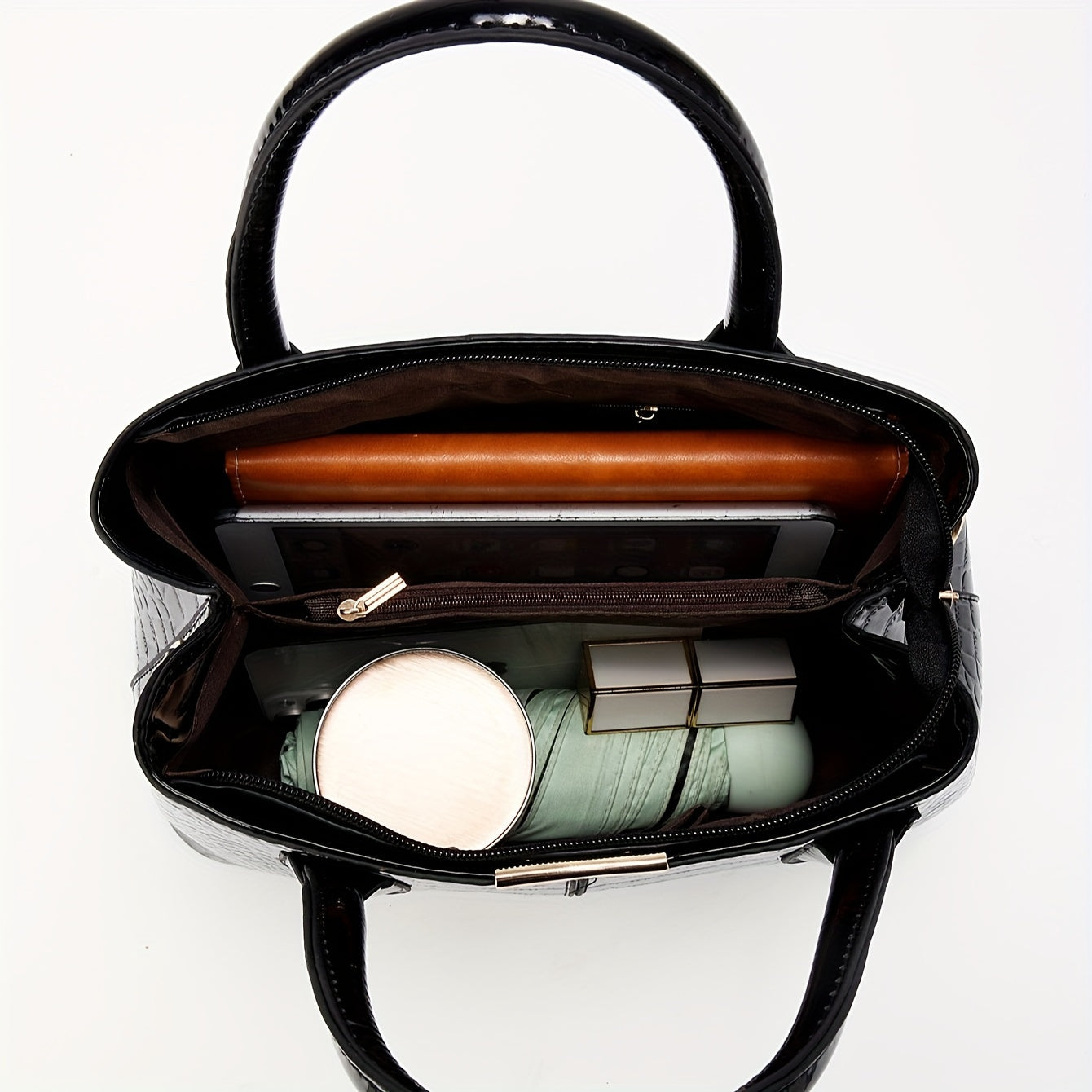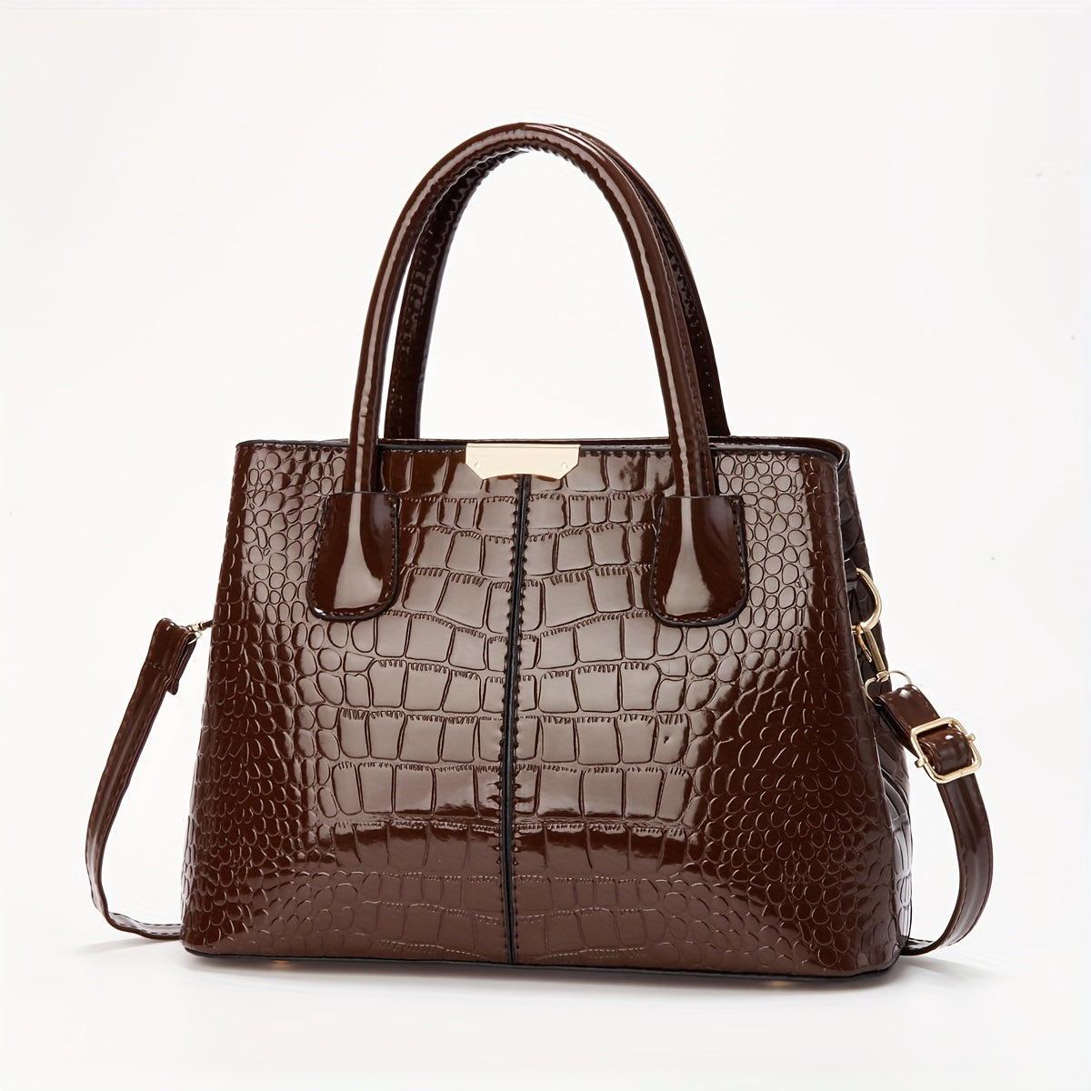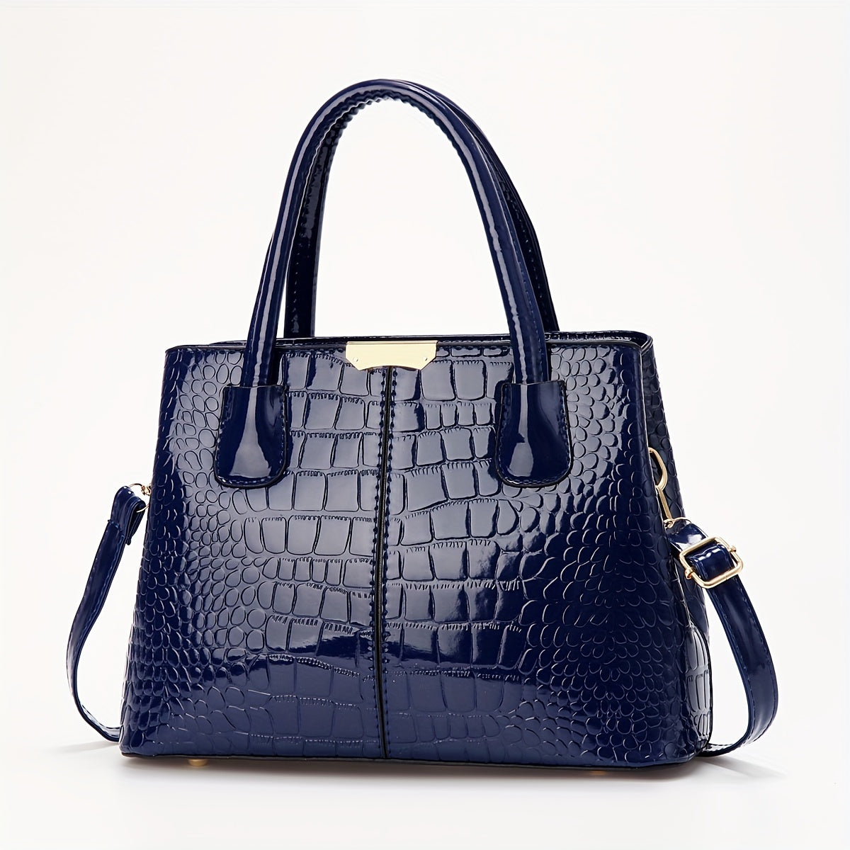 Kara krokodil naqshli sumka, katta sig‘imi va sozlanadigan kamar bilan, nafis tadbirlar uchun
