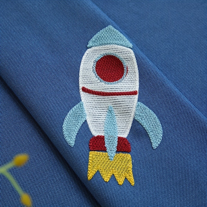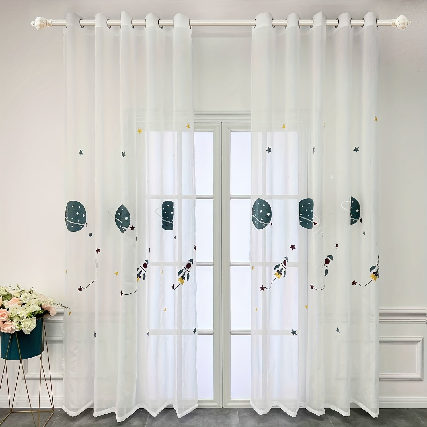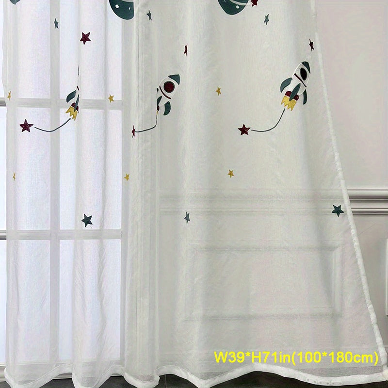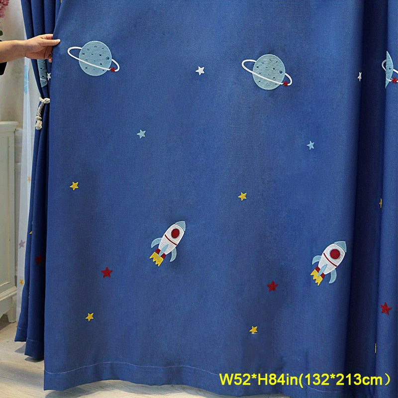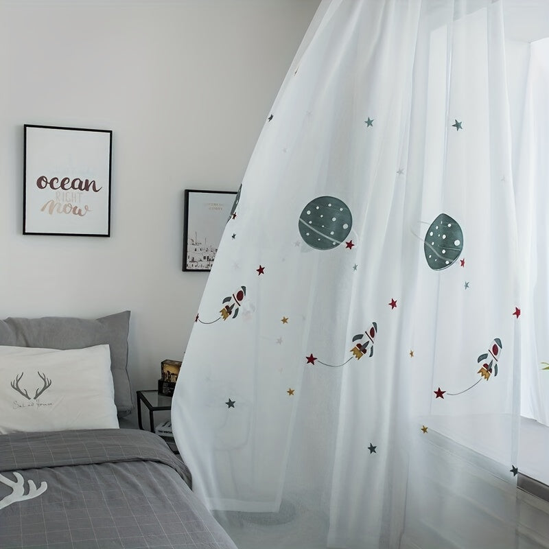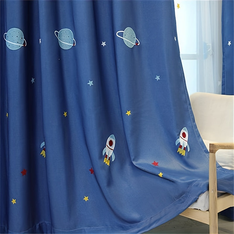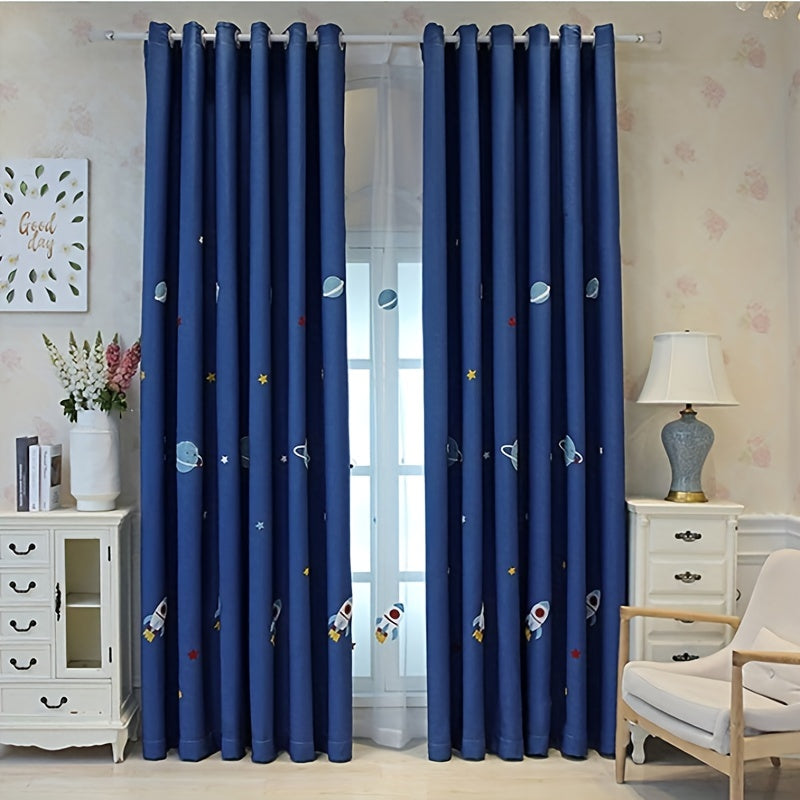 Dengiz ko'k rangli sun'iy flaxdan yasalgan parda, bolalar uchun chizilgan naqshlar bilan, yotoqxona derazasi uchun oq kosmik bolalar chizilgan tül pardasi bilan birga.