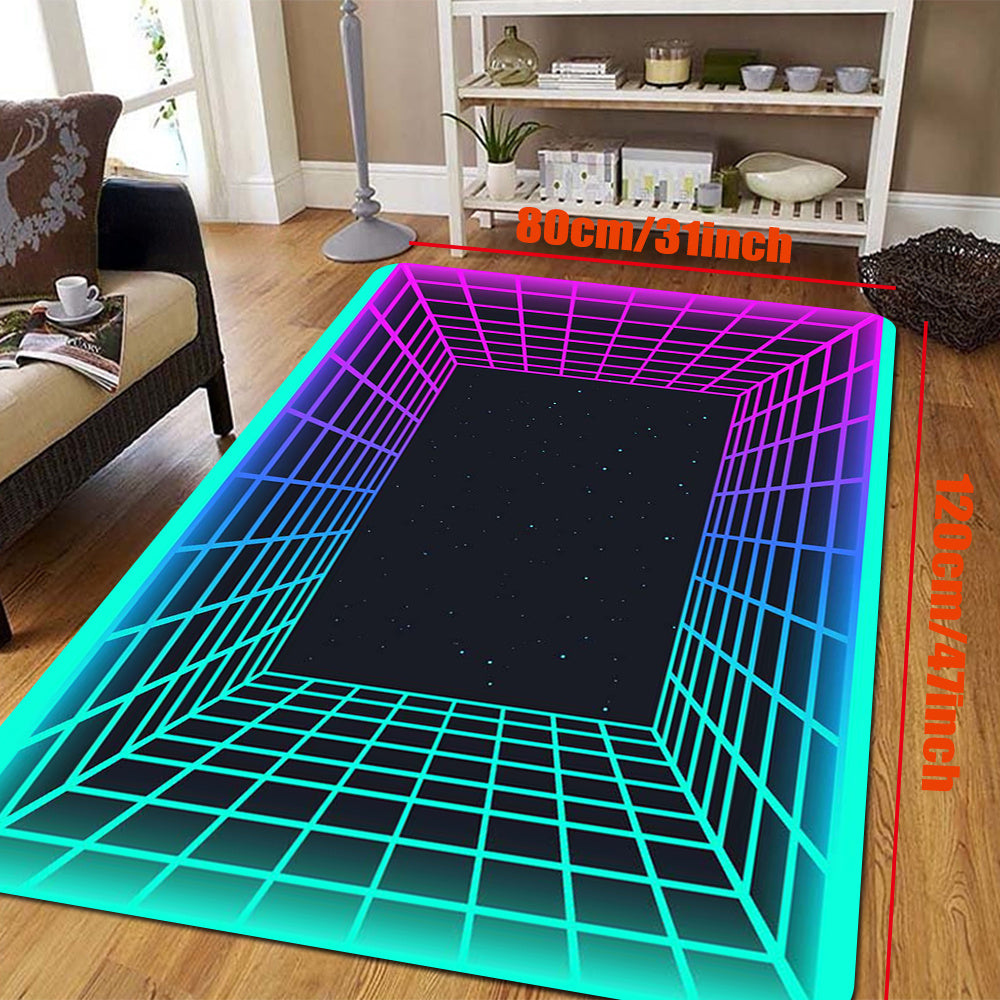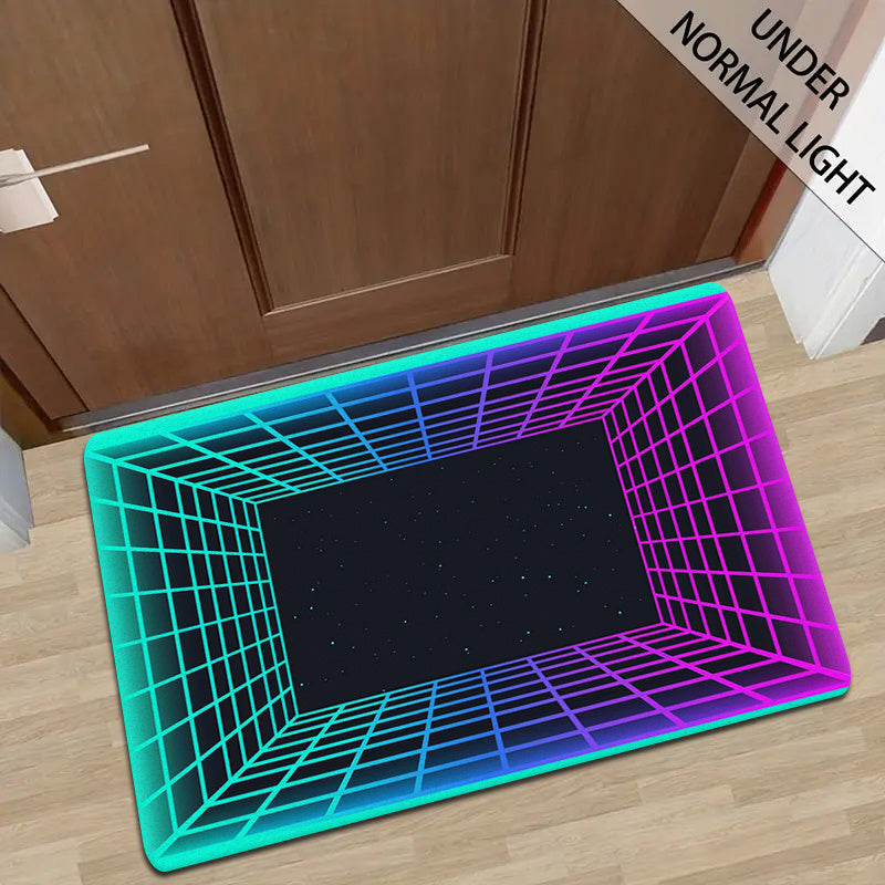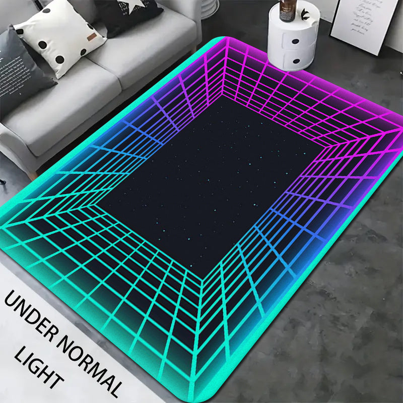 Bir dona Glow In The Dark Flannel Gilam, qo'shimcha qulaylik uchun 1.2 sm qalinlikdagi ko'pik bilan. Ushbu gilam UV qora yorug'lik ostida fluorescent nur chiqaradi va no'vli orqa qismga ega. Qiziqarli neon doira bosmasi bilan, bu Hippie ilhomlangan gilam