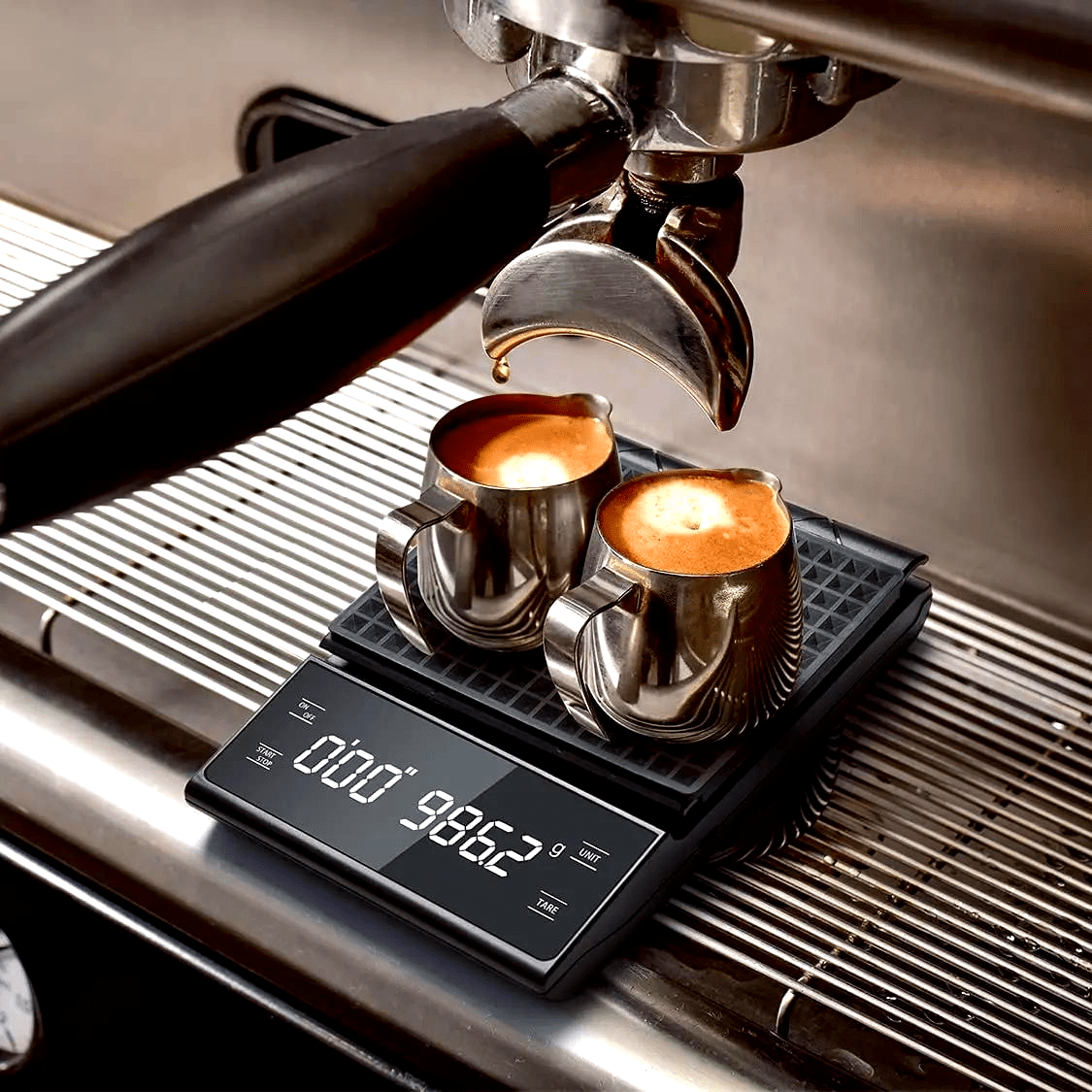 Aniq tomchilatish qahva tarozisi va vaqt o'lchagich - 3 kg gacha o'lchaydi, 0.1 g aniqlikda, orqa yoritilgan LCD ekran, quyish va espresso tayyorlash uchun batareyalar kerak emas.