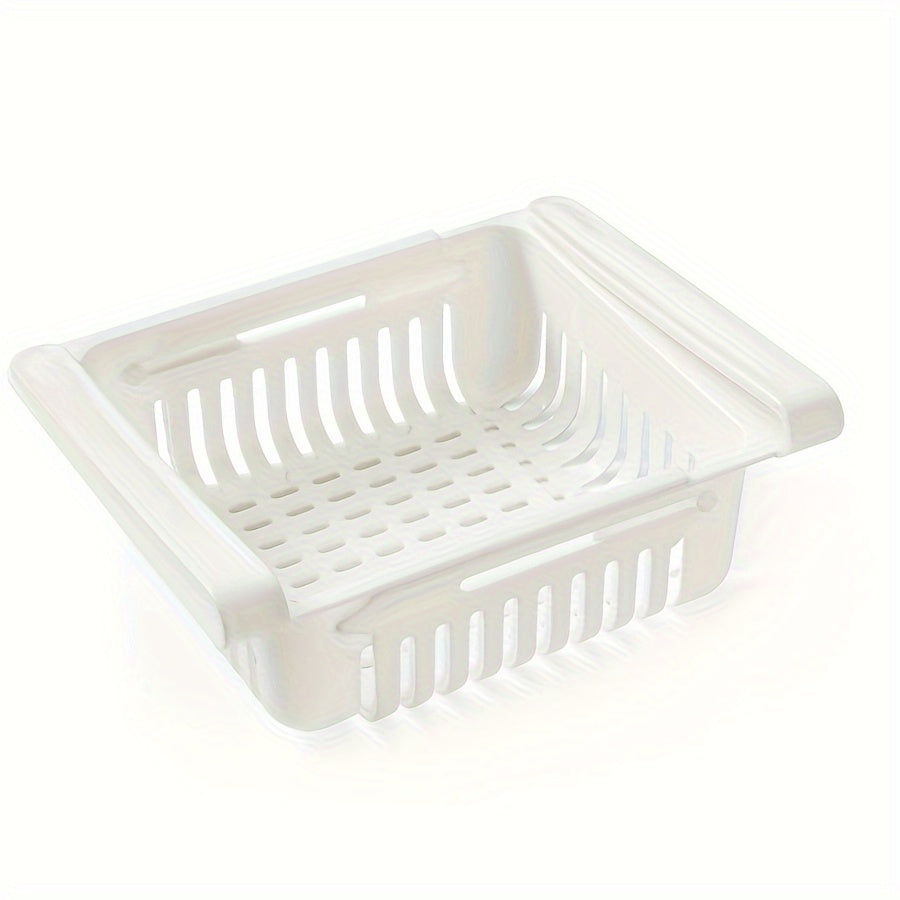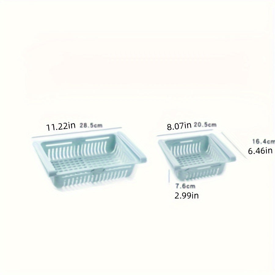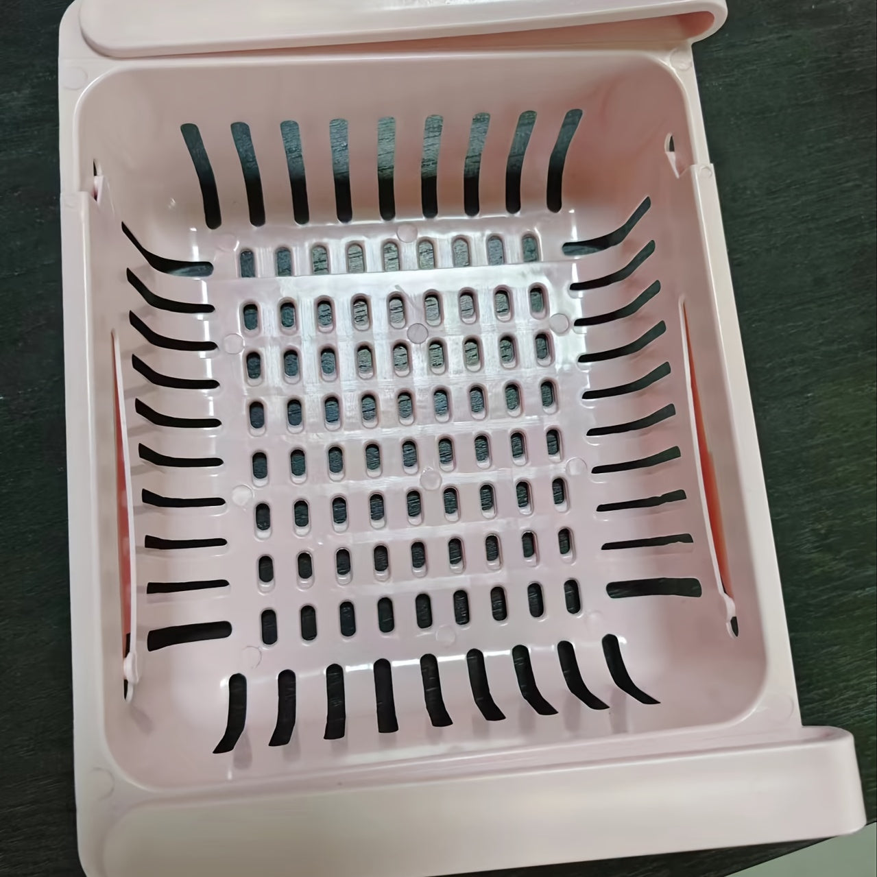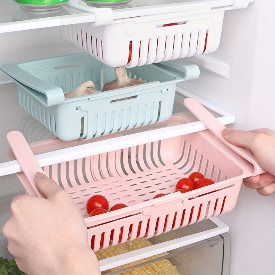 Moslashuvchan muzlatgich saqlash savati, oziq-ovqat uchun xavfsiz plastmassa, yangi mahsulotlar va muzlatgich uchun joyni tejovchi slayder dizayni, yengil ko'k, pushti, oq ranglarda