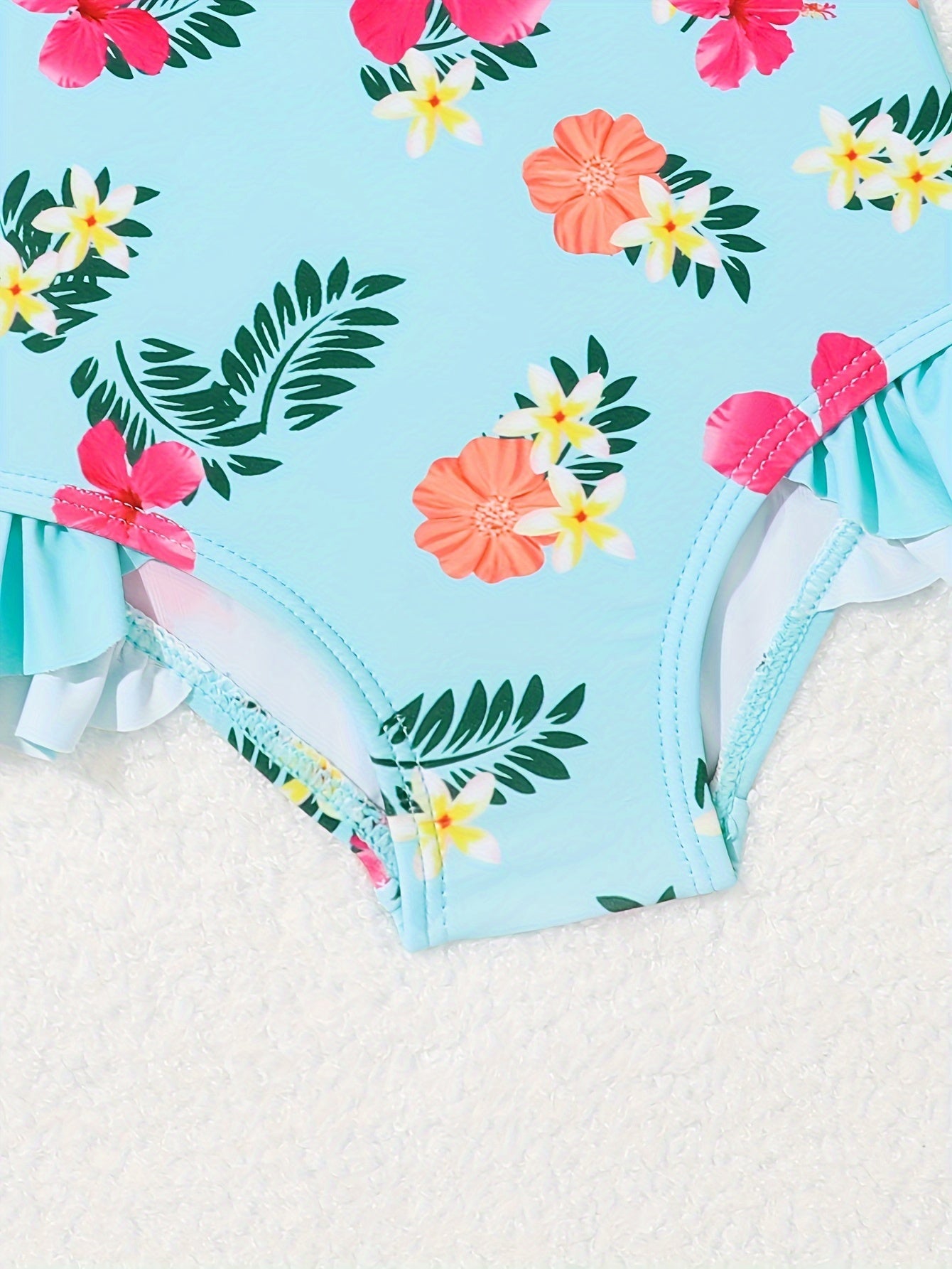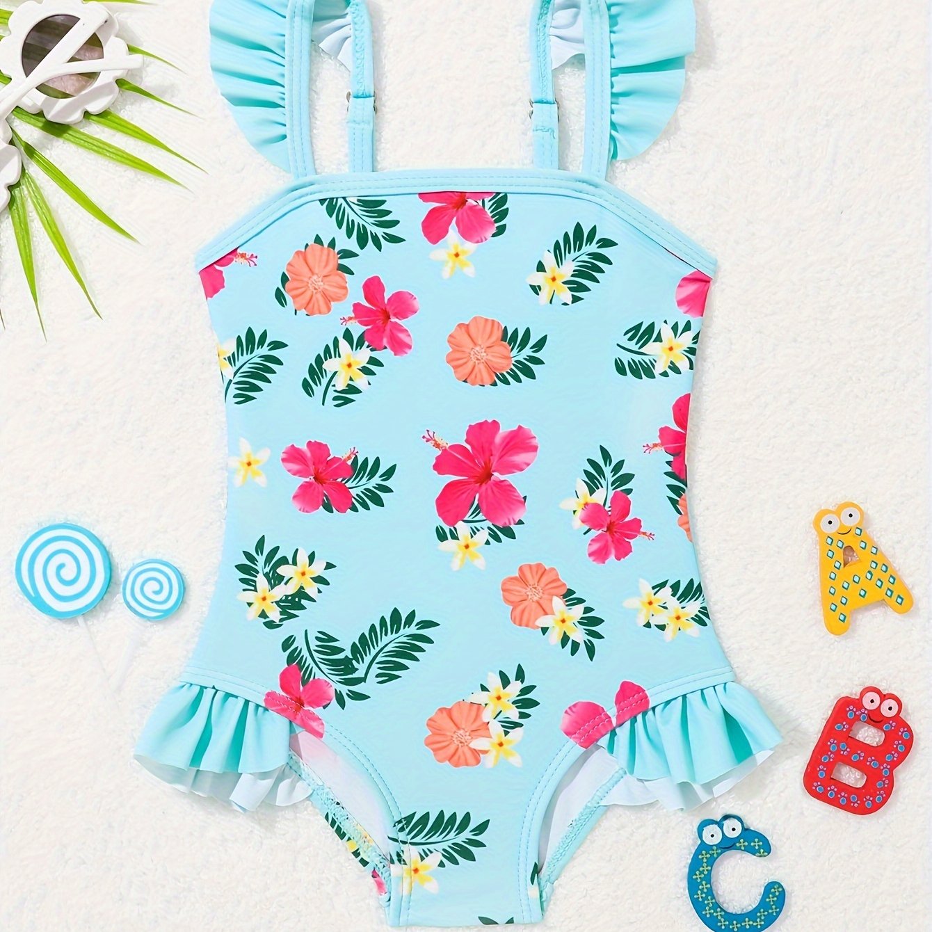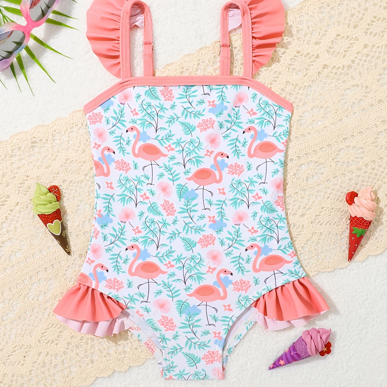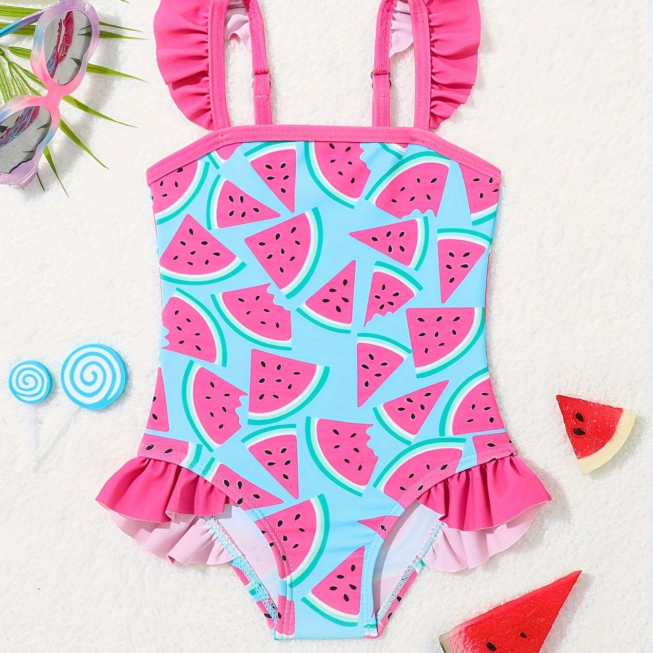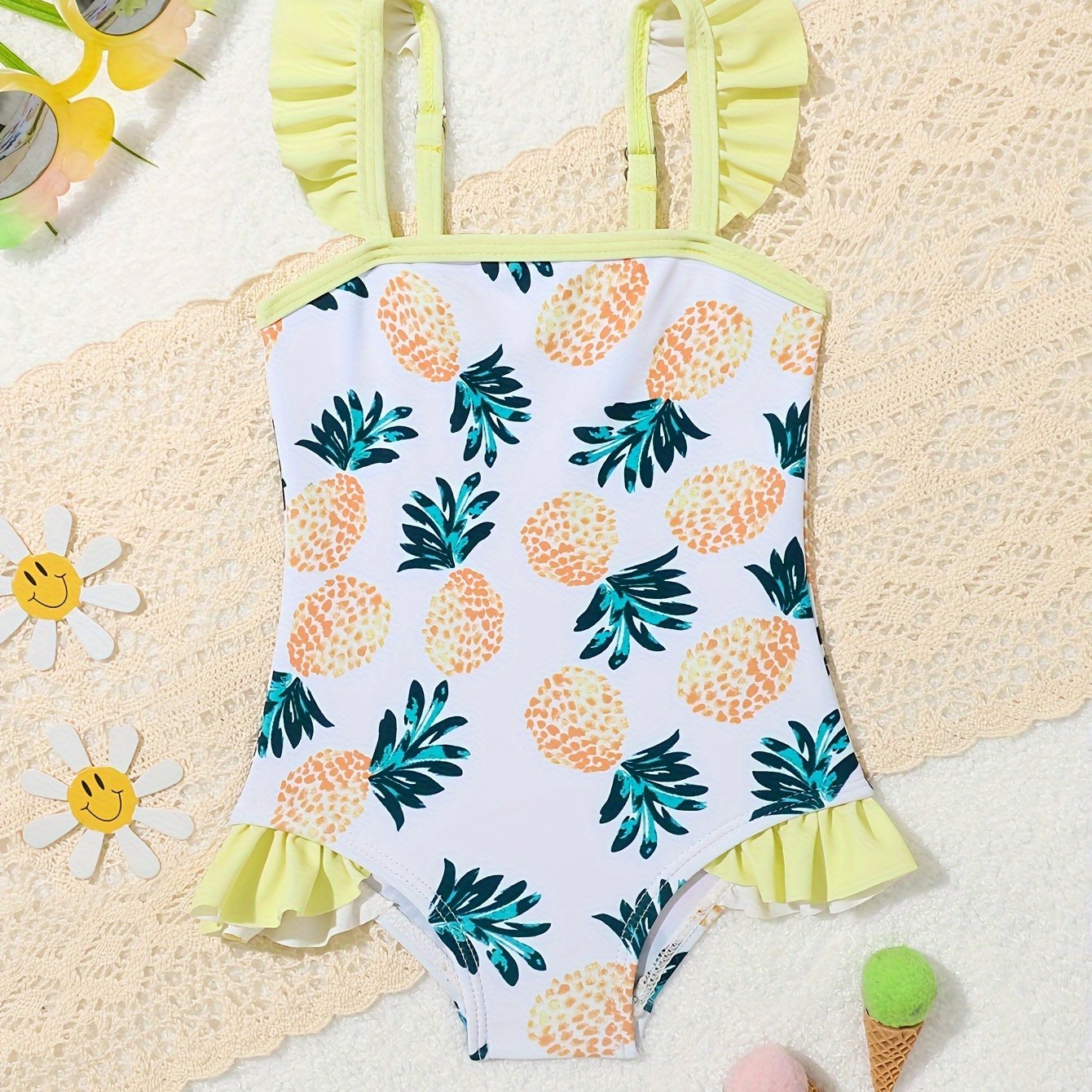 Qizlar uchun sevimli ananas naqshli bir qismli suzish kiyimi, tez quriydigan, cho'ziluvchan polyesterdan tayyorlangan, ruffle detali, bolalar uchun yelkasiz dizayn.