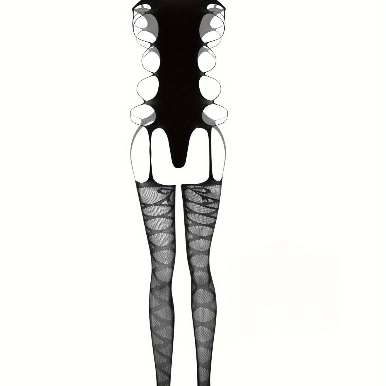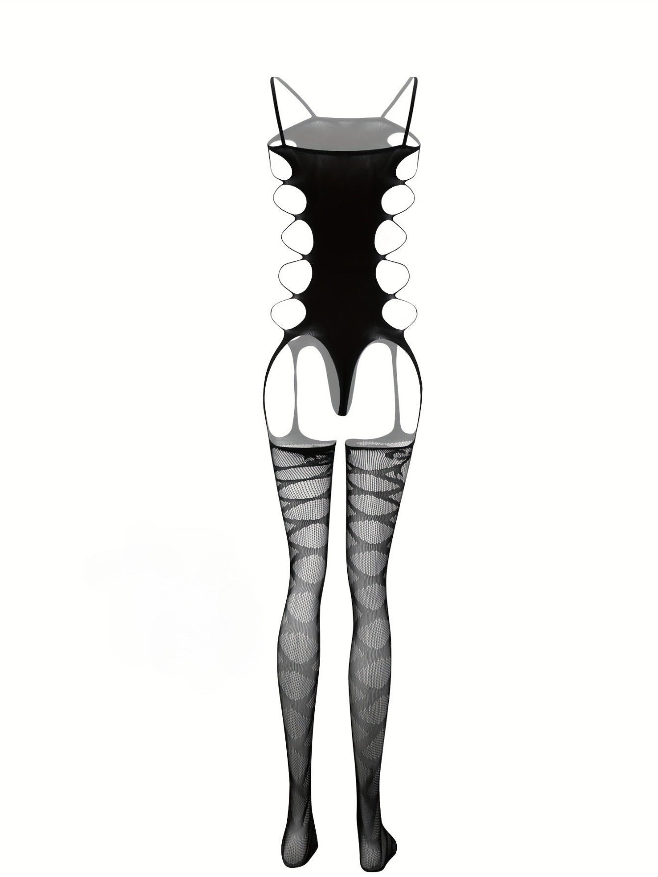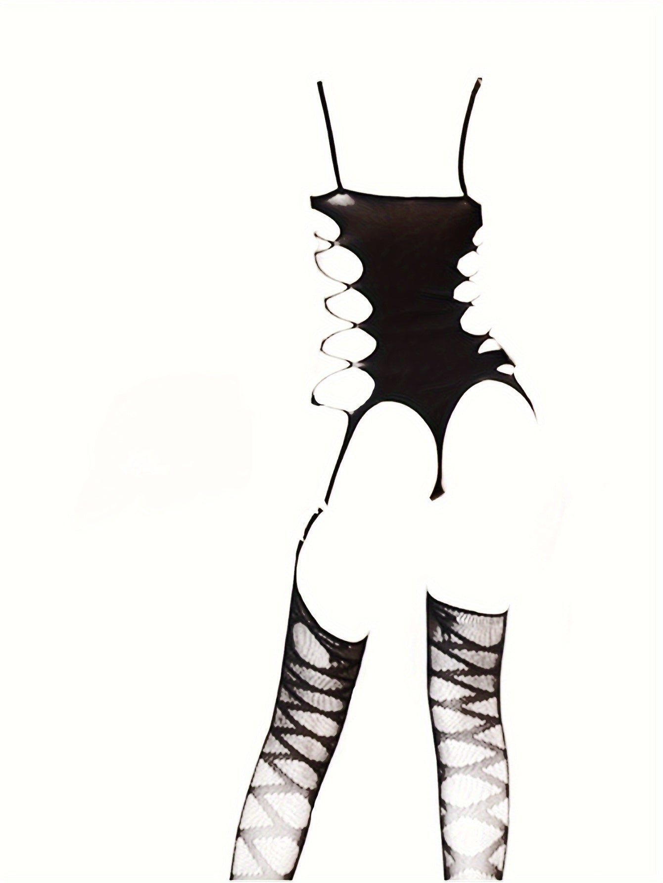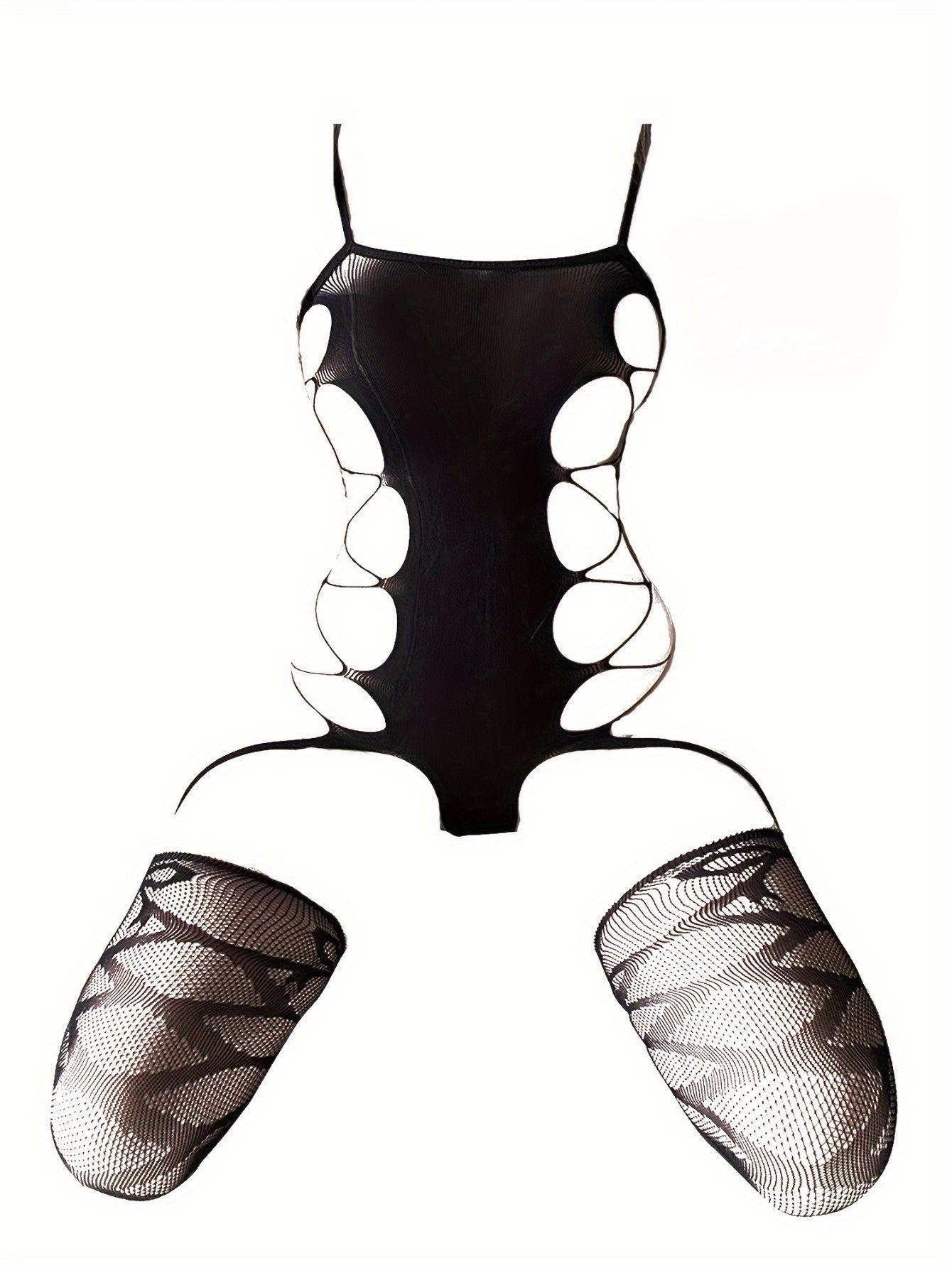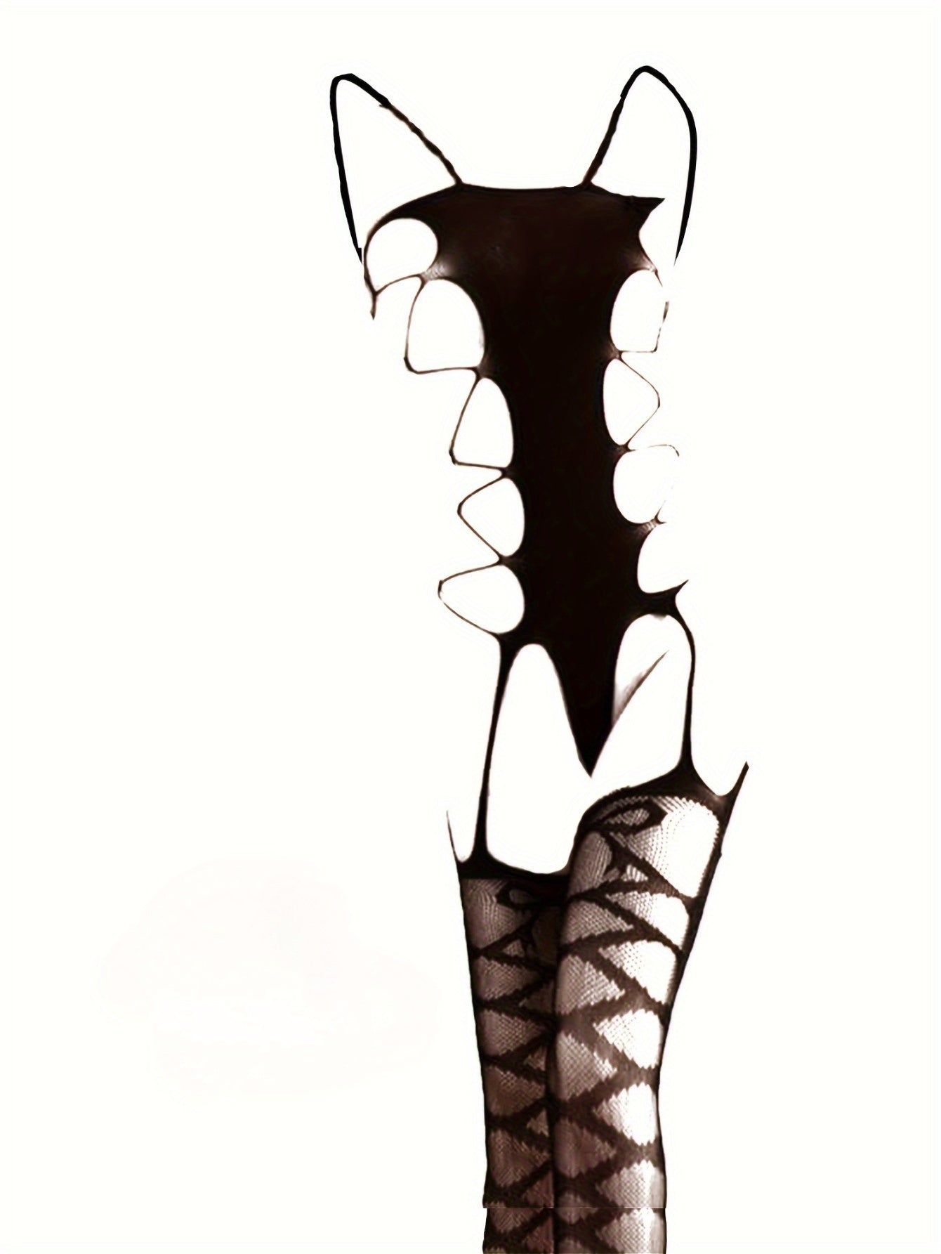 Kattalar uchun o'lchamdagi bodysuit, baliq tarmog'i legginslari va shaffof to'qimachilikda lenta bilan detallangan