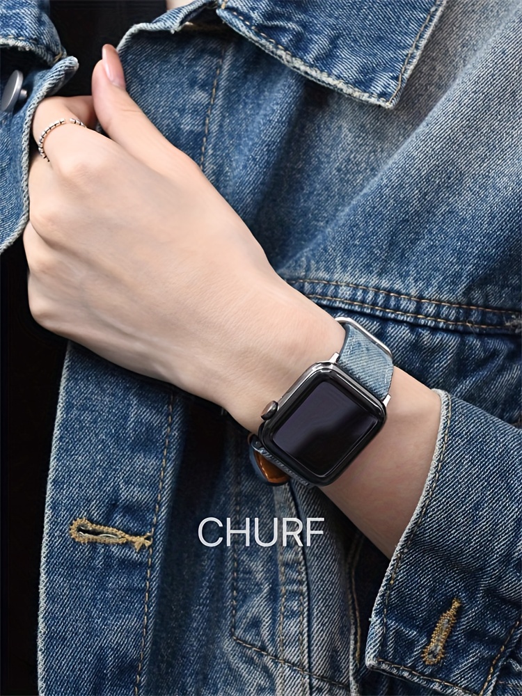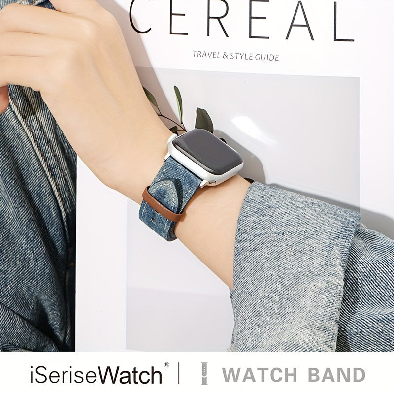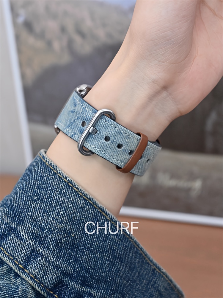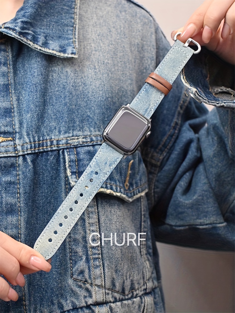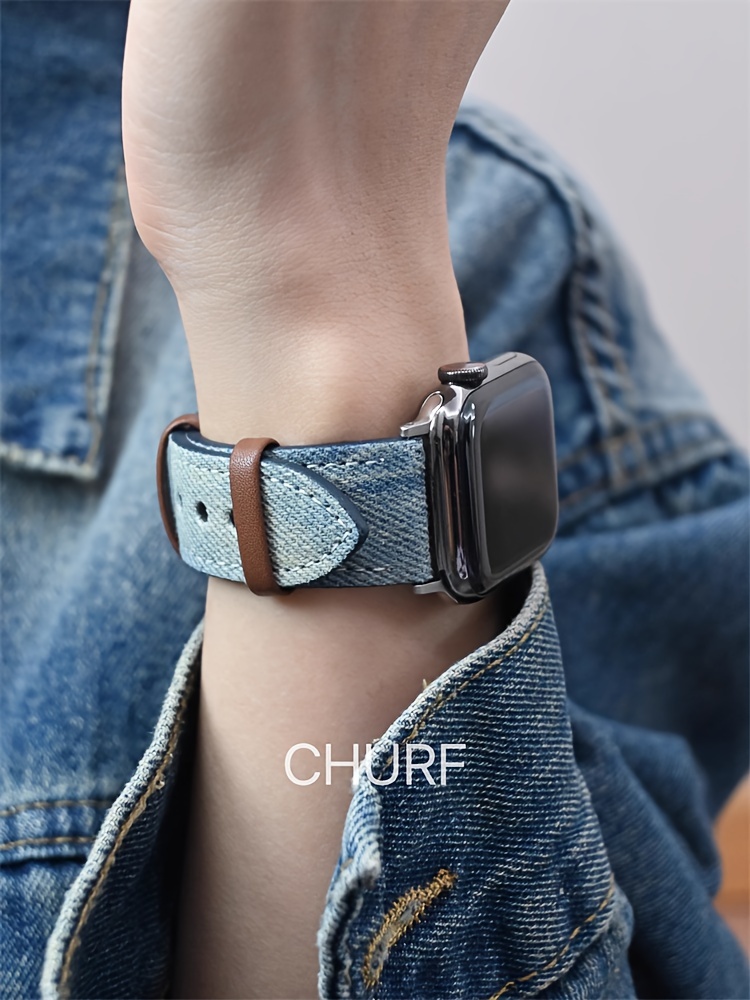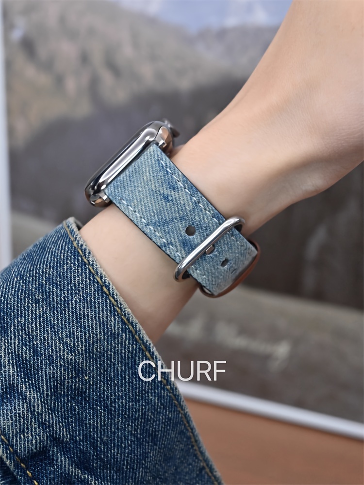 Denim va metalldan tayyorlangan Apple Watch tasmasi, kumush rangli qopqoq bilan, turli xil Apple Watch o'lchamlari va seriyalariga mos keladi, mustahkam va zamonaviy dizayn.