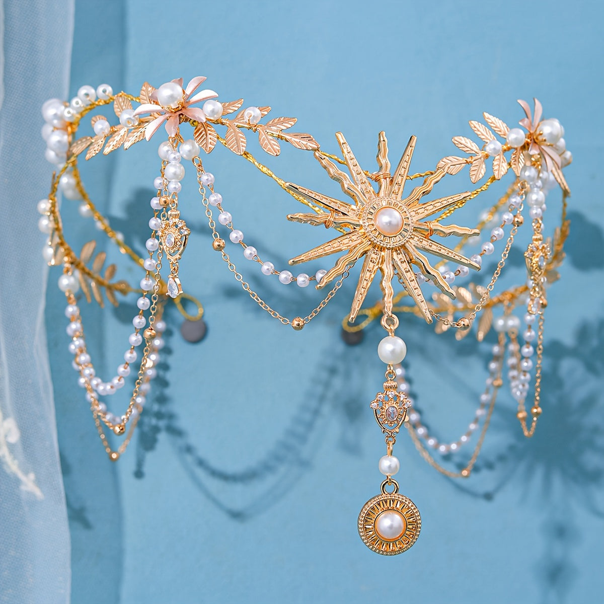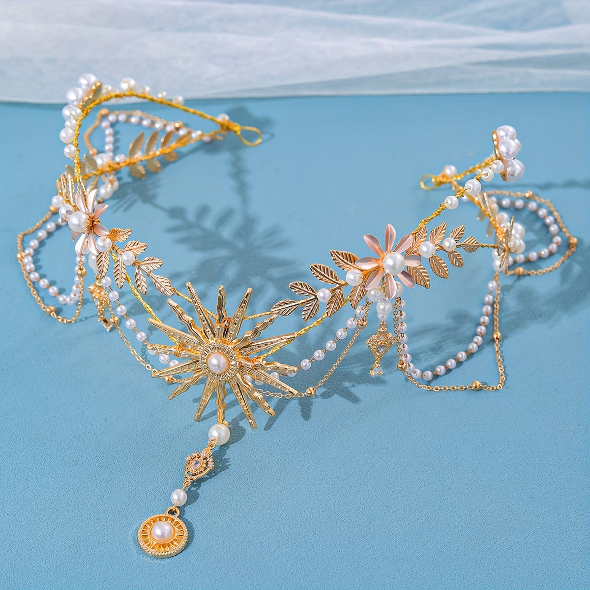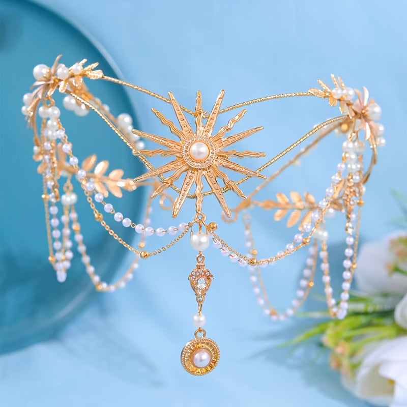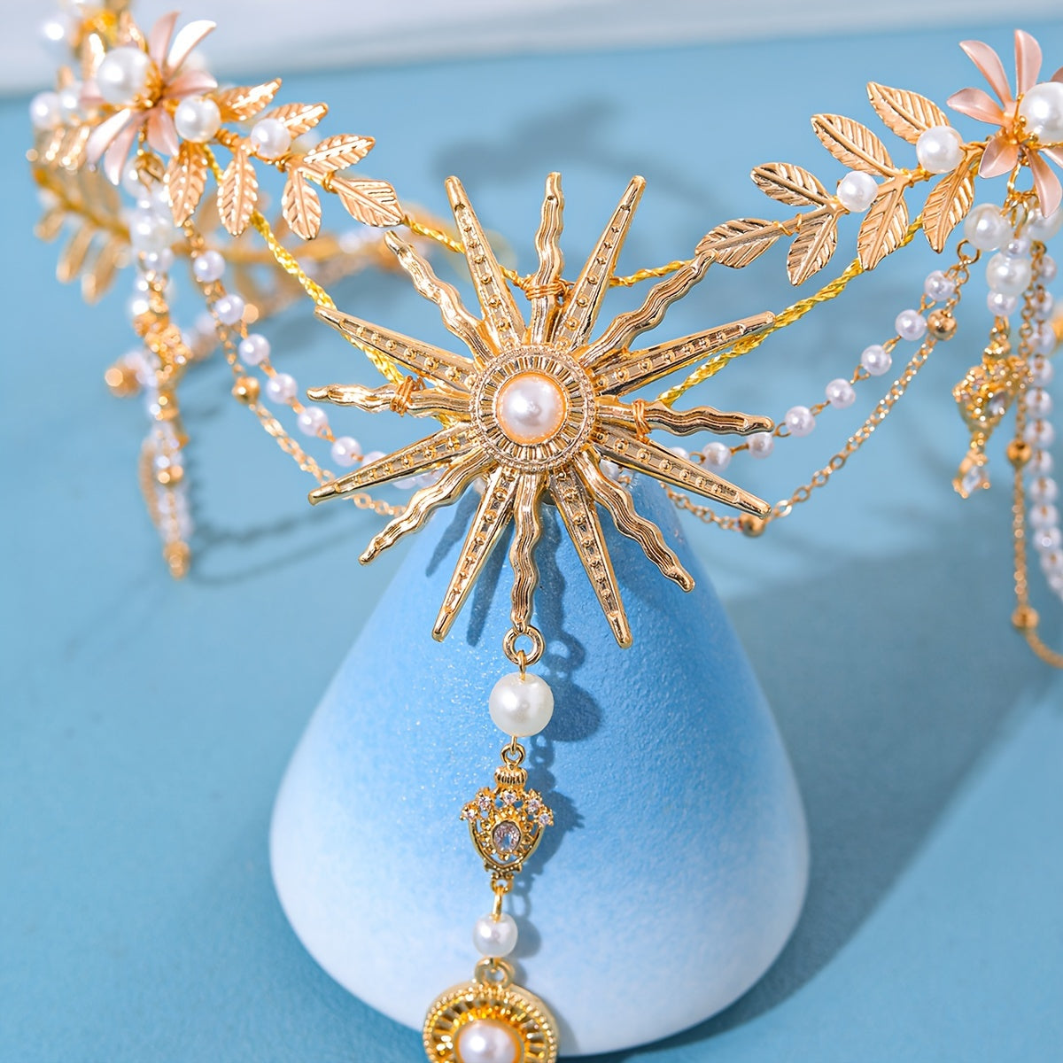 Qoʻlda tayyorlangan marjonli quyosh nuri bilan bezatilgan taqdirlar uchun quyosh gul va barg motivlari bilan taxt