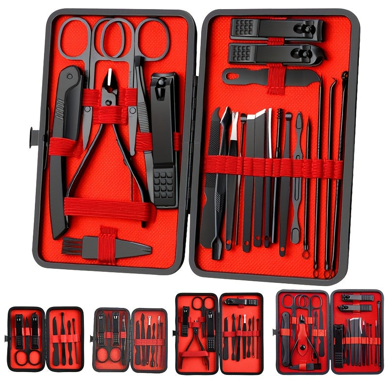Sayqallik va qizil zanglamaydigan po'latdan tayyorlangan tirnoq parvarishi to'plami, sayohat uchun charm qoplama bilan pedikюр va manikюр uchun