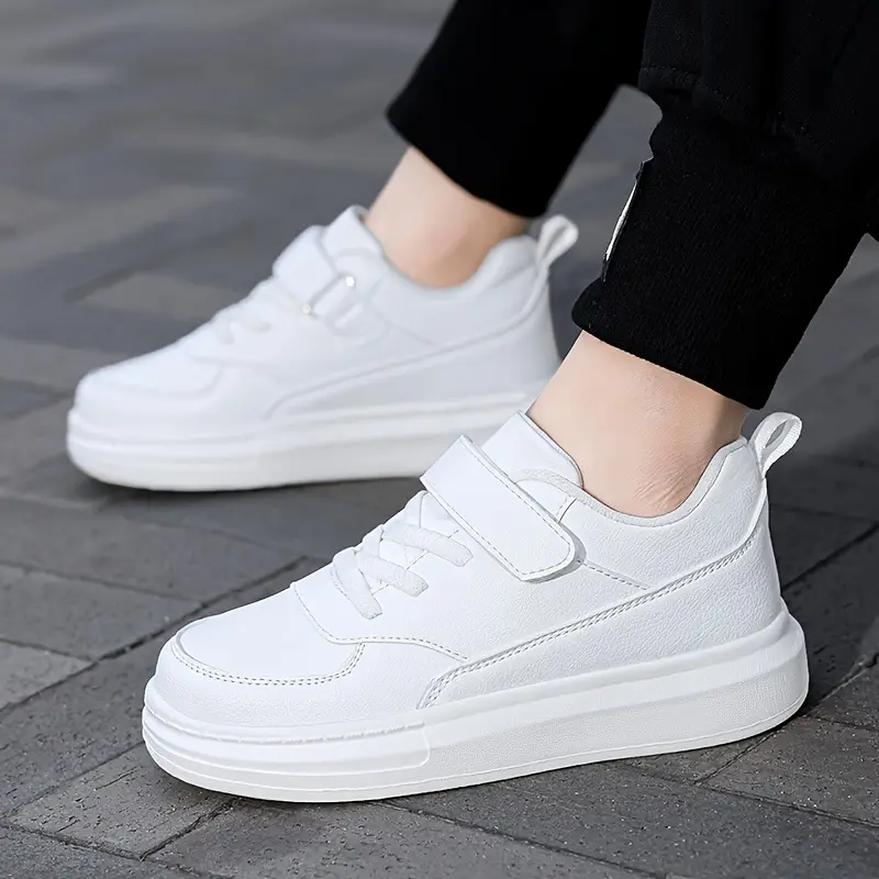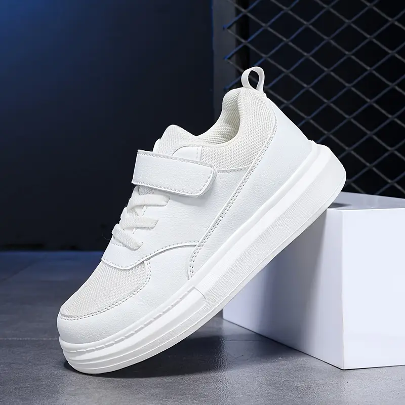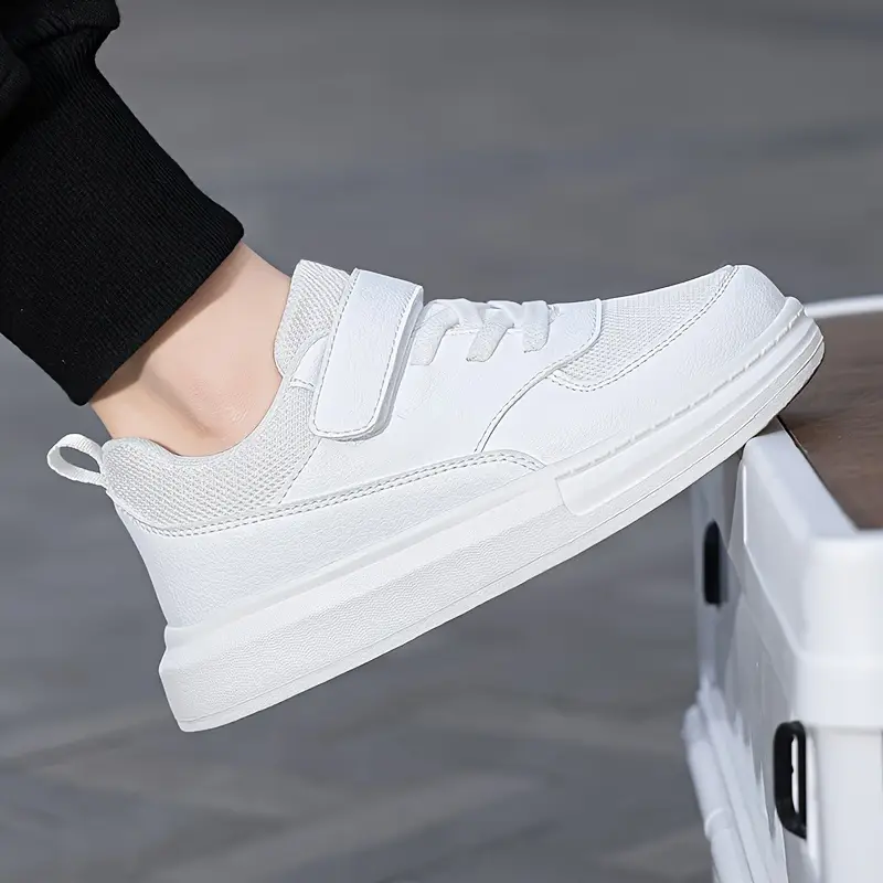 Bolalar uchun qora sport krossovkalari, yopishtiruvchi tasma va nafas oladigan to'r bilan. Har mavsum uchun ajoyib.