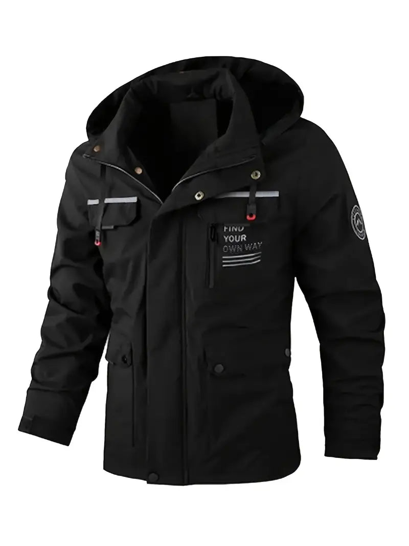 Qora erkaklar uchun shamol o'tkazmaydigan, suv o'tkazmaydigan jakk, logotip dizayni, bir nechta cho'ntaklar va qulay polyester mato bilan. Velosipedda, yugurishda va tasodifiy kiyim uchun mos. Shuningdek, plus o'lchamda ham mavjud.