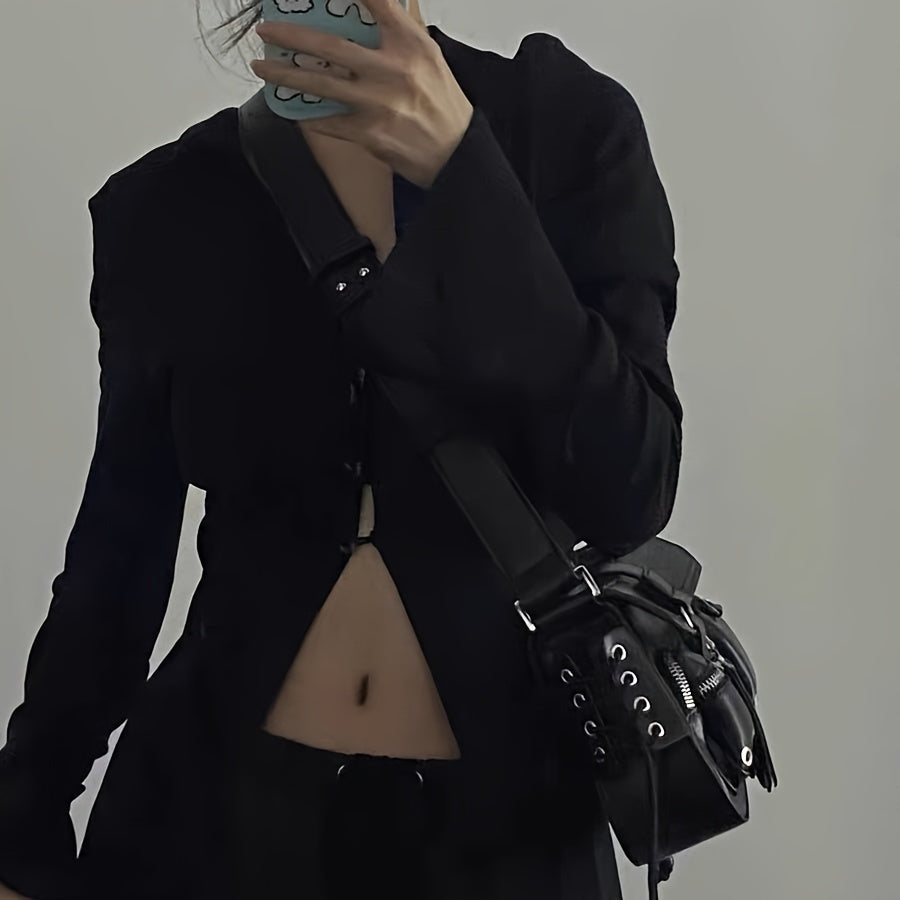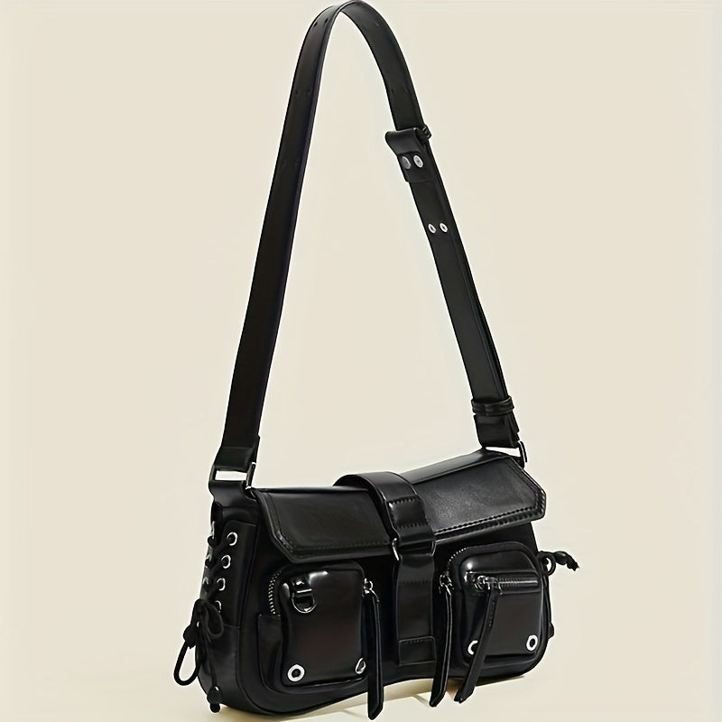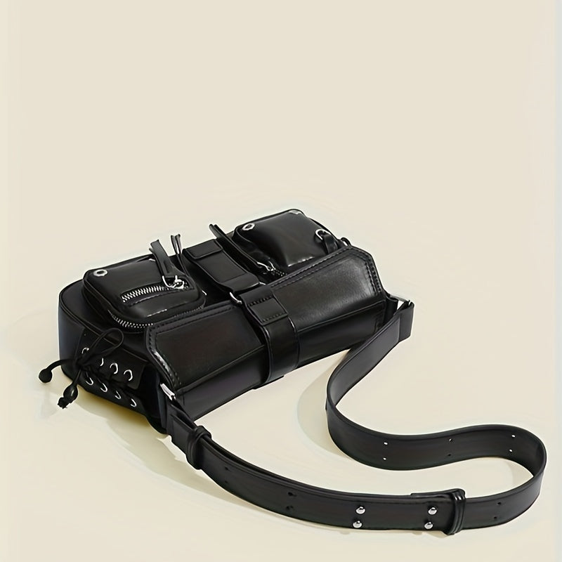 Qora punk uslubidagi ayollar uchun ko'p cho'ntakli va sozlanadigan kamarli sumka - tasodifiy yoki ko'chada kiyish uchun mo'ljallangan, sayohat uchun ideal.