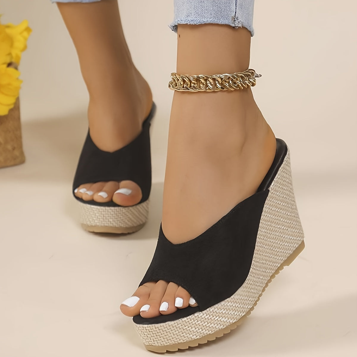 Ayollar uchun qora slip-on wedge sandallar, ochiq barmoq, baland tovon, qulay bilak tasmasi va to'qilgan dizaynli taglik - tasodifiy yozgi kiyimlar uchun mukammal.