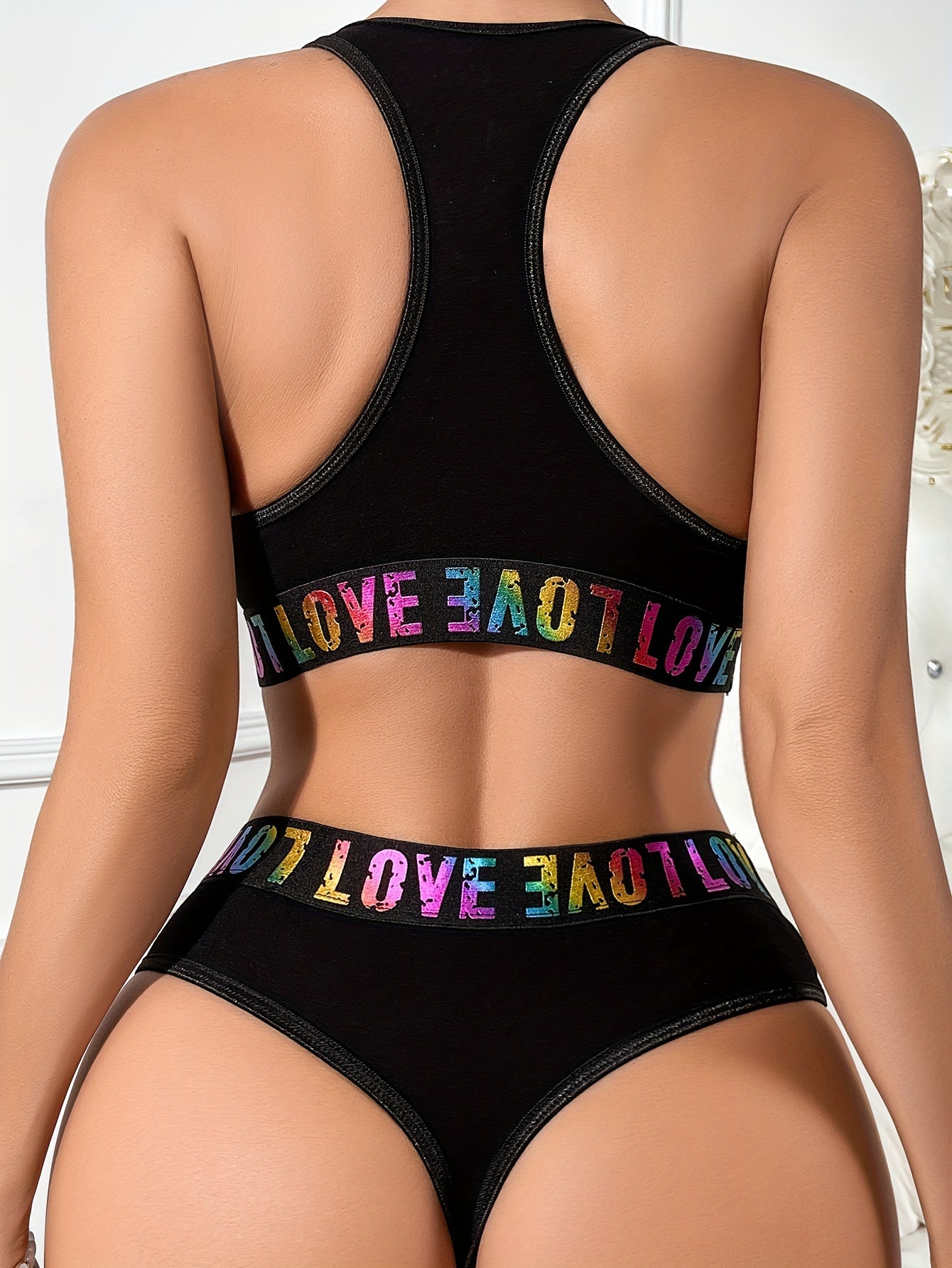 Qora sport bra va past belli ichki kiyimlar to'plami "Men Sevaman" yozuvi bilan yurak detallari bilan paxta ichki kiyimlari